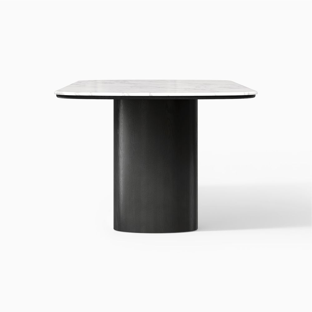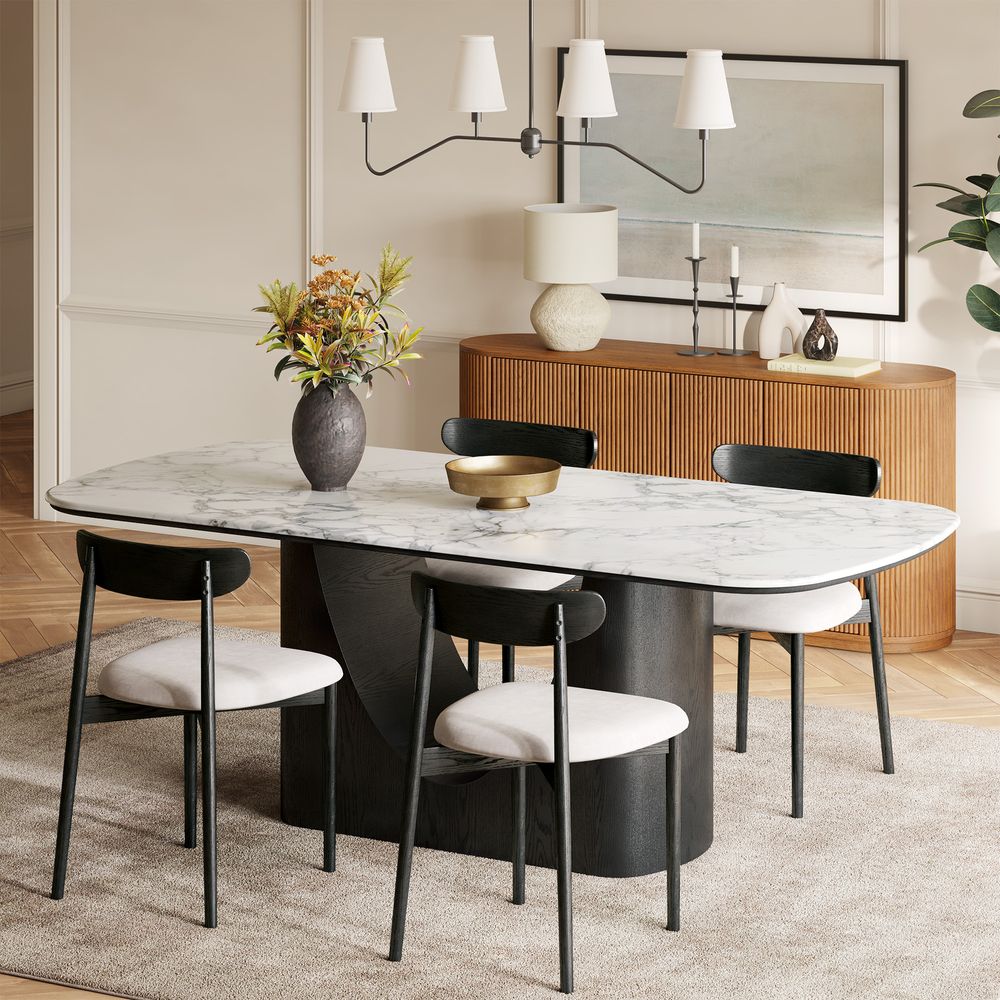 Arcen leans into the quiet drama of clean lines and an architectural arched curve at the center of the base, giving the overall design a sense of openness and breathing room. A snow white engineered stone surface with flowing veining rests atop, lending the piece a bold statement and an artful presence—captivating, yet not overpowering.