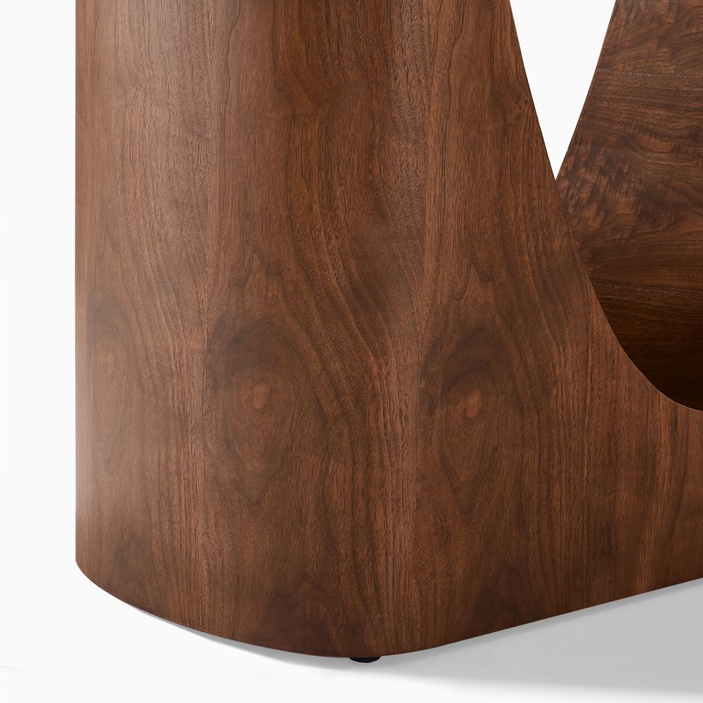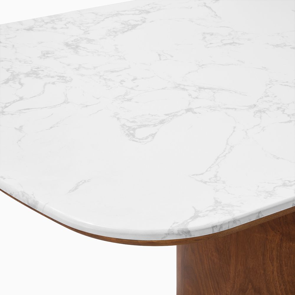 Arcen leans into the quiet drama of clean lines and an architectural arched curve at the center of the base, giving the overall design a sense of openness and breathing room. A snow white engineered stone surface with flowing veining rests atop, lending the piece a bold statement and an artful presence—captivating, yet not overpowering.