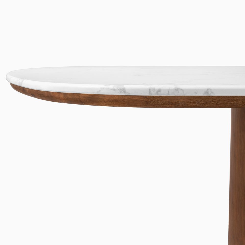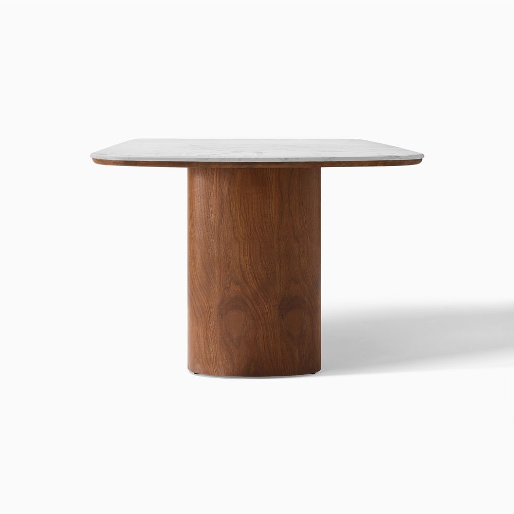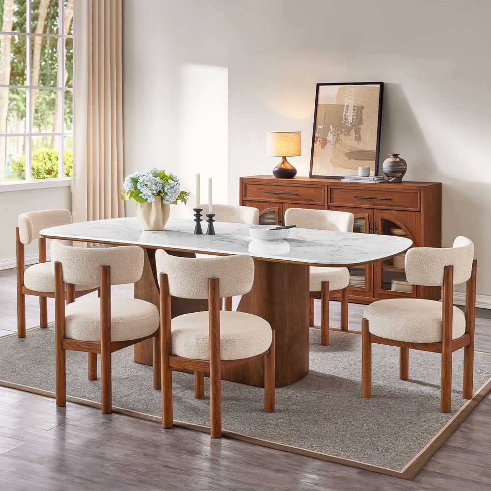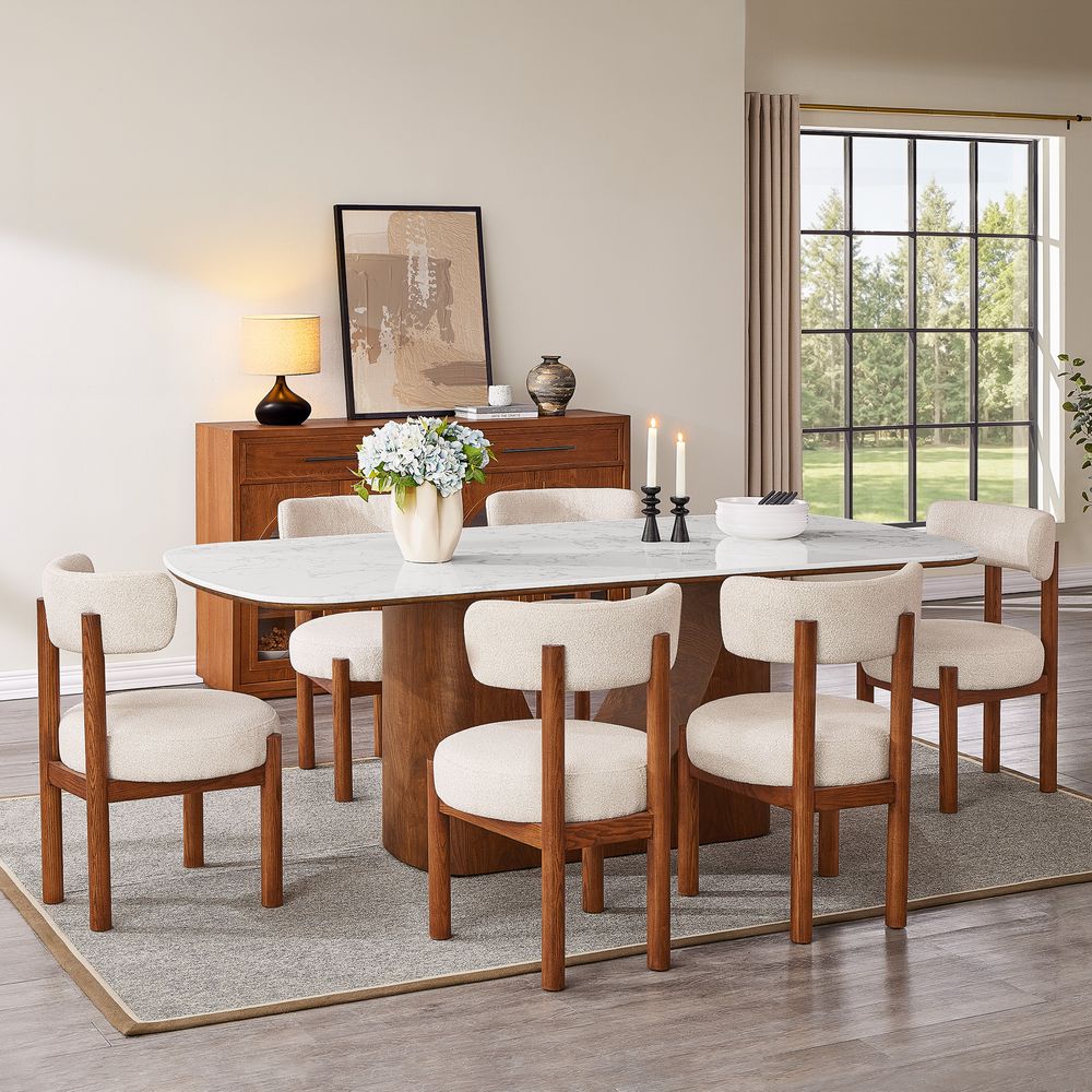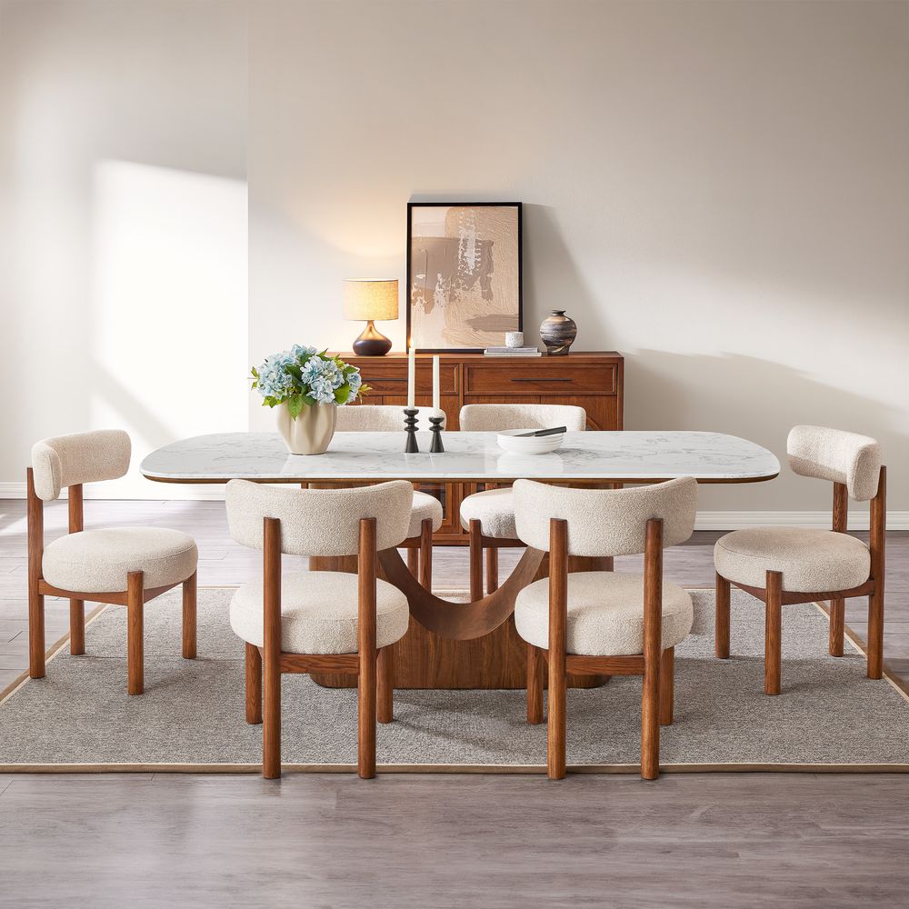 Crafted of engineered stone, plywood and engineered wood with American oak veneer.Tabletop is honed and sealed for a satin finish with deep veining and natural color contrasts.Finish is achieved through multistep process in which wood is wire brushed to highlight its rich grain.Wood glazing adds visual interest with greater depth and layering and enhances coloring.Rounded corners soften the rustic rectangular top.84" table comfortably seats 6-8.Color perception may vary due to wood characteristics, lighting, and devices. Wood grain variation is expected, as each is unique.Variation in the veining of stone is to be expected, as each piece will be unique.