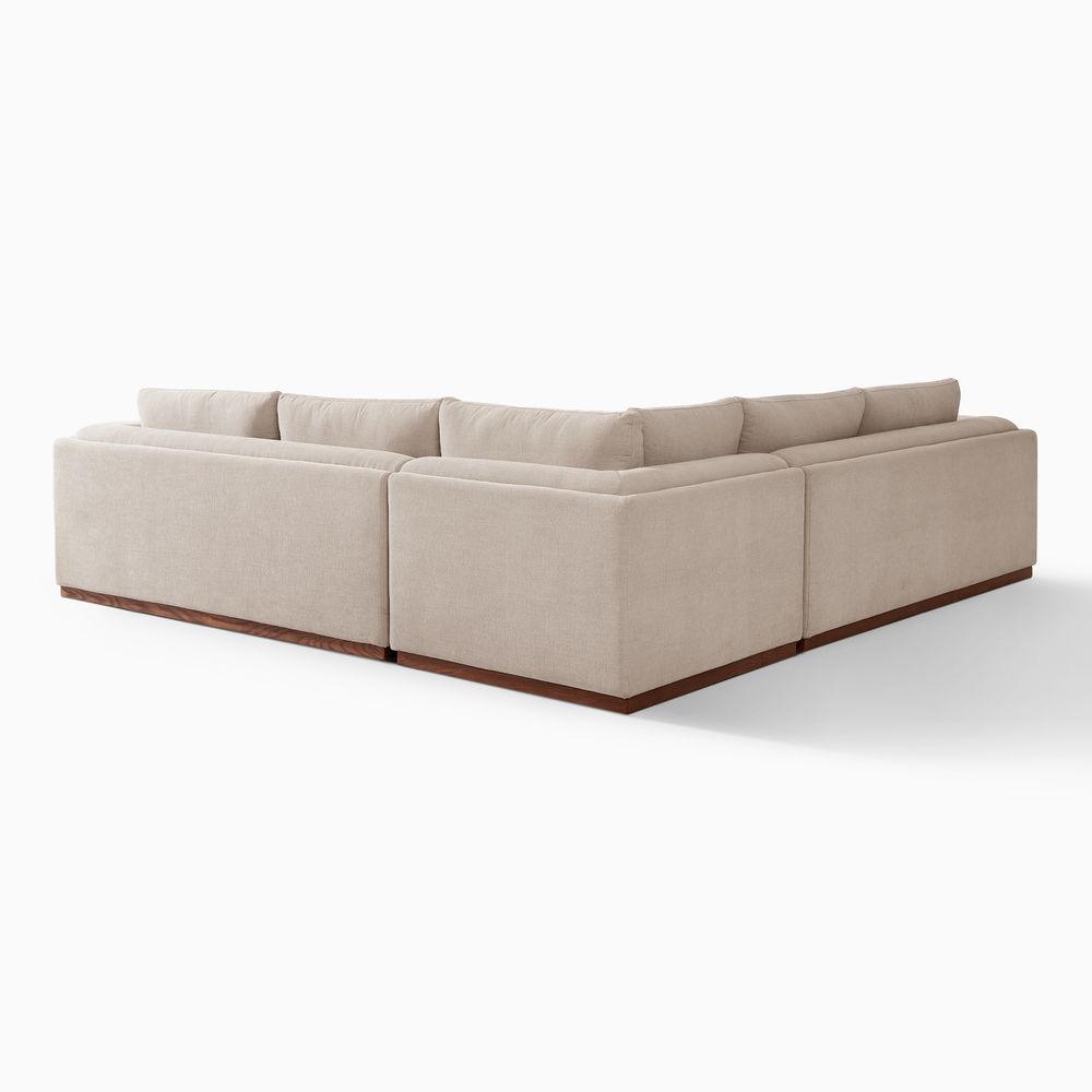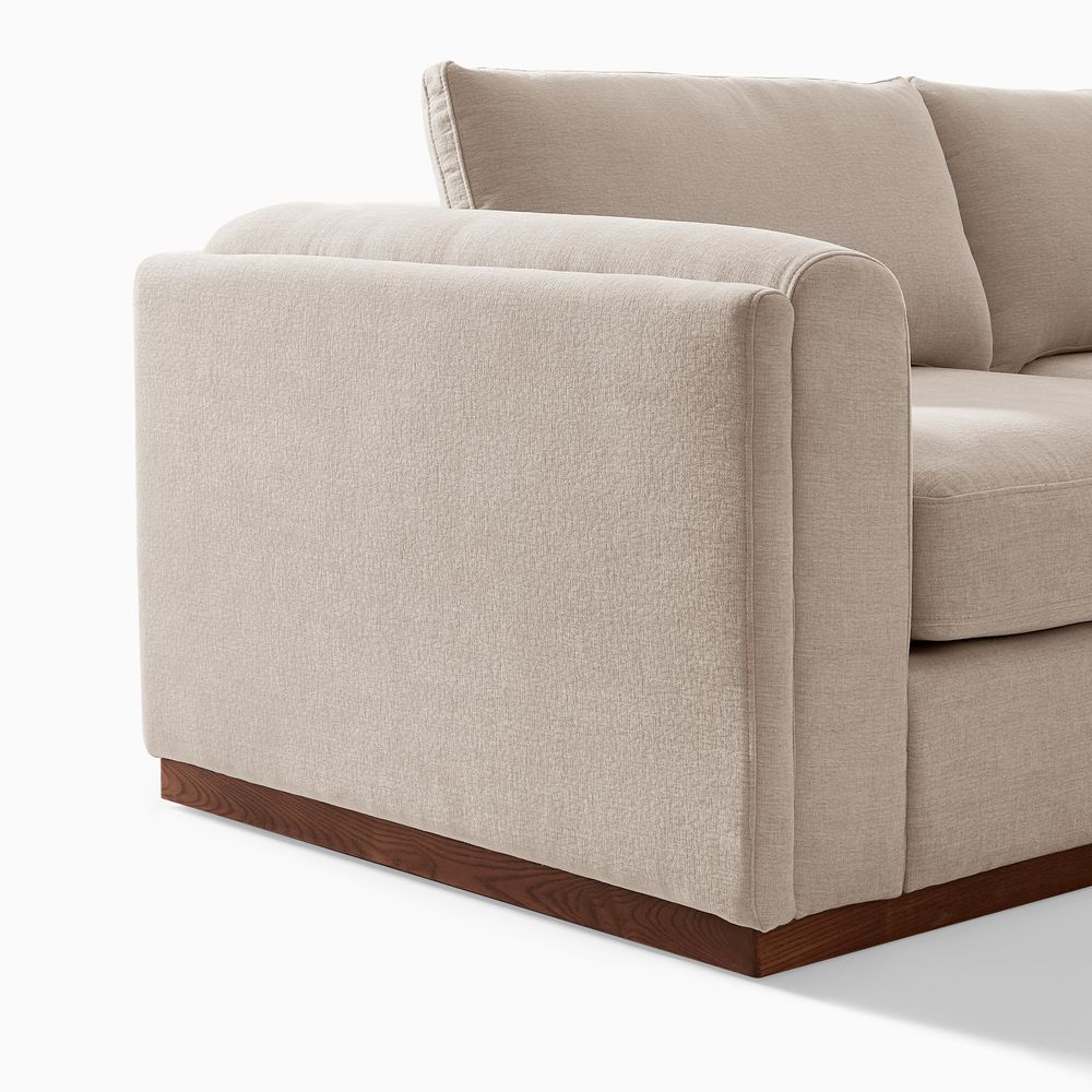 Arden secctional sofa features deep seating, wide armrests, and a layered cushioning design that elevates lounging comfort. Its simple silhouette makes it versatile across different living room styles, while refined details in its lines and materials add subtle sophistication. The armrests feature a double-layered cushion design, creating dimension from multiple angles and reinforcing a sense of stability. A floor-reaching plinth base in solid ash wood balances the piece’s chunkiness and adds a warm wooden touch.