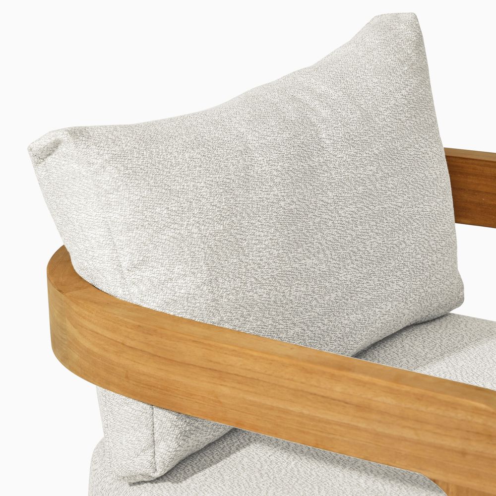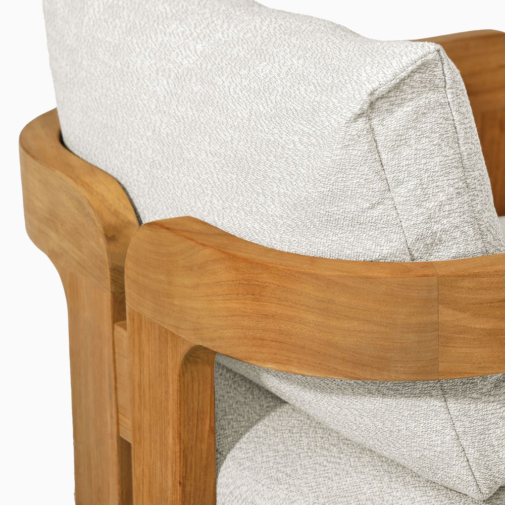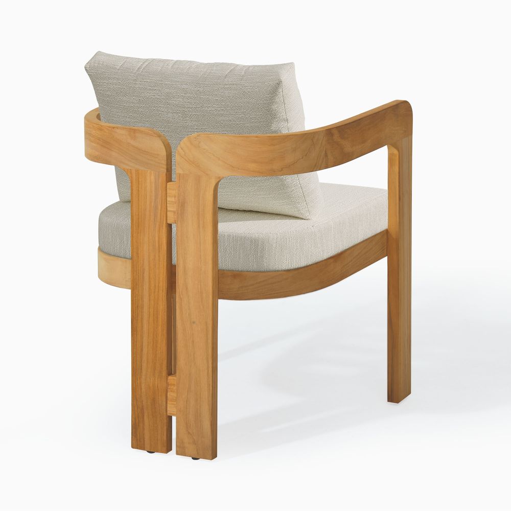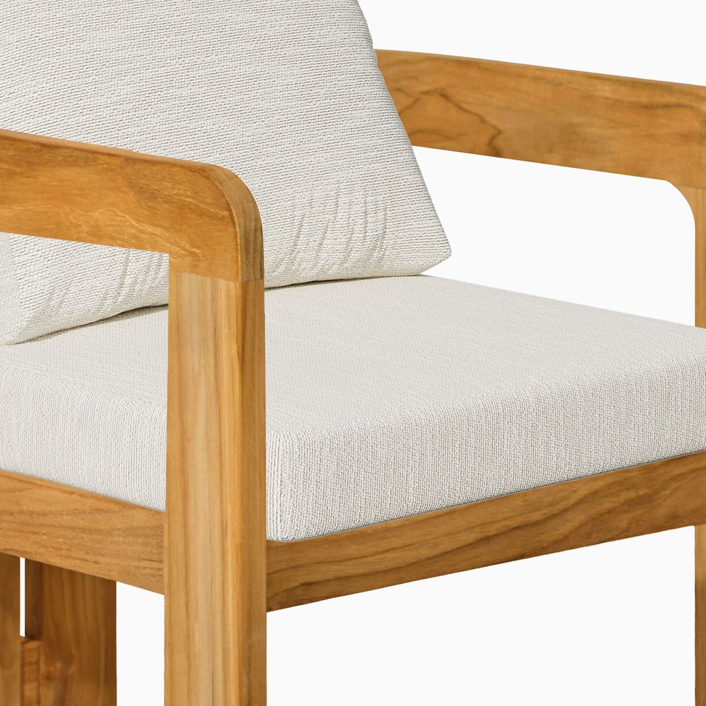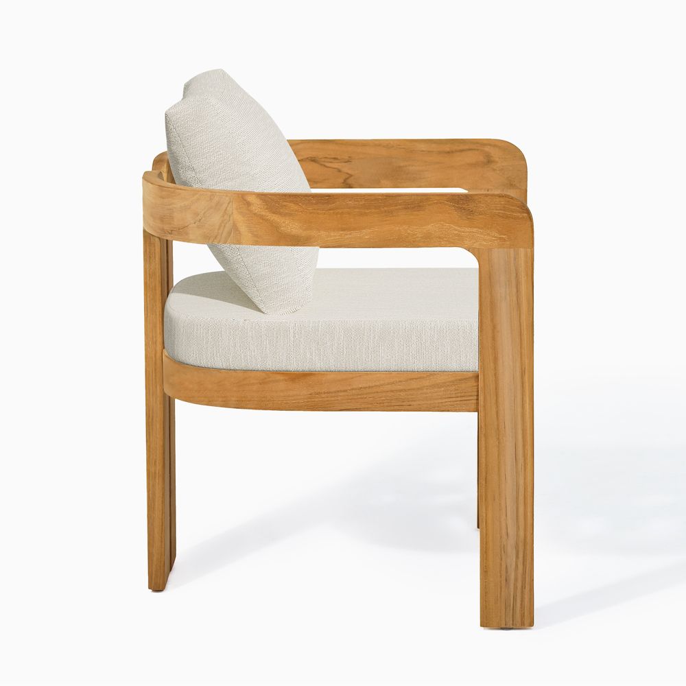 The solid wood frame features a tripod structure, where two softly curved, porch-shaped frames are bridged by solid beams, creating a design that feels poised in form yet nimble in style. Crafted from FSC-certified teak wood, each piece is made to last over time, naturally developing richer tones and a unique patina through everyday use.