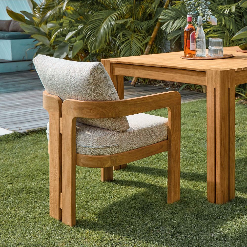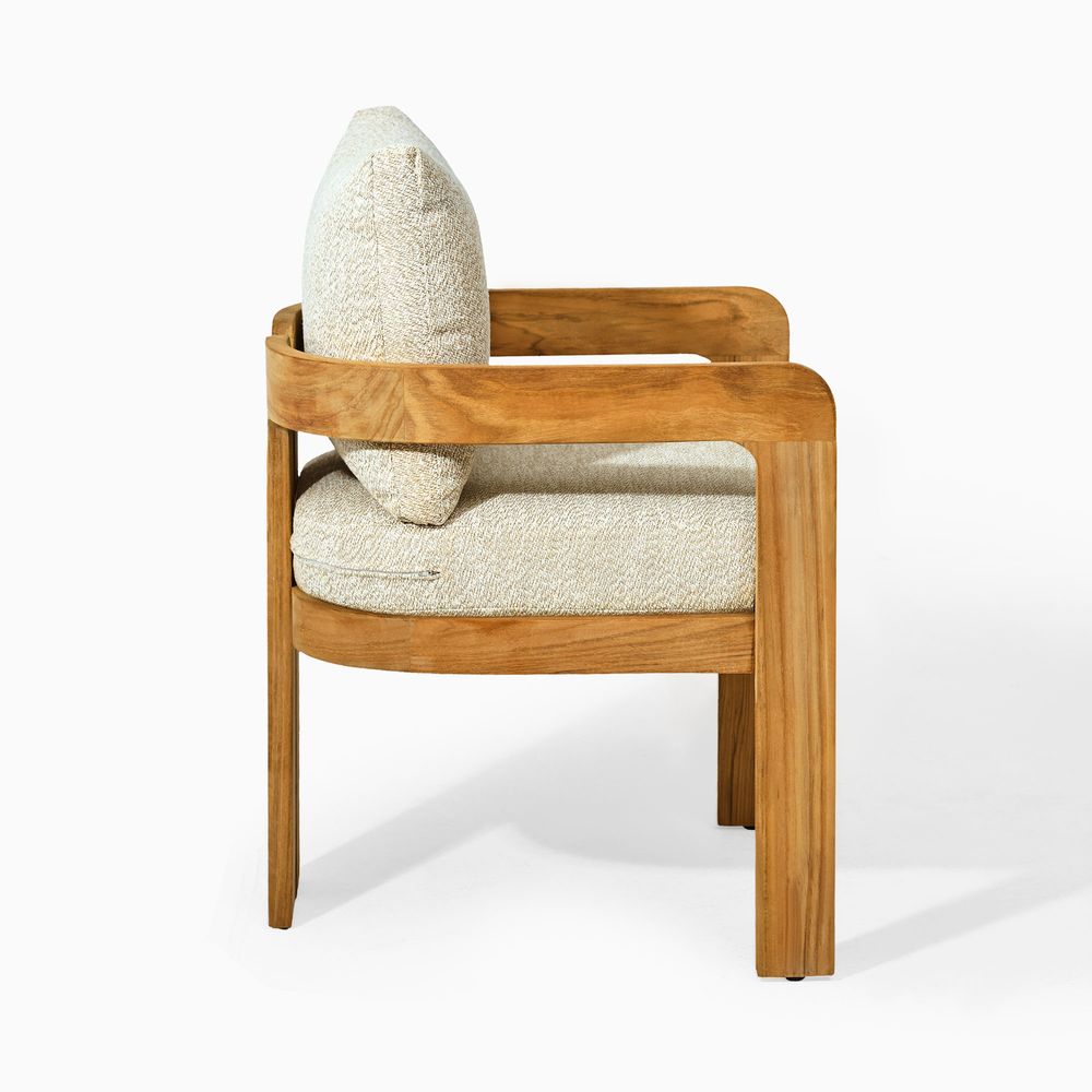 The solid wood frame features a tripod structure, where two softly curved, porch-shaped frames are bridged by solid beams, creating a design that feels poised in form yet nimble in style. Crafted from FSC-certified teak wood, each piece is made to last over time, naturally developing richer tones and a unique patina through everyday use.