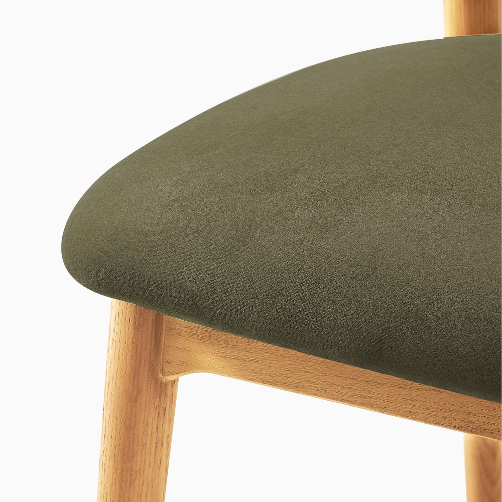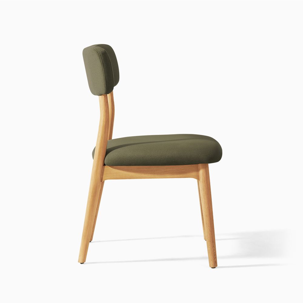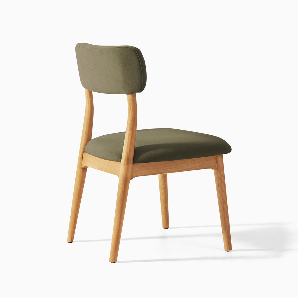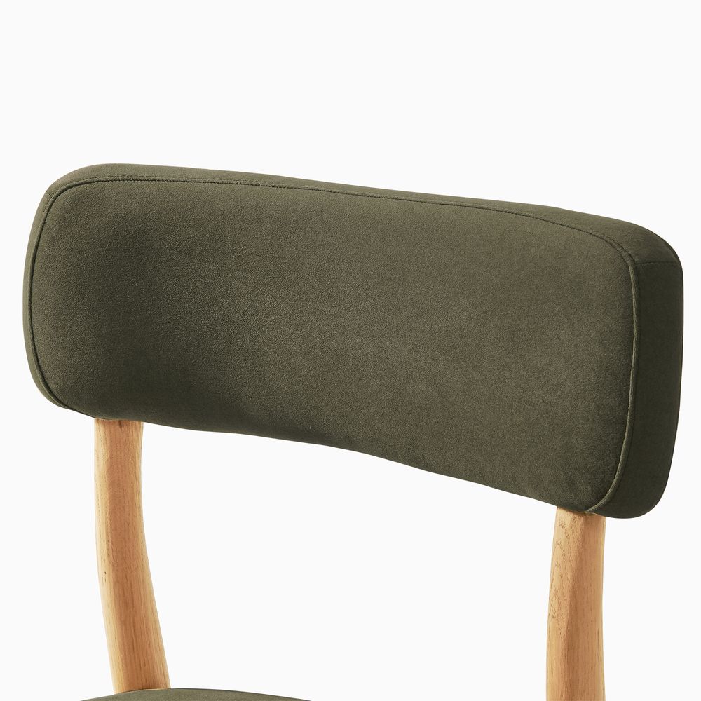 Arlo brings a soft, rounded sensibility to the space. Tapered, gently rounded legs create an airy, approachable presence, while the angled back legs pair with a curved, wingback-style upholstered backrest to provide comfortable, supportive seating. Balancing simplicity with mellow details, the chair feels both inviting and effortlessly refined.