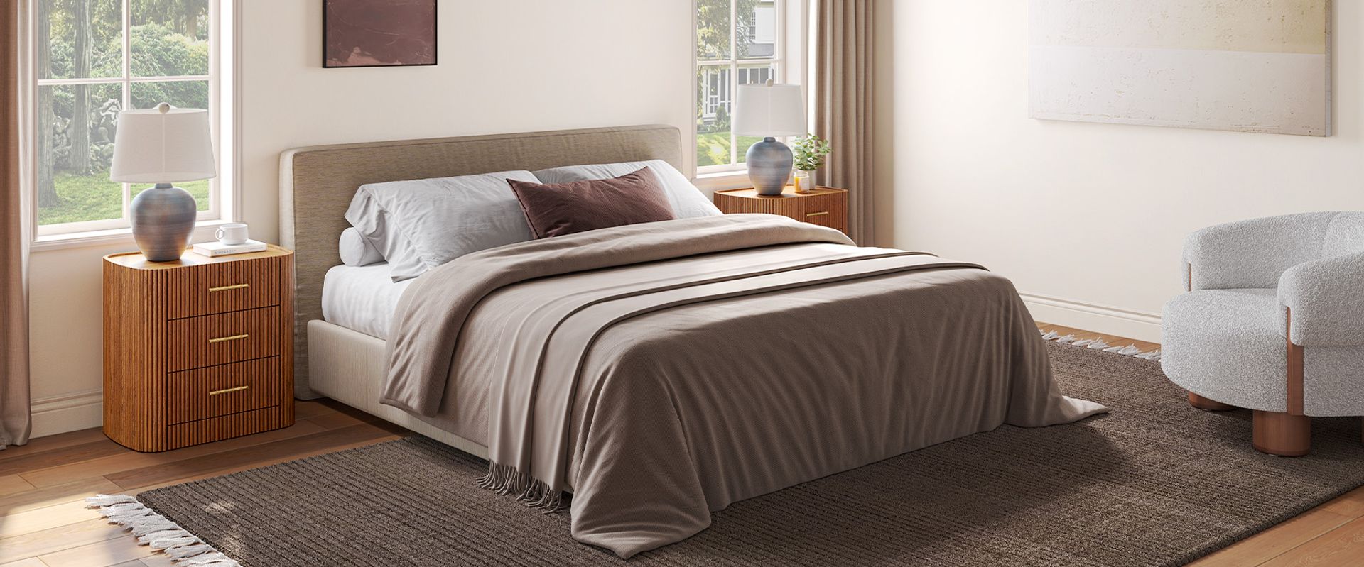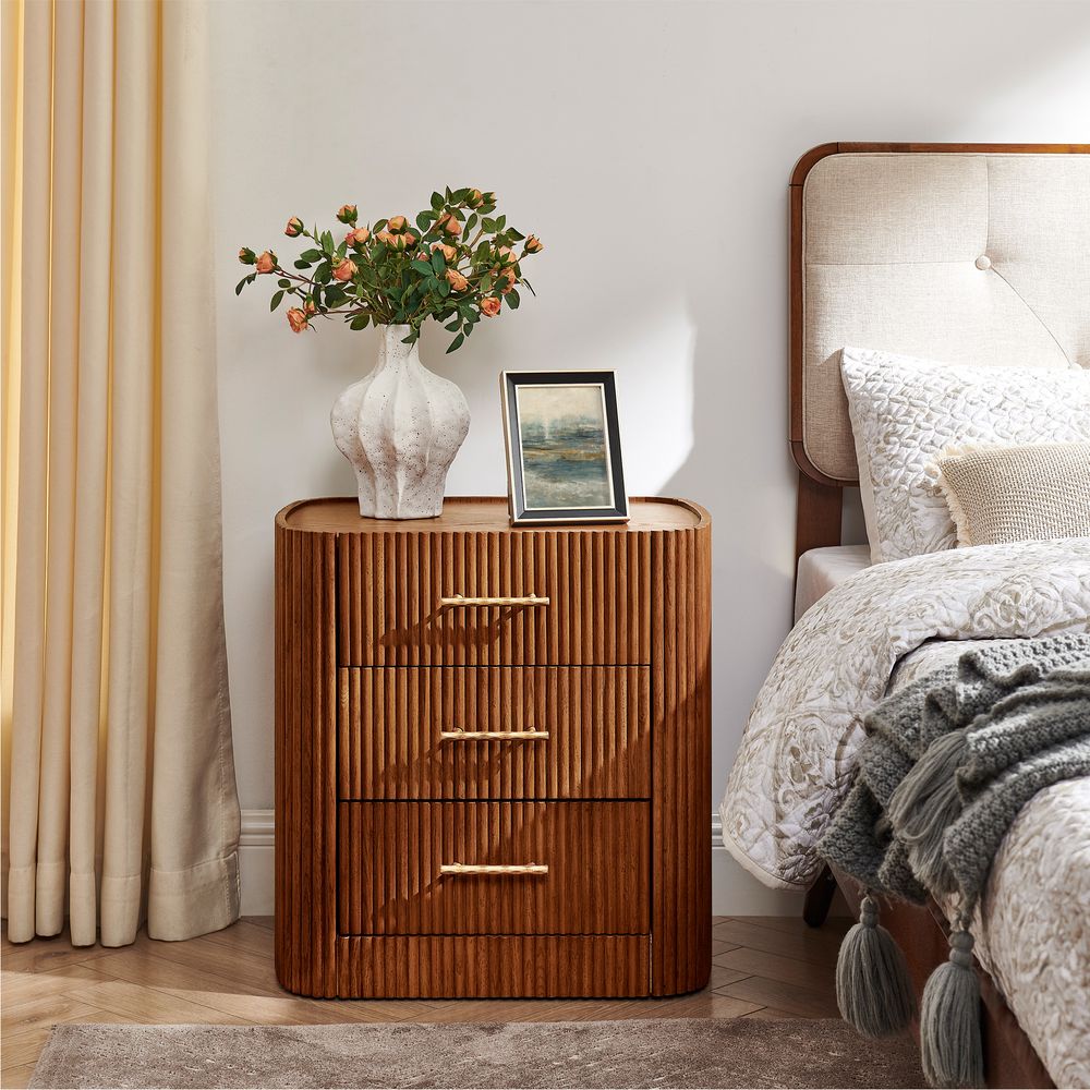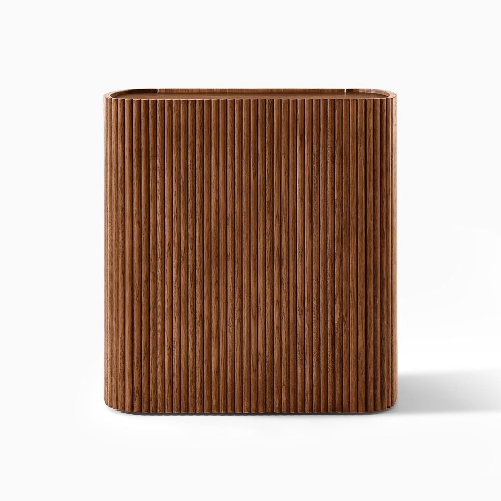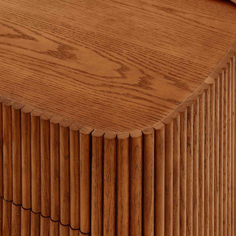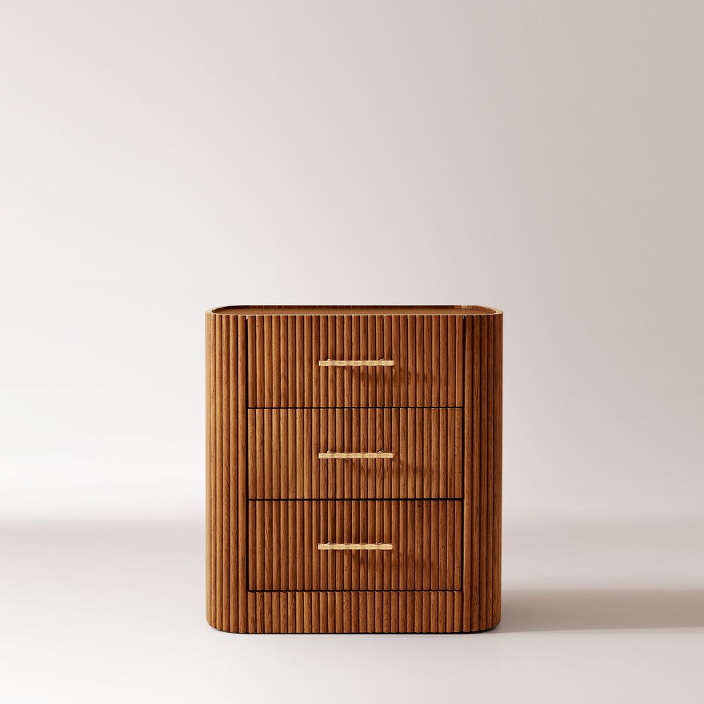 Crafted with softly rounded edges and solid oak strips, the Astor nightstand brings together warmth and modern design. Its smooth, sculpted form highlights the rich oak grain and natural tones, while the gold metal handles add a refined accent that complements the design with understated elegance.