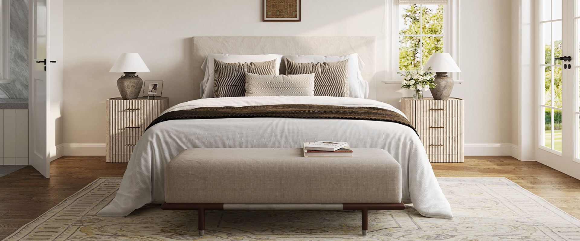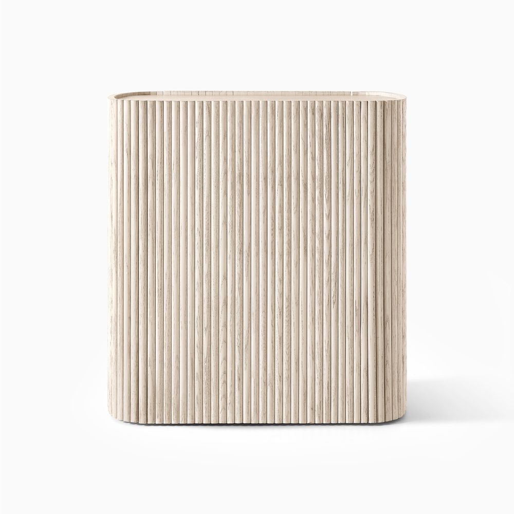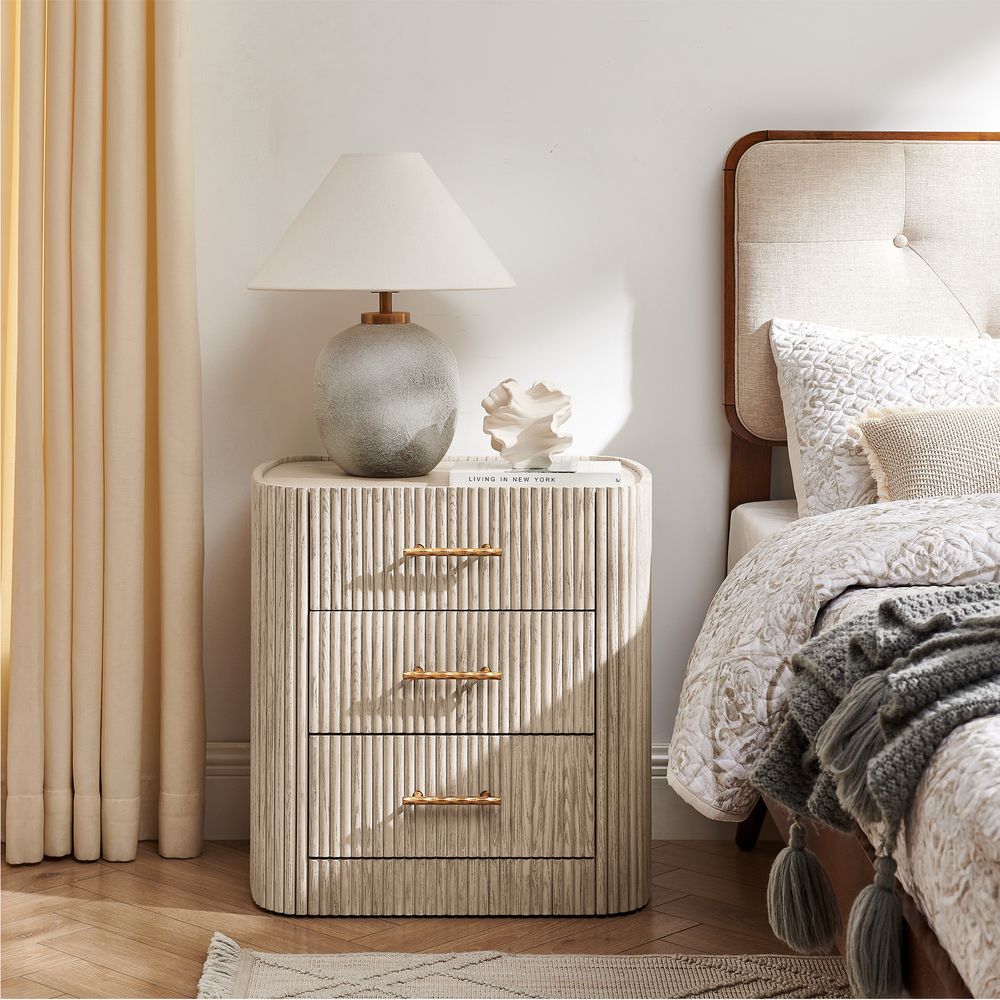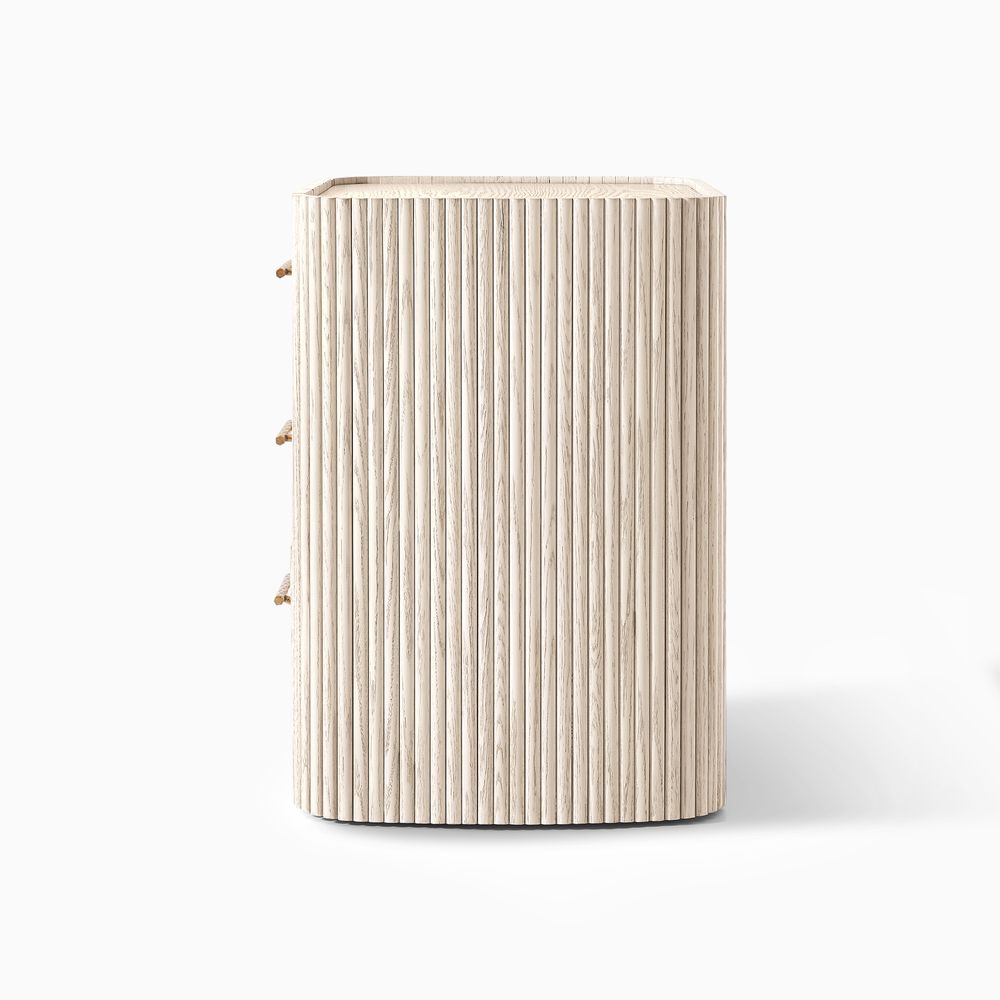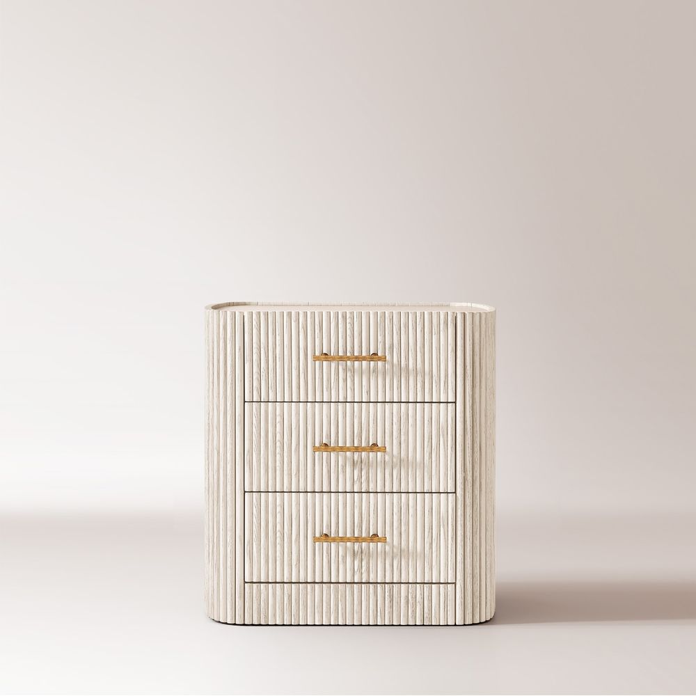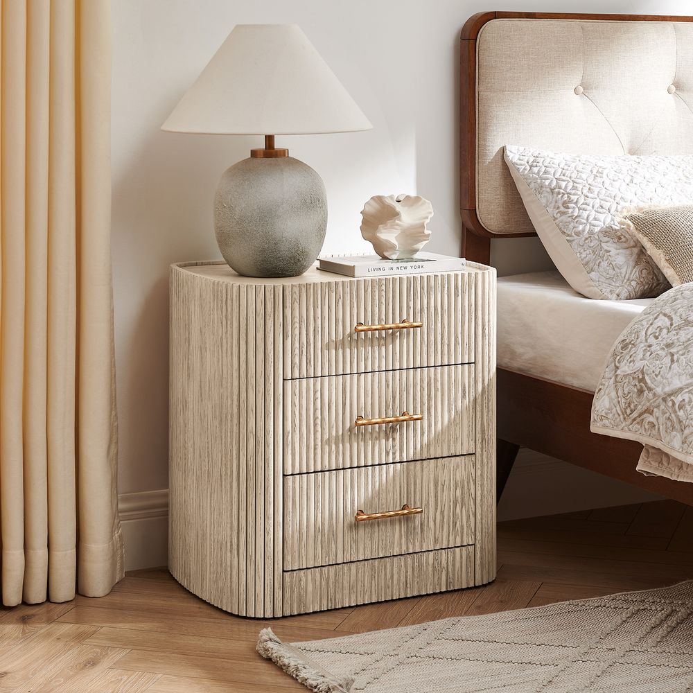 Crafted with softly rounded edges and solid oak strips, the Astor nightstand brings together warmth and modern design. Its smooth, sculpted form highlights the rich oak grain and natural tones, while the gold metal handles add a refined accent that complements the design with understated elegance.
