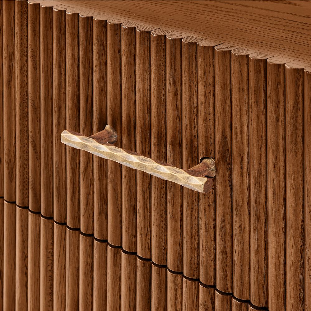 Crafted of solid wood and engineered wood with elm veneers.All wood is kiln-dried for added durability.Finish is achieved through multistep process in which wood is wire brushed to highlight its rich grain.Drawer is crafted with precision dovetail joints for superior sturdiness and weight-bearing strength.Solid wood blocks are used at structural joints for reinforcement.Solid wood fluting presents a natural texture.Color perception may vary due to wood characteristics, lighting, and devices. Wood grain variation is expected, as each is unique.