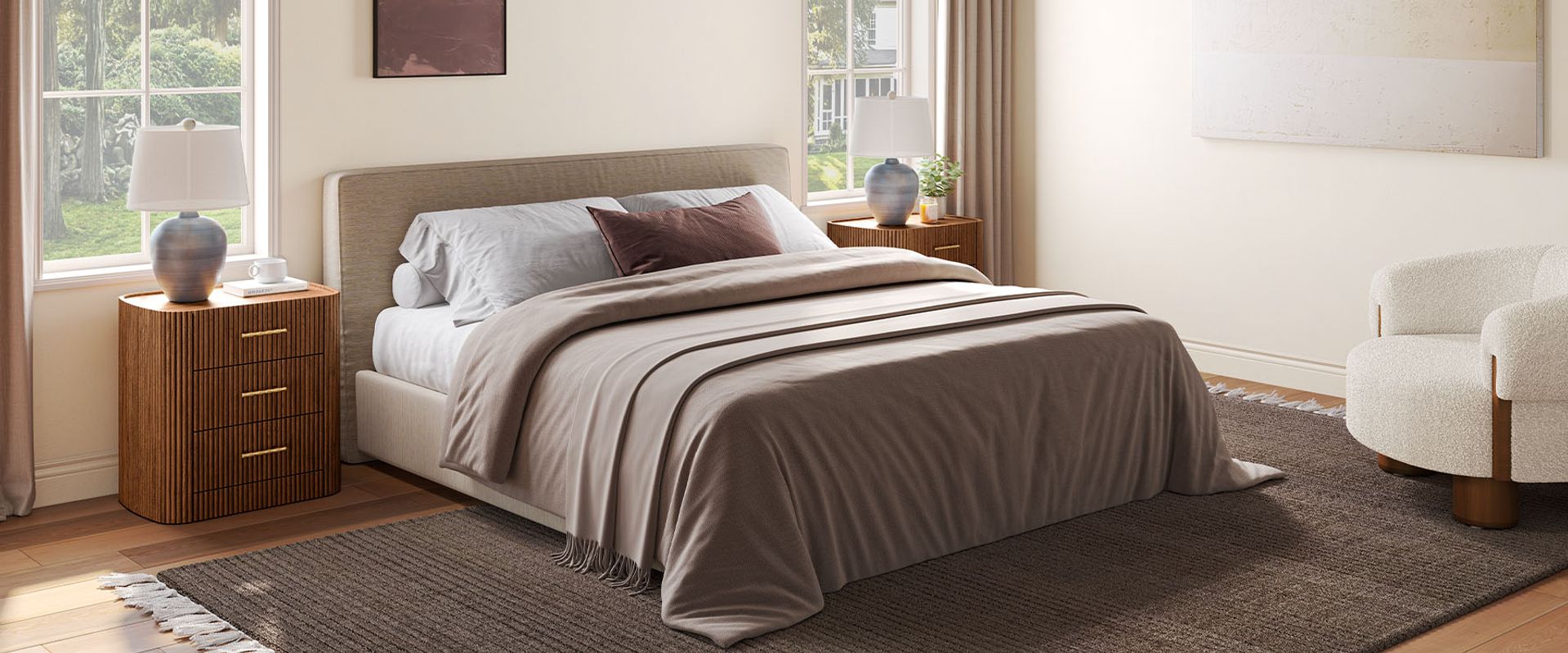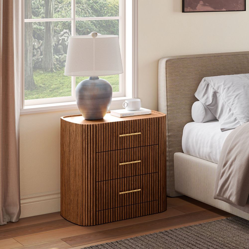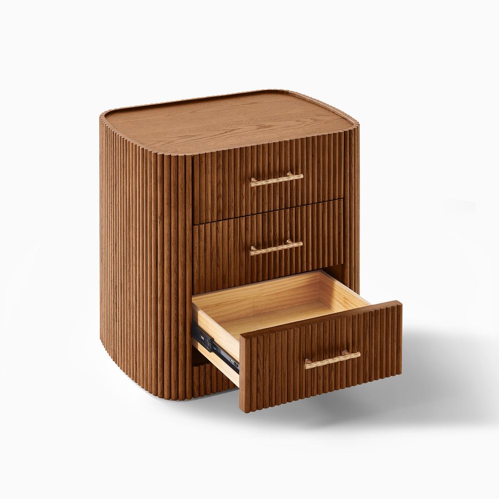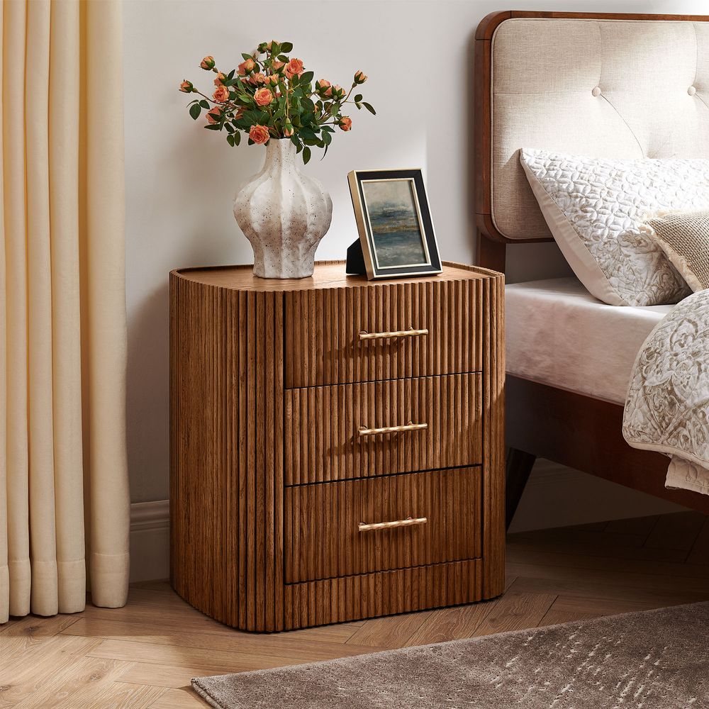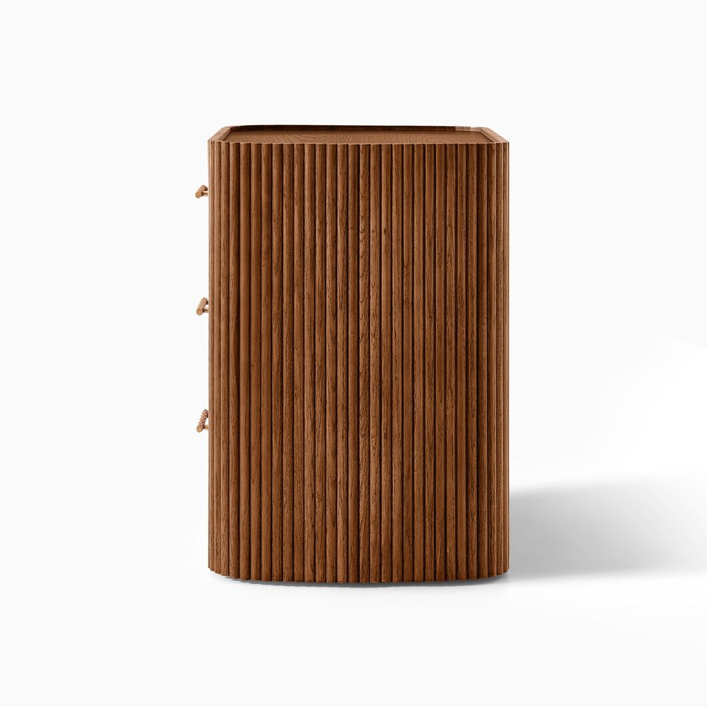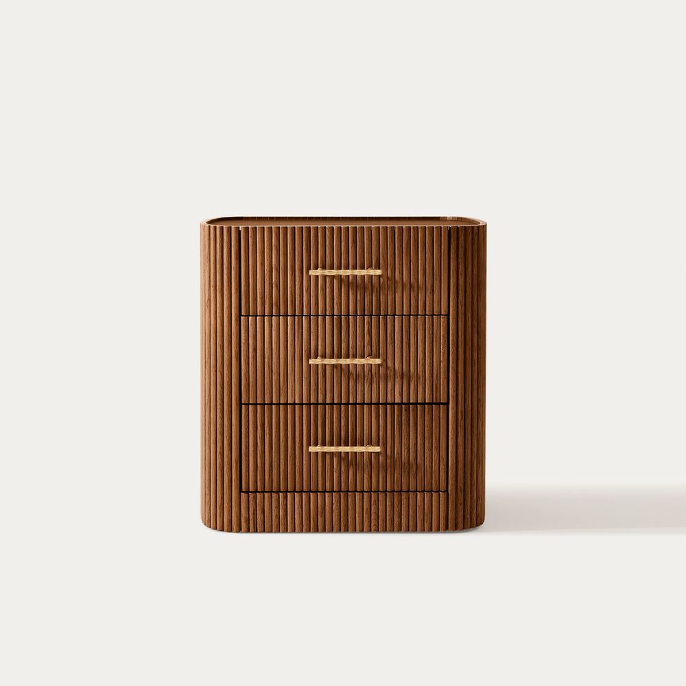 Crafted with softly rounded edges and solid oak strips, the Astor nightstand brings together warmth and modern design. Its smooth, sculpted form highlights the rich oak grain and natural tones, while the gold metal handles add a refined accent that complements the design with understated elegance.