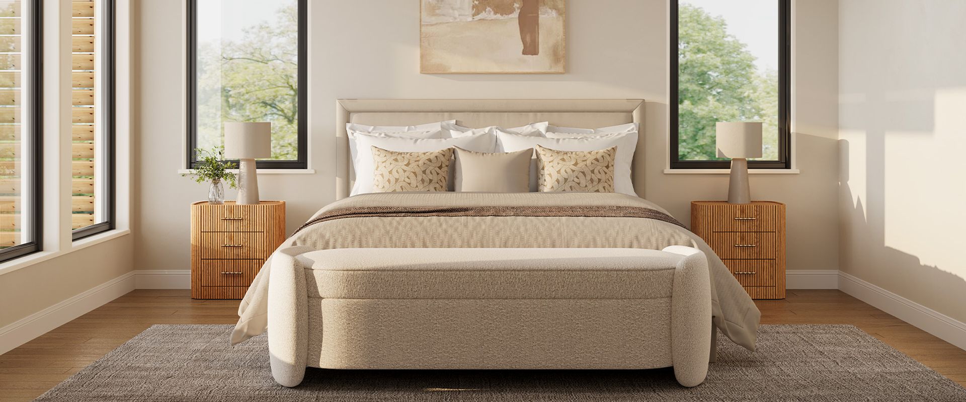 Crafted with softly rounded edges and solid oak strips, the Astor nightstand brings together warmth and modern design. Its smooth, sculpted form highlights the rich oak grain and natural tones, while the gold metal handles add a refined accent that complements the design with understated elegance.