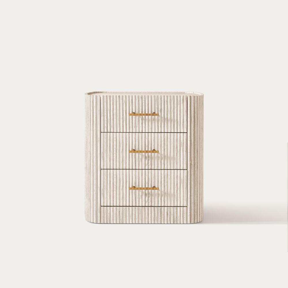 Crafted with softly rounded edges and solid oak strips, the Astor nightstand brings together warmth and modern design. Its smooth, sculpted form highlights the rich oak grain and natural tones, while the gold metal handles add a refined accent that complements the design with understated elegance.