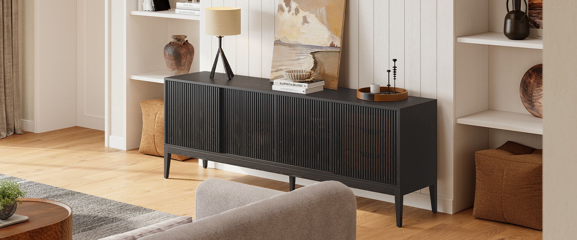 Crafted of American oak and engineered wood with oak veneers.All wood is kiln-dried for added durability.Finish is achieved through multistep process in which wood is wire brushed to highlight its rich grain.Drawers are crafted with precision dovetail joints for superior sturdiness and weight-bearing strength.Slatted sliding doors for effortless access and minimalist style.Designed for TVs up to 85", 4 cord cutouts in back panel for cable management.Color perception may vary due to wood characteristics, lighting, and devices. Wood grain variation is expected, as each is unique.