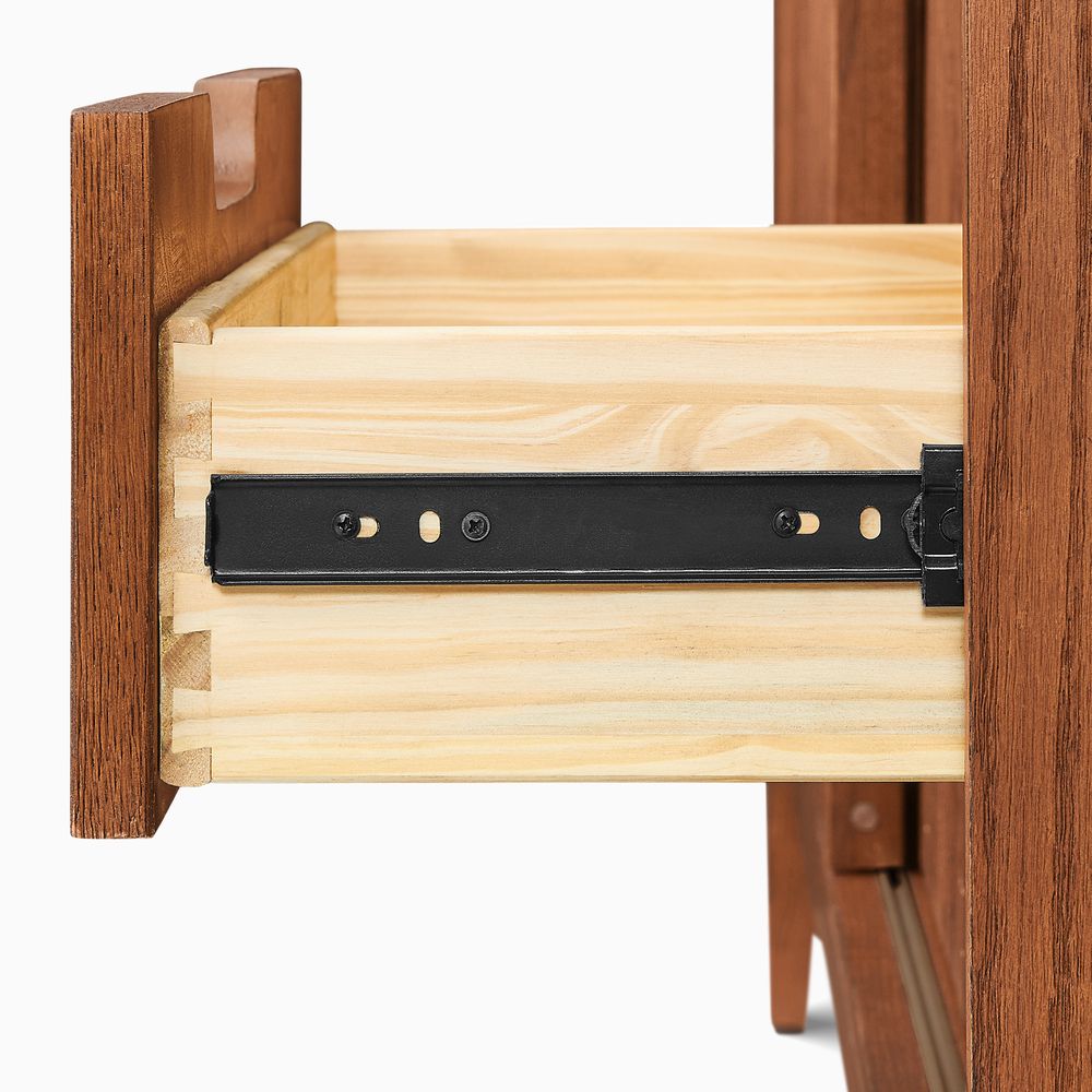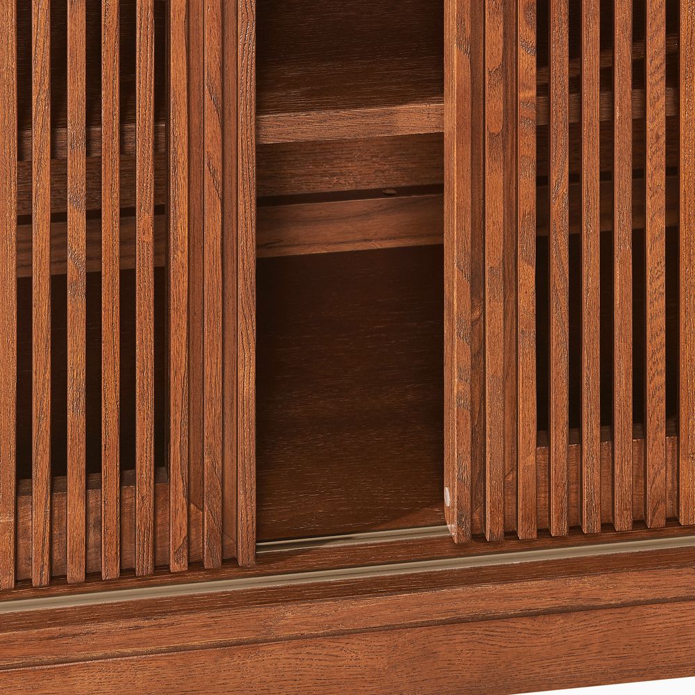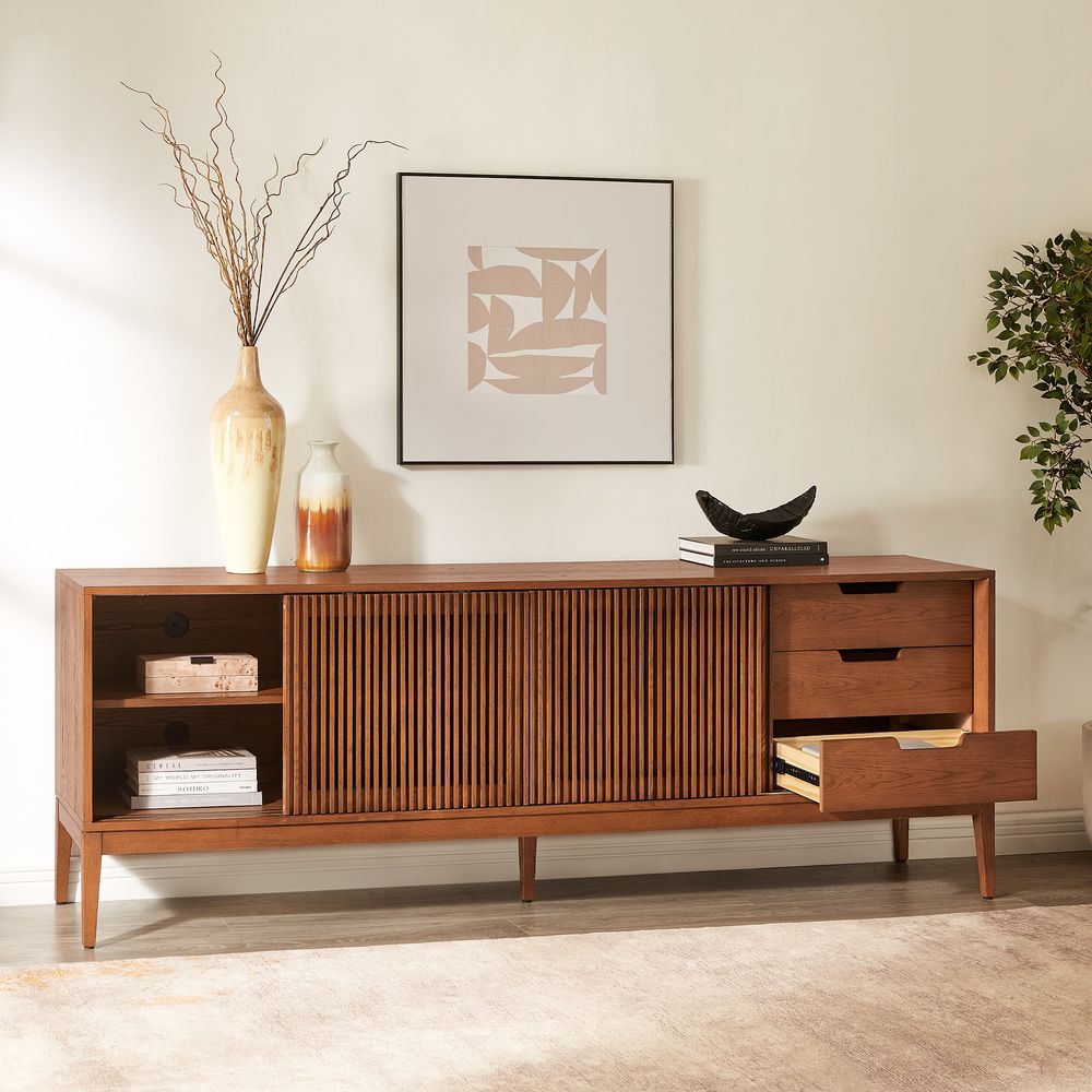 Crafted of American oak and engineered wood with oak veneers.All wood is kiln-dried for added durability.Finish is achieved through multistep process in which wood is wire brushed to highlight its rich grain.Drawers are crafted with precision dovetail joints for superior sturdiness and weight-bearing strength.Slatted sliding doors for effortless access and minimalist style.Designed for TVs up to 85", 4 cord cutouts in back panel for cable management.Color perception may vary due to wood characteristics, lighting, and devices. Wood grain variation is expected, as each is unique.