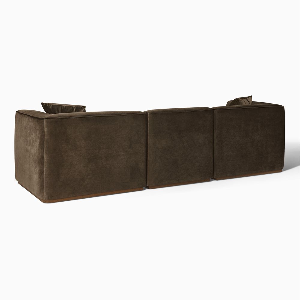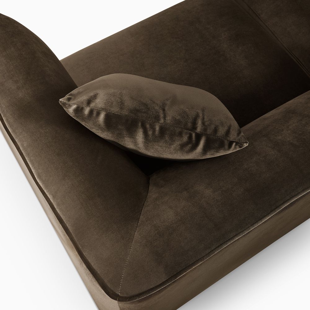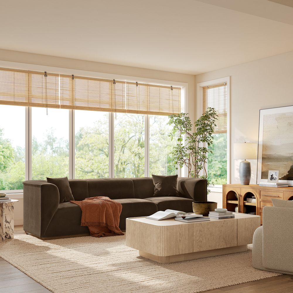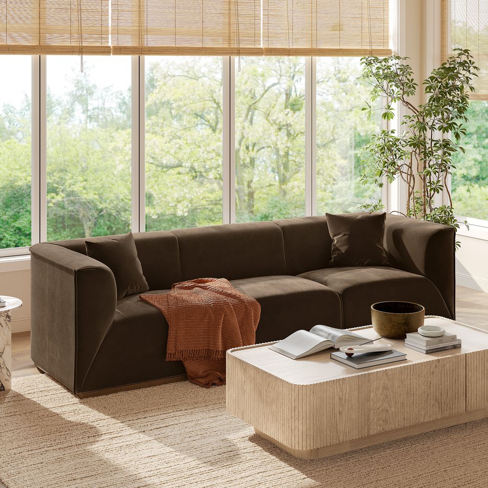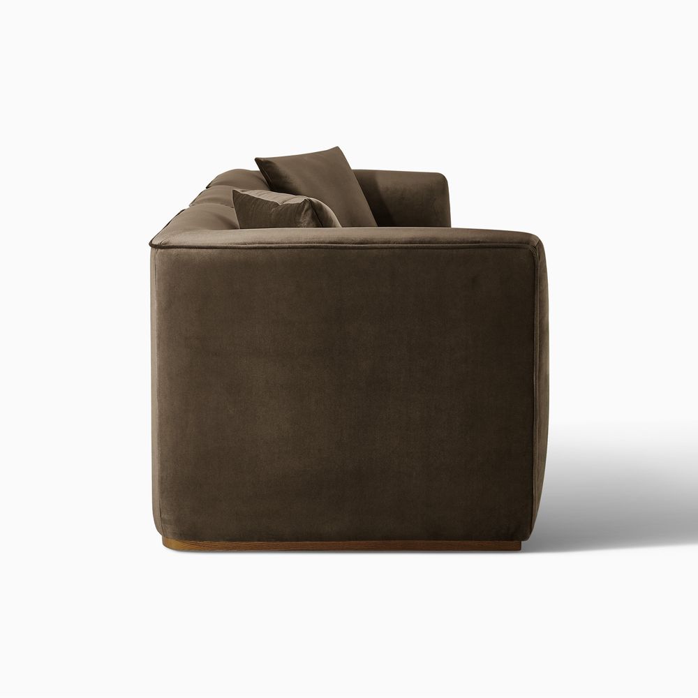 Benton is defined by a boxy, substantial presence with deep, low-profile seating that anchors the room. Subtly curved arms and back soften its bold silhouette, offering supportive comfort. A recessed solid wood base adds understated warmth, making Benton a natural focal point for modern minimalist, warm contemporary, or soft industrial interiors.