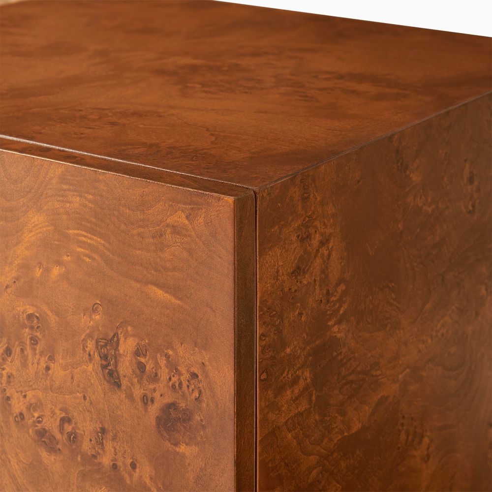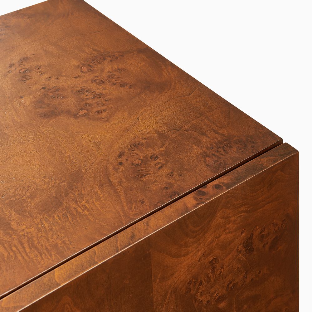 Celebrated for its rare and organic allure, the Bodil collection showcases nature's masterpiece, richly burled wood with undulating, swirling grain. Expertly crafted reverse chamfer edges soften the silhouette, lending a refined lightness. A versatile centerpiece for curated interiors, it harmonizes effortlessly with transitional styles.