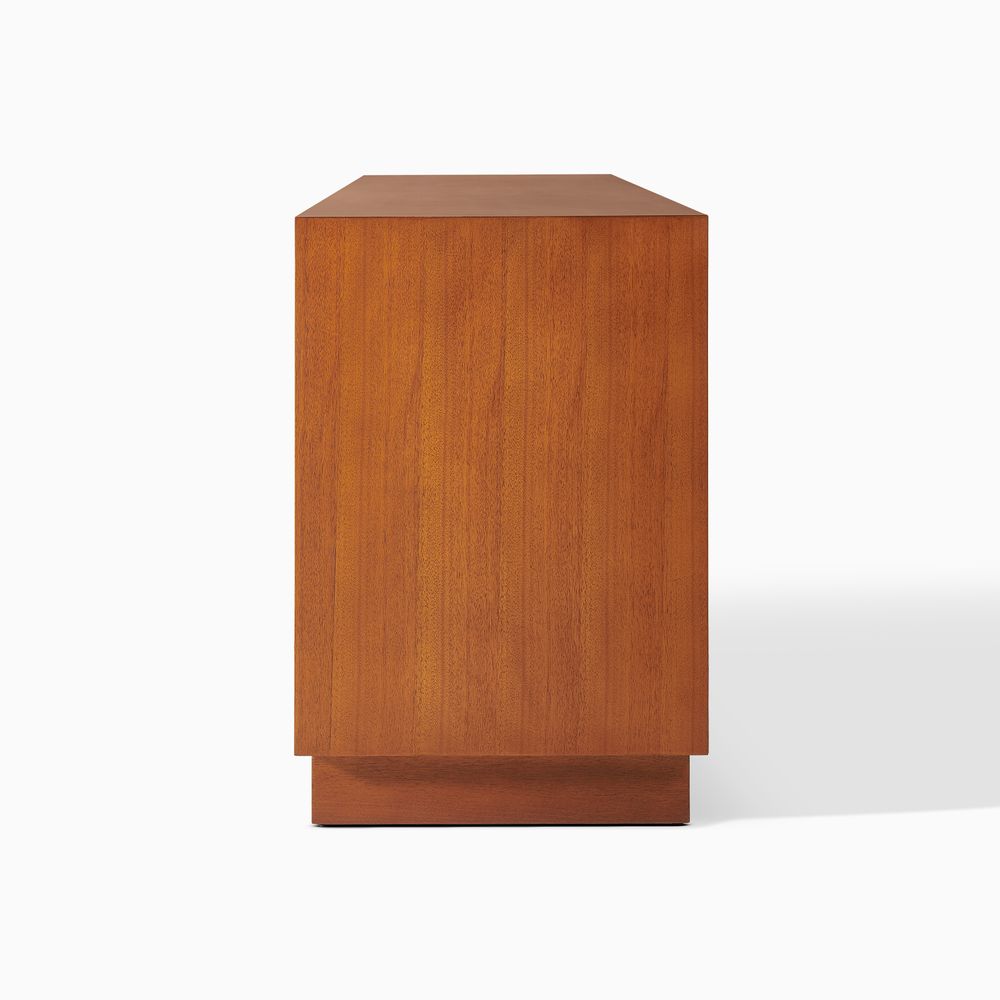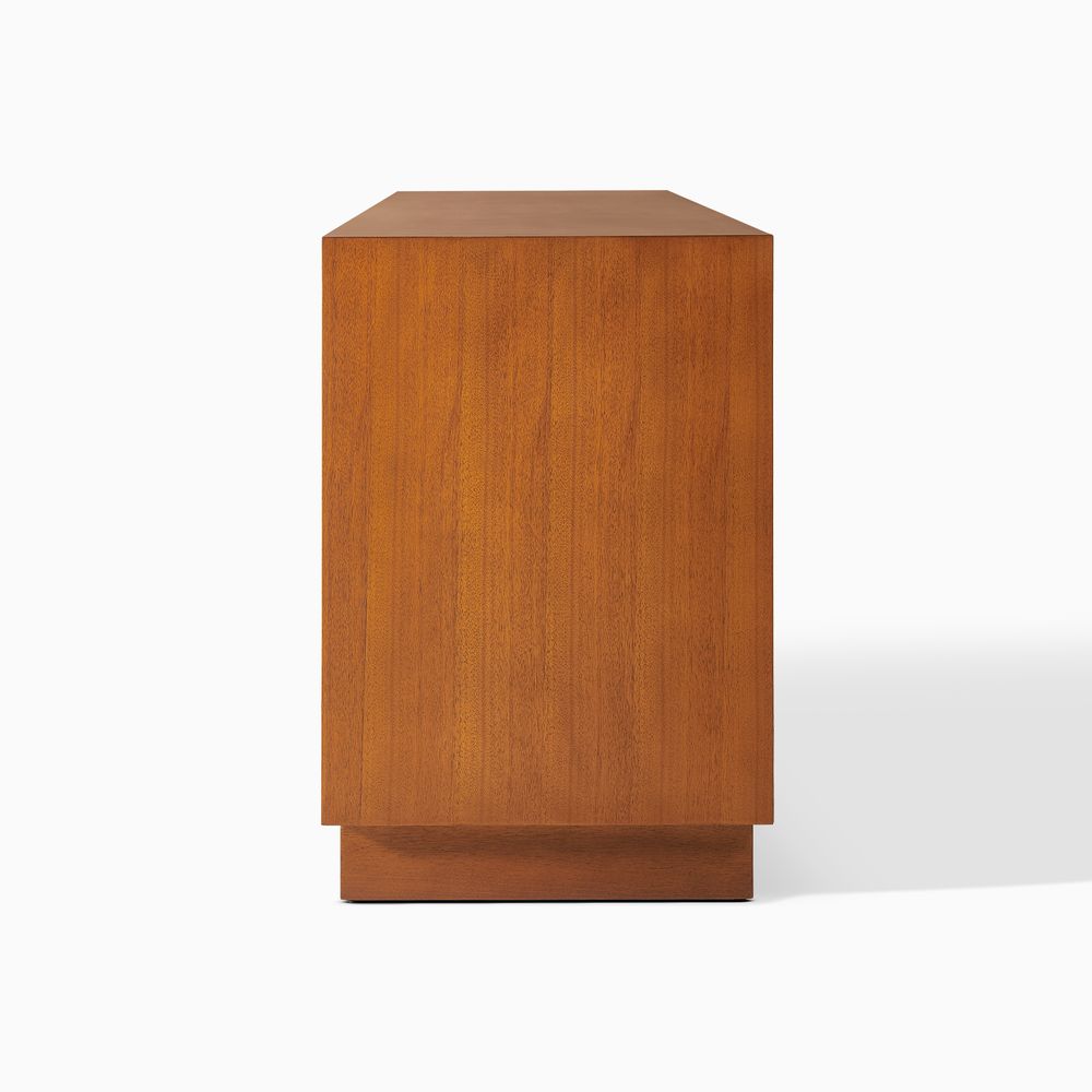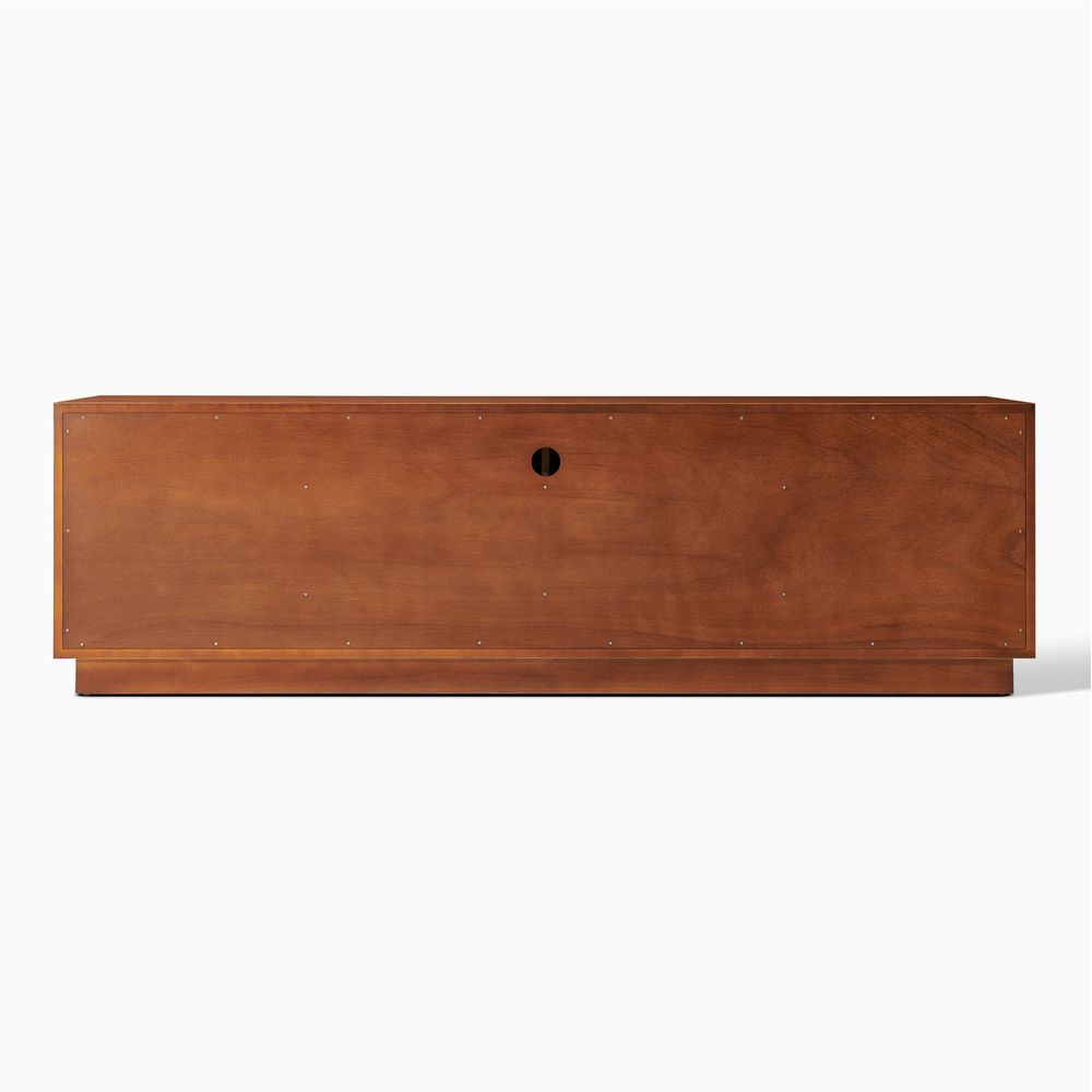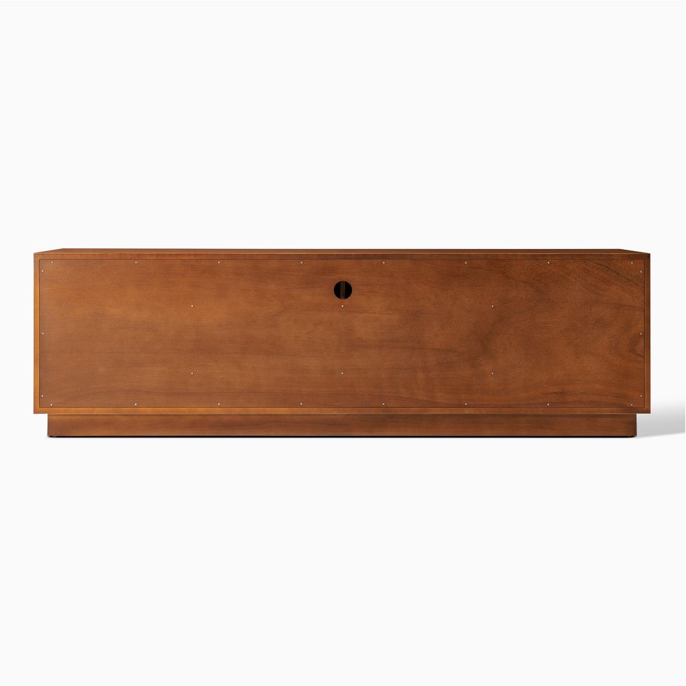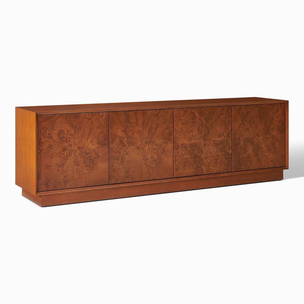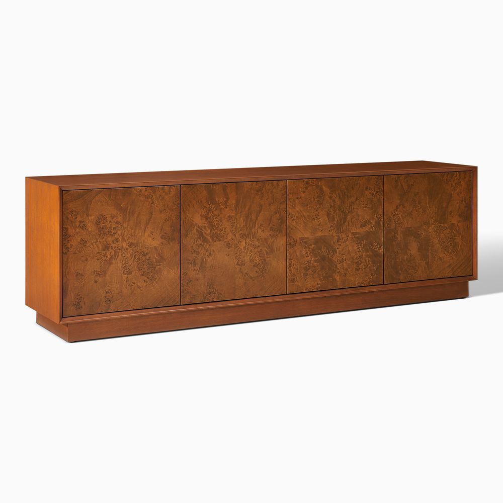 Crafted of birch wood and engineered wood with burl veneers.All wood is kiln-dried for added durability.Burl finishes create stunning visual interest and texture.Made from natural materials may vary in pattern, shape and texture, making each truly unique.Beveling angled edges for subtle elegance.Solid wood blocks are used at structural joints for reinforcement.Designed for TVs up to 80", 1 cord cutout in back panel for cable management.Color perception may vary due to wood characteristics, lighting, and devices. Wood grain variation is expected, as each is unique.