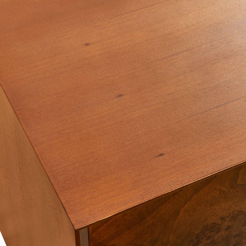 Celebrated for its rare and organic allure, the Bodil collection showcases nature's masterpiece, richly burled wood with undulating, swirling grain. Expertly crafted reverse chamfer edges soften the silhouette, lending a refined lightness. A versatile centerpiece for curated interiors, it harmonizes effortlessly with transitional styles.