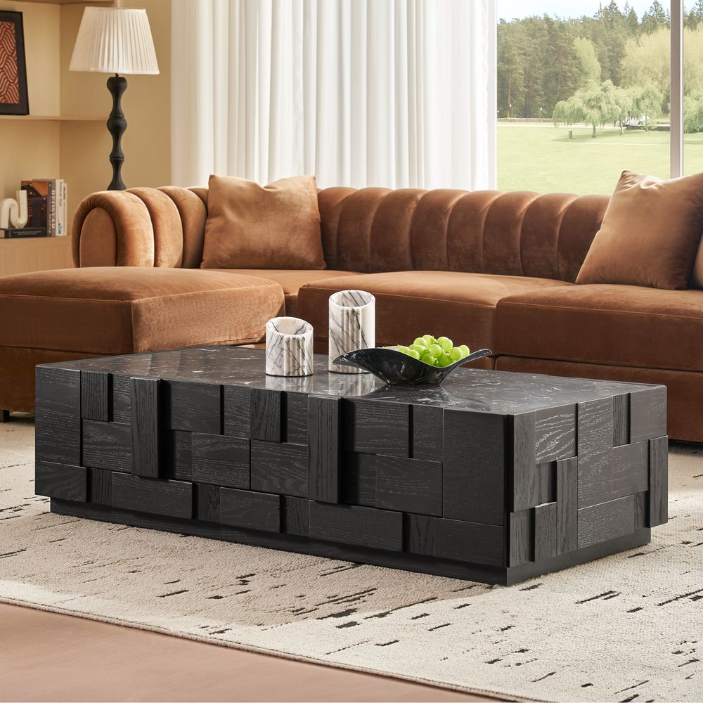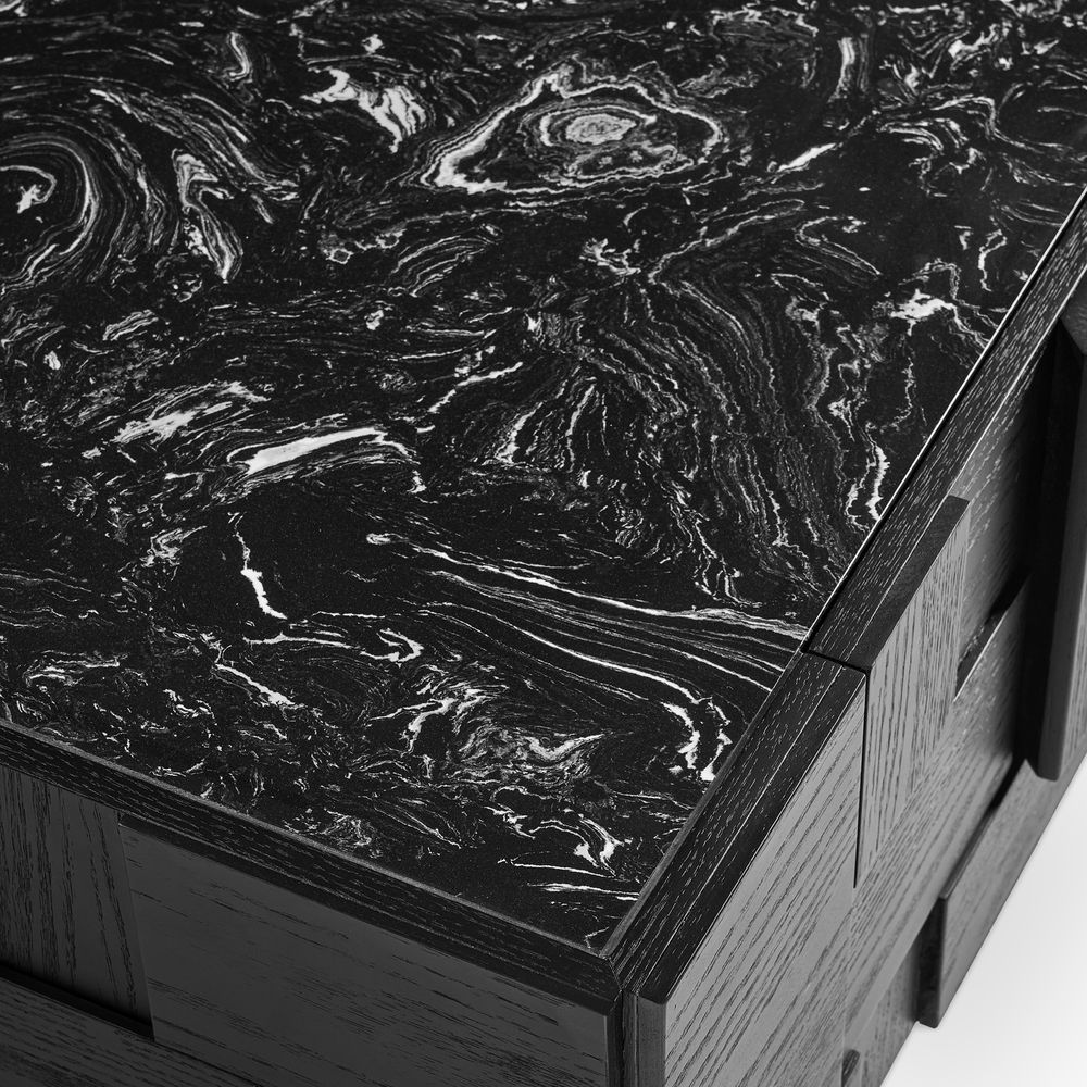 To enrich the deep black piece with vibrancy and refined character, an engineered stone top is inset, its delicate off-white ripples interacting with the natural grain variations of the planks, creating a balanced and intriguing effect.
