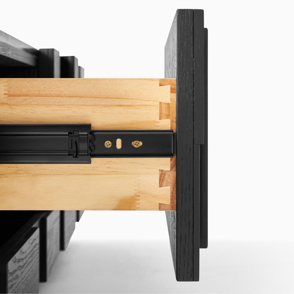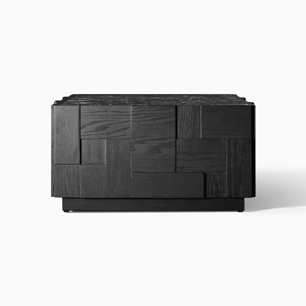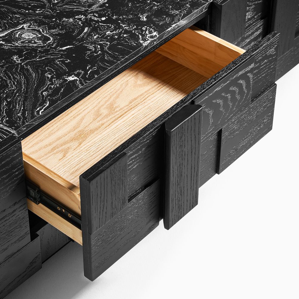 Crafted of engineered stone, solid wood, and plywood with American oak veneers.Tabletop is honed and sealed for a satin finish with deep veining and natural color contrasts.All wood is kiln-dried for added durability.Finish is achieved through multistep process in which wood is wire brushed to highlight its rich grain.Drawers are crafted with precision dovetail joints for superior sturdiness and weight-bearing strength.Panels are hand-crafted from solid wood blocks featuring a cross-grain pattern.Raised and recessed wood surface creates a three-dimensional floating visual effect.Solid wood blocks are used at structural joints for reinforcement.Color perception may vary due to wood characteristics, lighting, and devices. Wood grain variation is expected, as each is unique.Variation in the veining of stone is to be expected, as each piece will be unique.