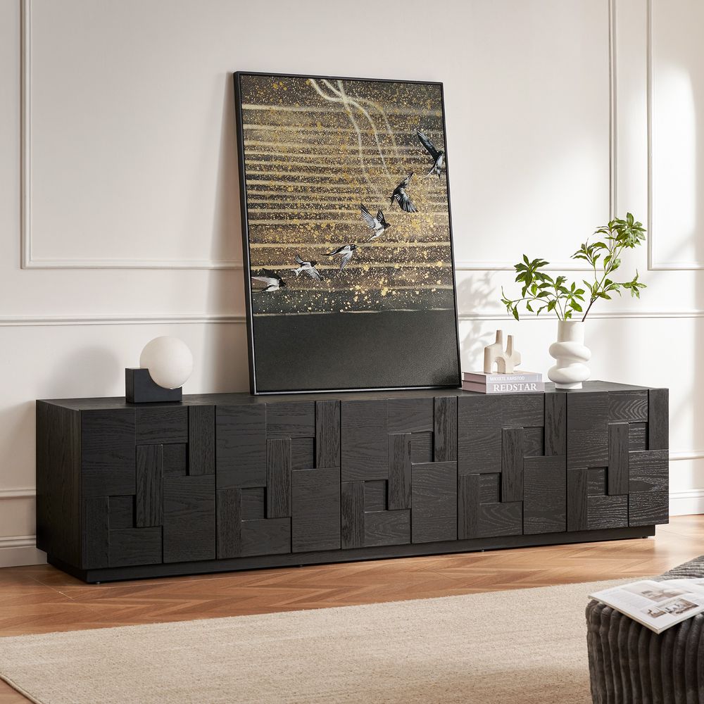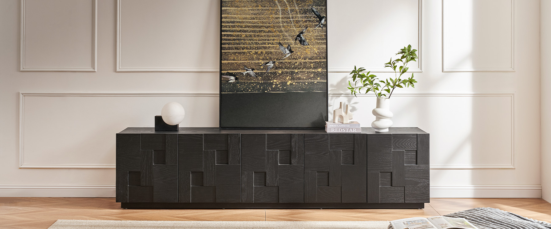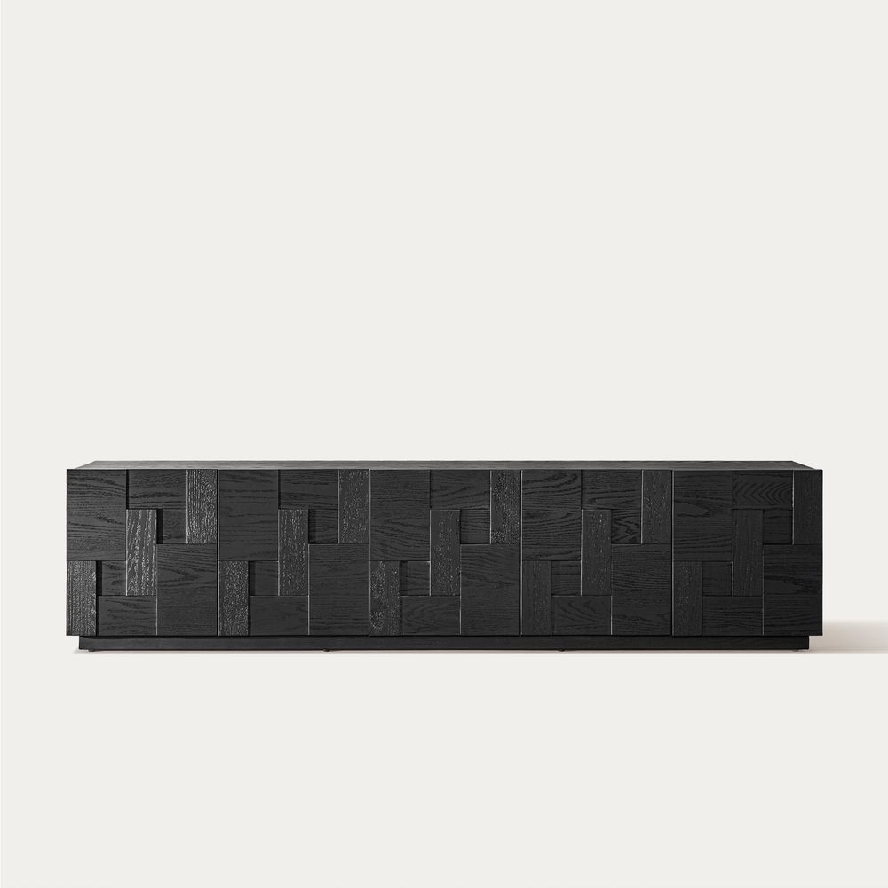 Crafted of plywood and solid wood with American oak veneers.All wood is kiln-dried for added durability.Finish is achieved through multistep process in which wood is wire brushed to highlight its rich grain.Panel is hand-crafted from solid wood blocks featuring a cross-grain pattern.Raised and recessed wood surface creates a three-dimensional floating visual effect.Solid wood blocks are used at structural joints for reinforcement.Designed for TVs up to 85", 4 cord cutouts in back panel for cable management.Color perception may vary due to wood characteristics, lighting, and devices. Wood grain variation is expected, as each is unique.