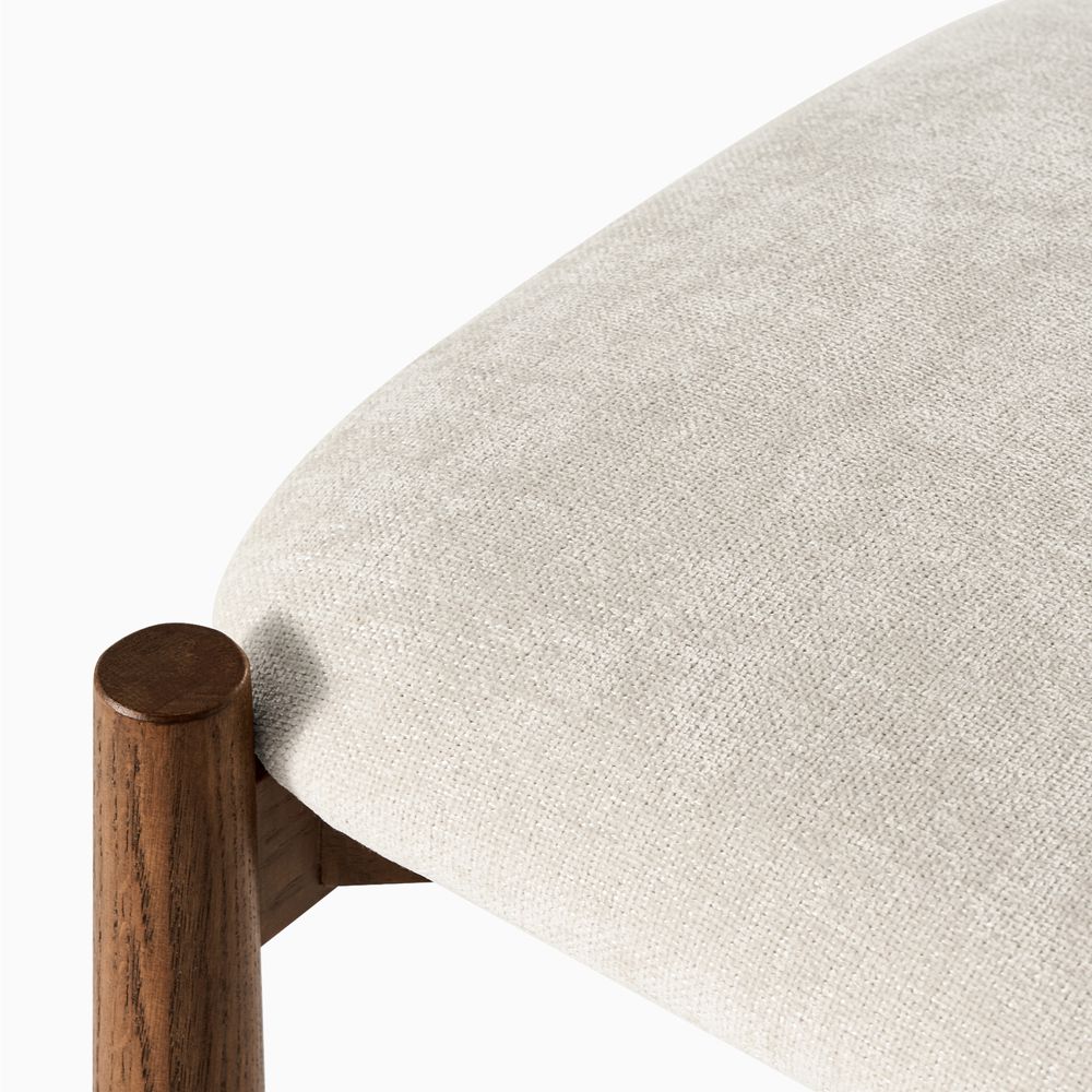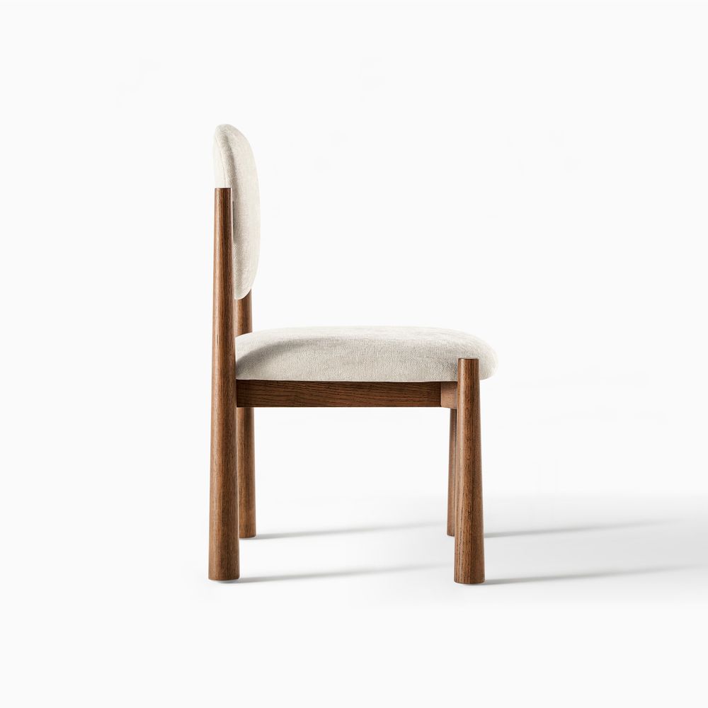 The chair draws inspiration from 1970s modern design, featuring reverse-tapered legs that widen from slim to chunky for a stately, grounded form with playful proportions. The plump upholstery completes the piece with a rounded, casual, comfortable look—classy mid-century modern style with a touch of personality.