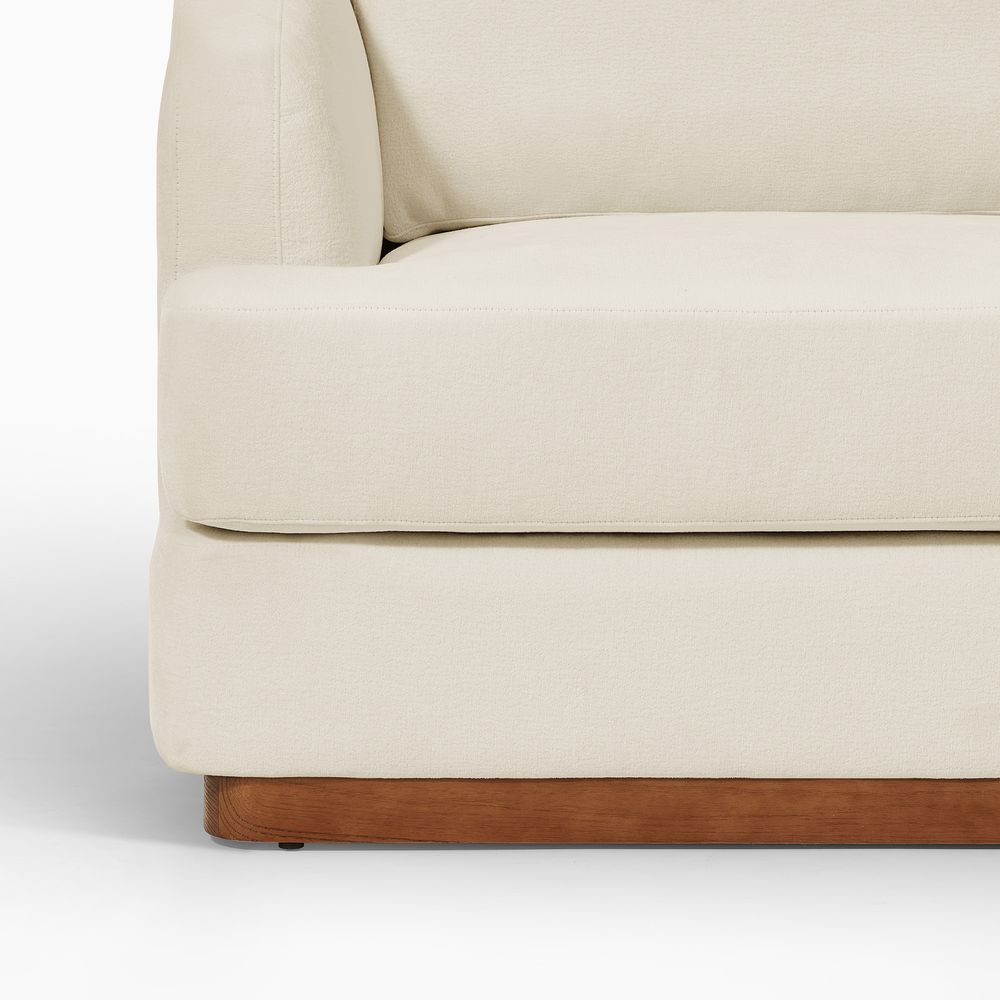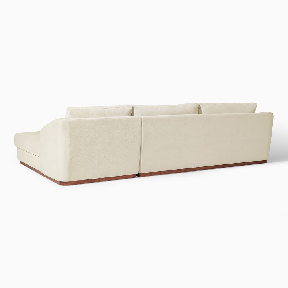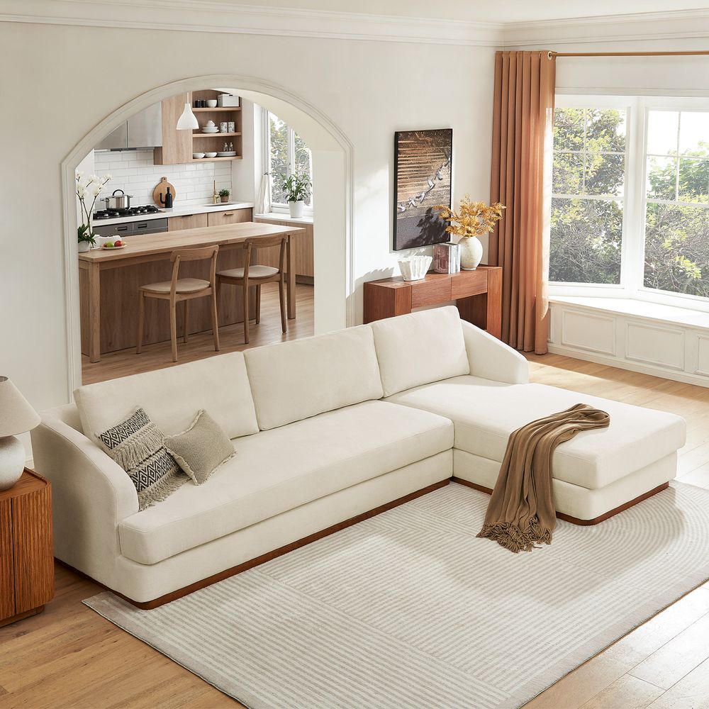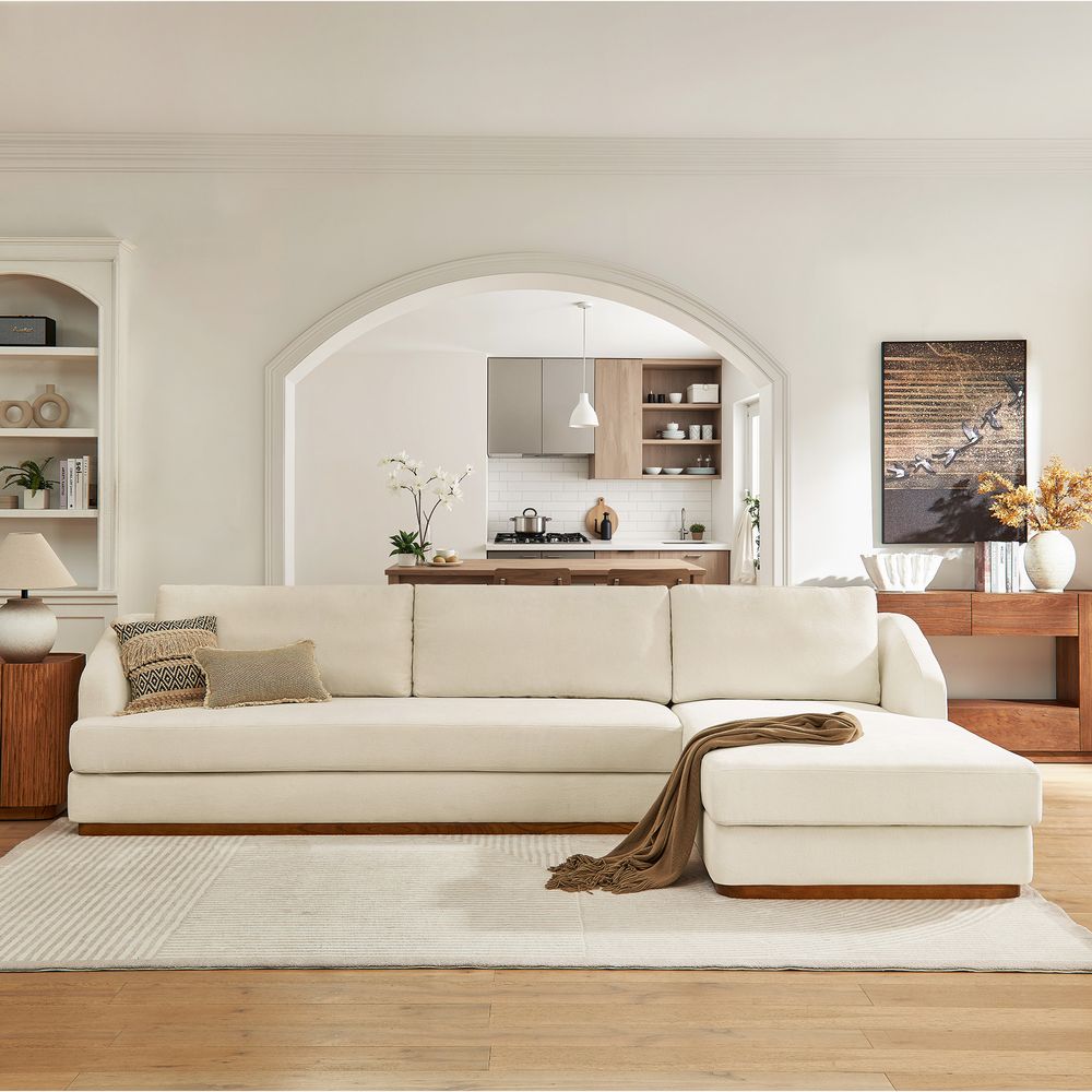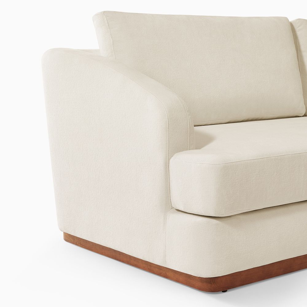 Claudia combines a lounging chaise with deep bench seating and gently curved armrests, creating a clean, modern, and softly contoured silhouette. The sofa is nestled on a solid wood plinth that introduces a warm wooden touch and completes the neutral palette. Generously cushioned backrests and seats provide supportive comfort, and the low-profile design ensures a laid-back, cloud-like lounging experience throughout.