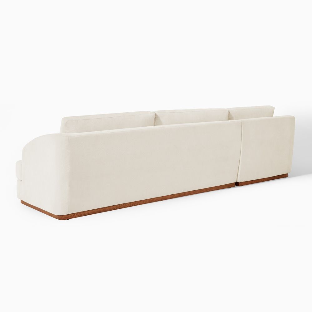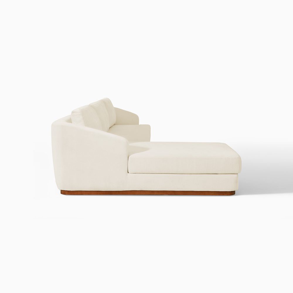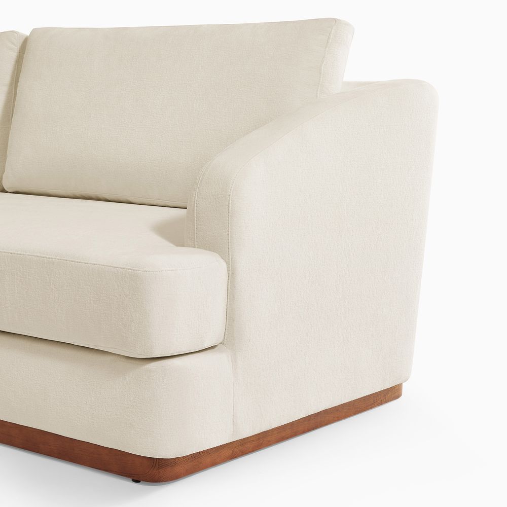 Claudia combines a lounging chaise with deep bench seating and gently curved armrests, creating a clean, modern, and softly contoured silhouette. The sofa is nestled on a solid wood plinth that introduces a warm wooden touch and completes the neutral palette. Generously cushioned backrests and seats provide supportive comfort, and the low-profile design ensures a laid-back, cloud-like lounging experience throughout.