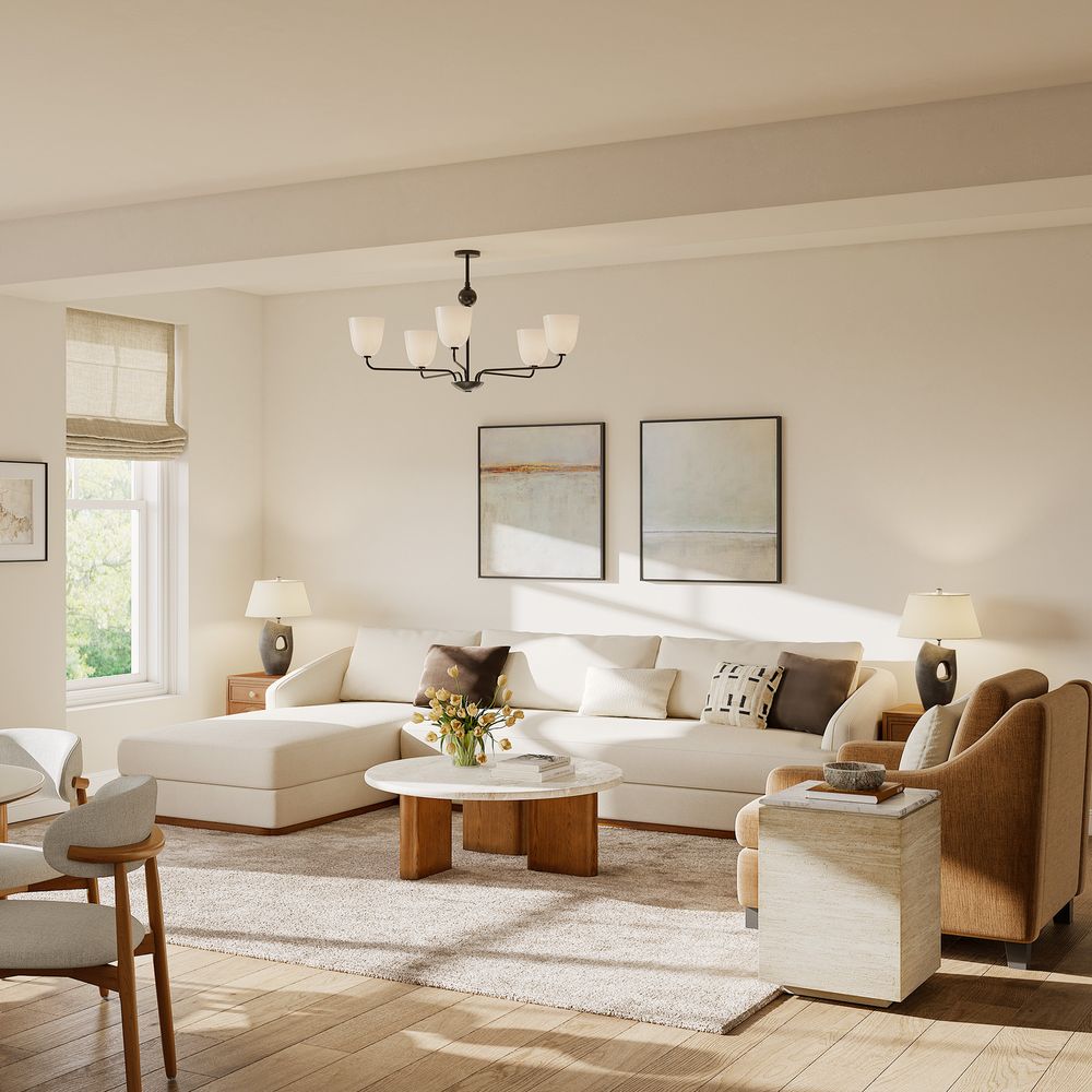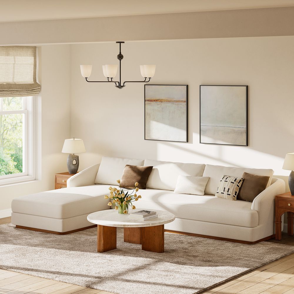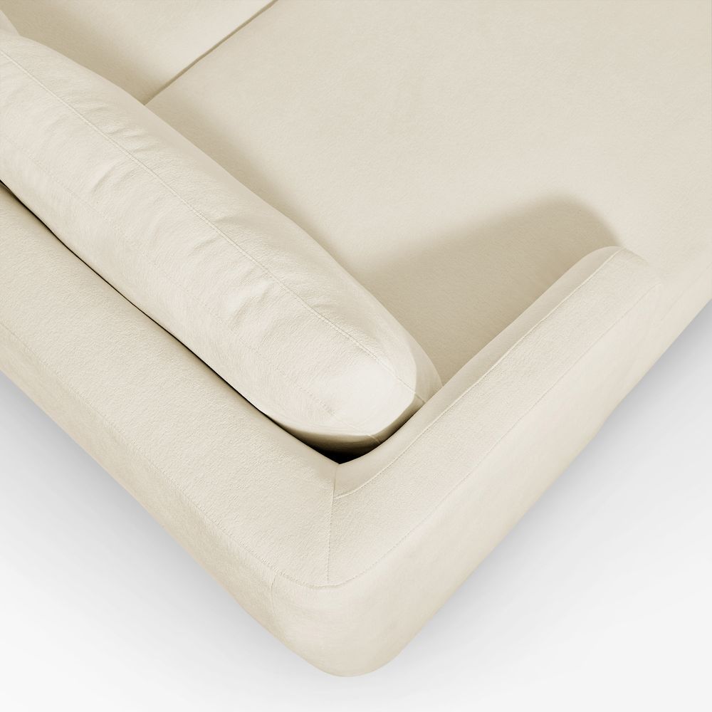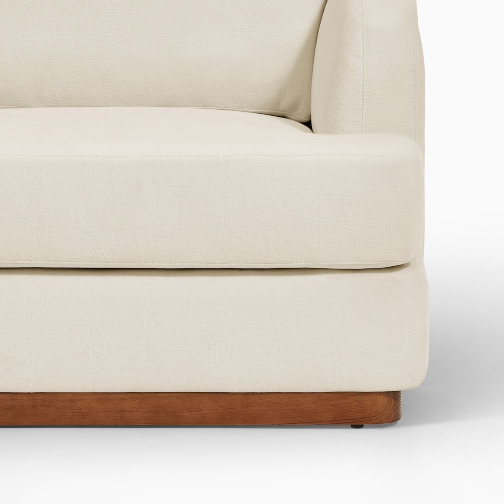 Claudia combines a lounging chaise with deep bench seating and gently curved armrests, creating a clean, modern, and softly contoured silhouette. The sofa is nestled on a solid wood plinth that introduces a warm wooden touch and completes the neutral palette. Generously cushioned backrests and seats provide supportive comfort, and the low-profile design ensures a laid-back, cloud-like lounging experience throughout.