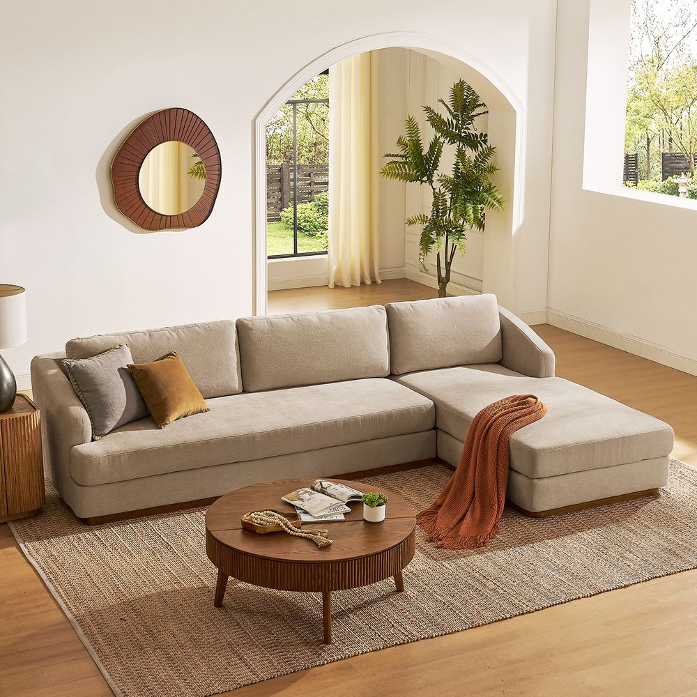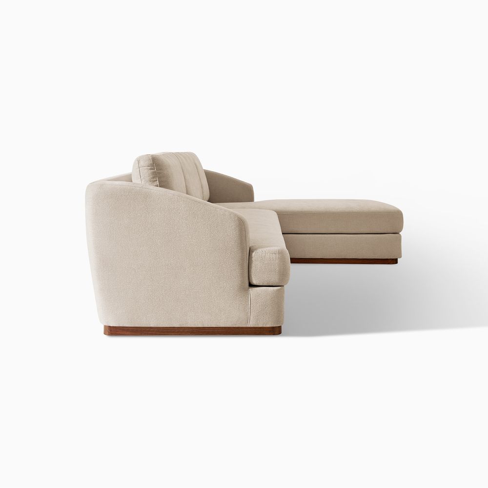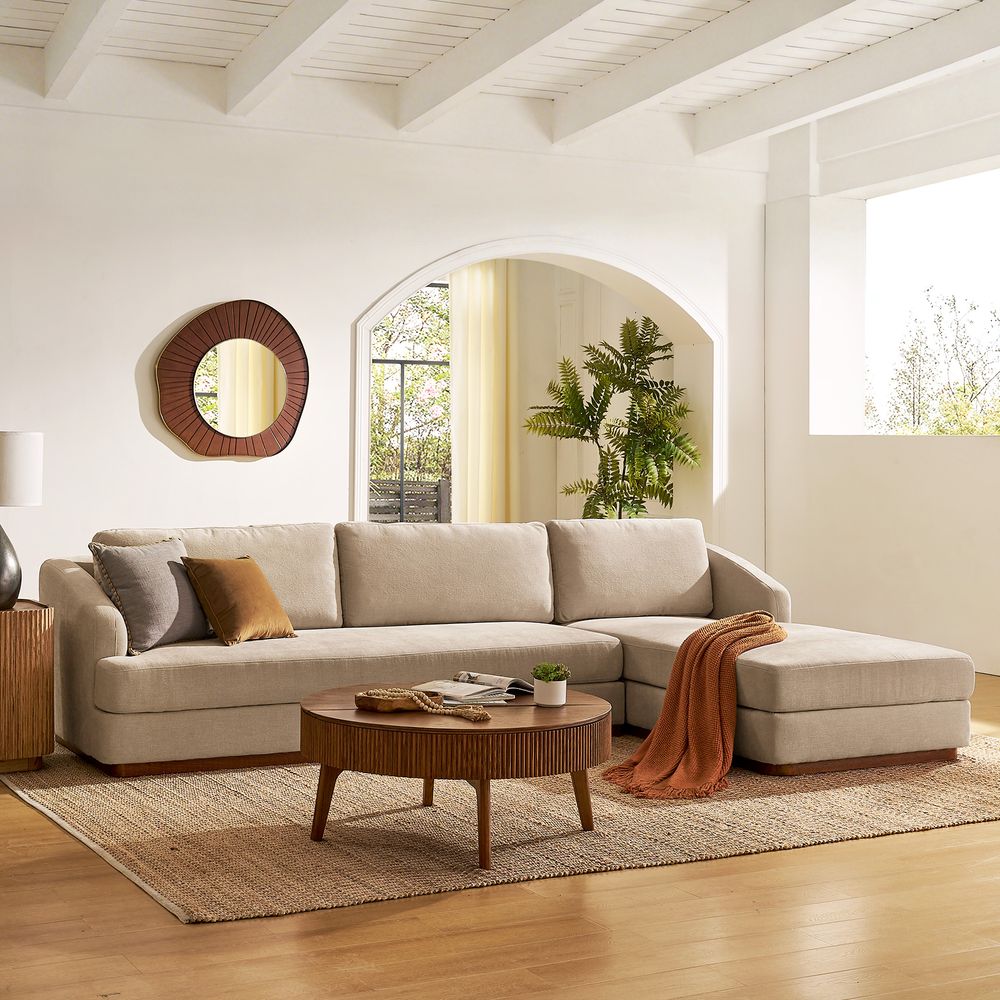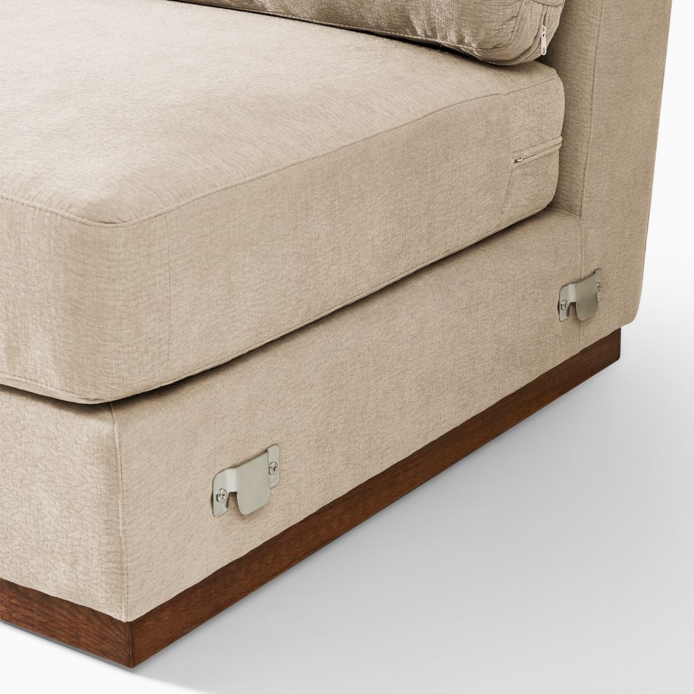 Claudia combines a lounging chaise with deep bench seating and gently curved armrests, creating a clean, modern, and softly contoured silhouette. The sofa is nestled on a solid wood plinth that introduces a warm wooden touch and completes the neutral palette. Generously cushioned backrests and seats provide supportive comfort, and the low-profile design ensures a laid-back, cloud-like lounging experience throughout.