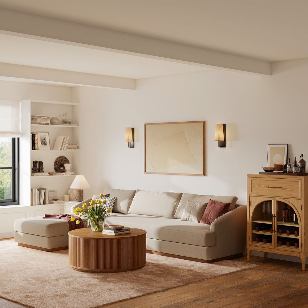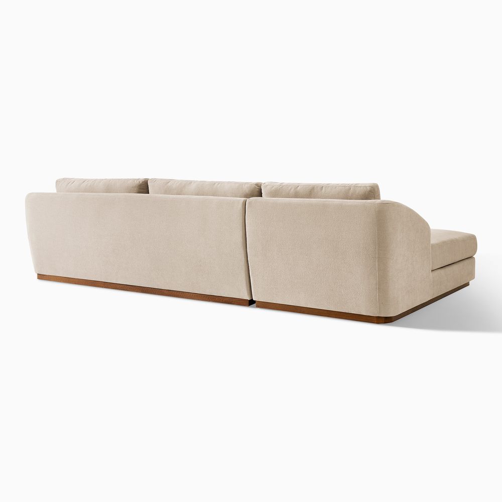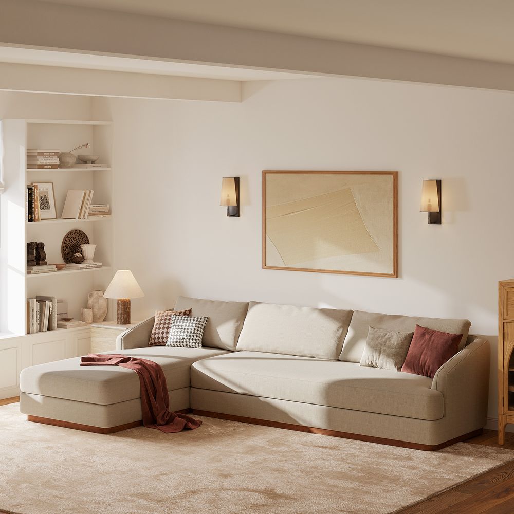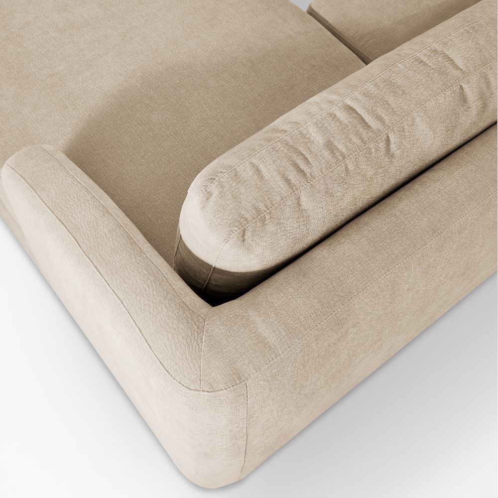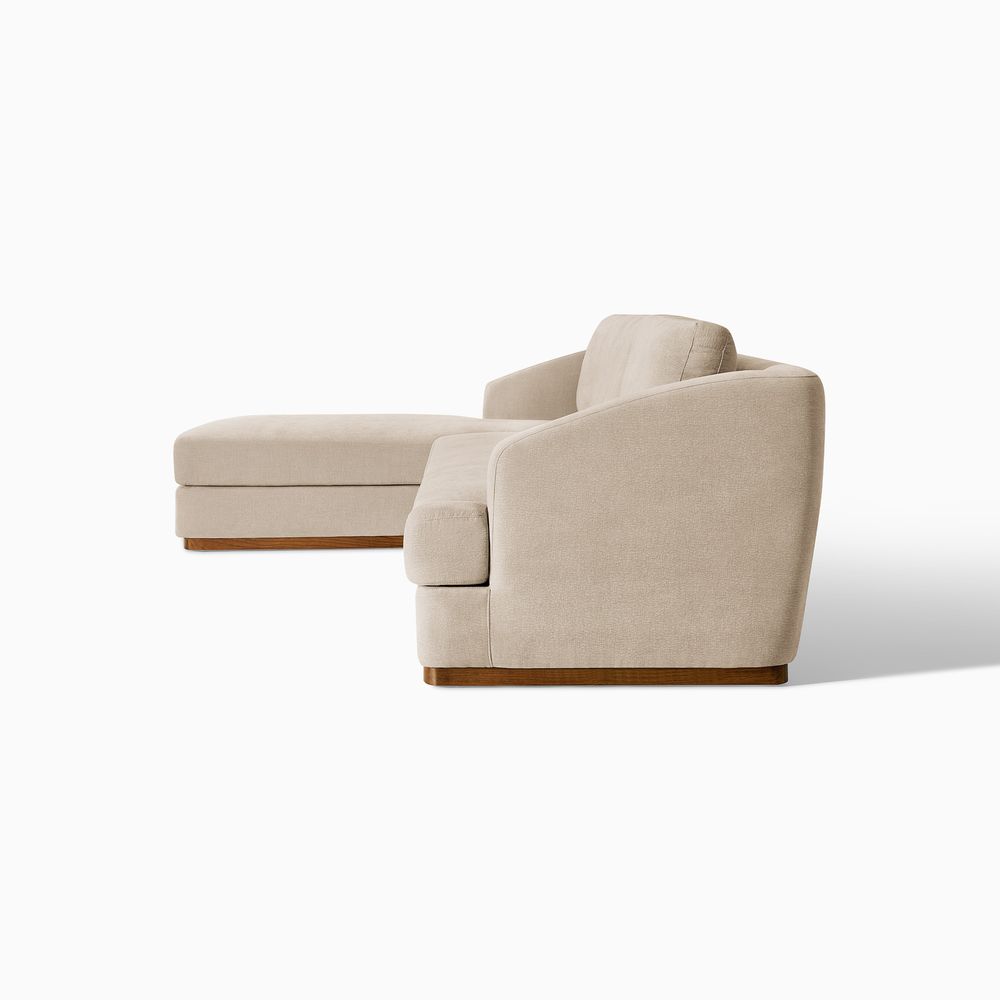 Claudia combines a lounging chaise with deep bench seating and gently curved armrests, creating a clean, modern, and softly contoured silhouette. The sofa is nestled on a solid wood plinth that introduces a warm wooden touch and completes the neutral palette. Generously cushioned backrests and seats provide supportive comfort, and the low-profile design ensures a laid-back, cloud-like lounging experience throughout.