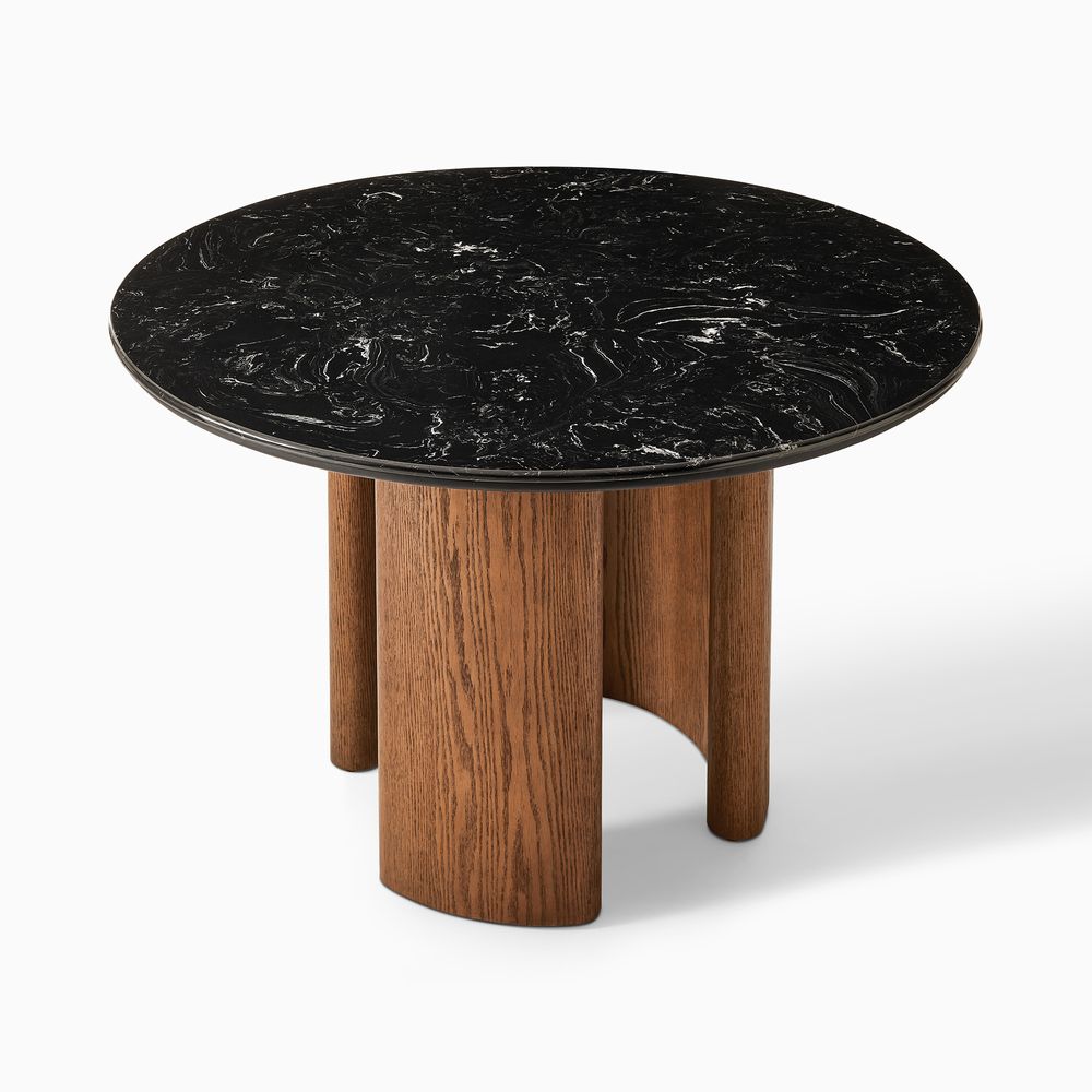 Crafted of American solid oak, engineered stone and plywood with oak veneer.Tabletop is honed and sealed for a satin finish with deep veining and natural color contrasts.All wood is kiln-dried for added durability.Wood glazing adds visual interest with greater depth and layering and enhances coloring.48" table comfortably seats 4.Color perception may vary due to wood characteristics, lighting, and devices. Wood grain variation is expected, as each is unique.Variation in the veining of stone is to be expected, as each piece will be unique.
