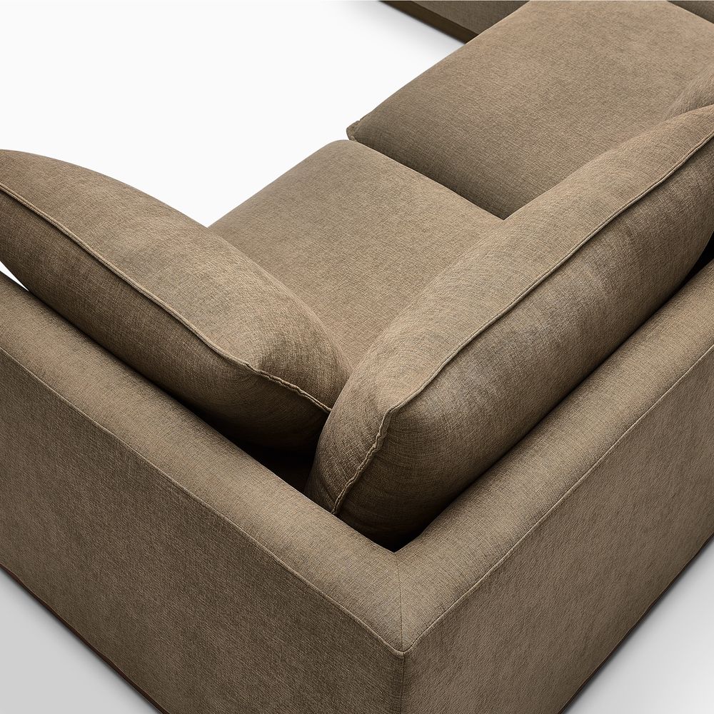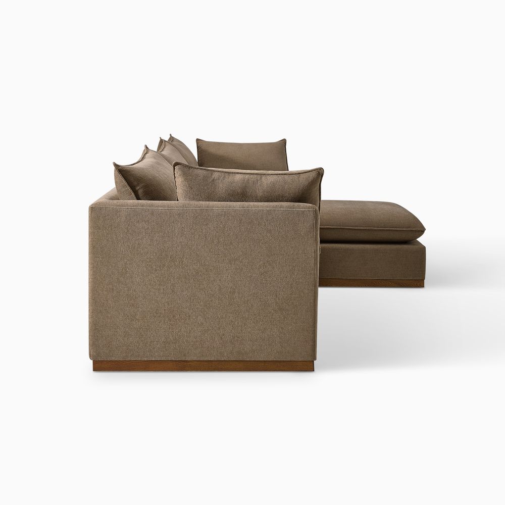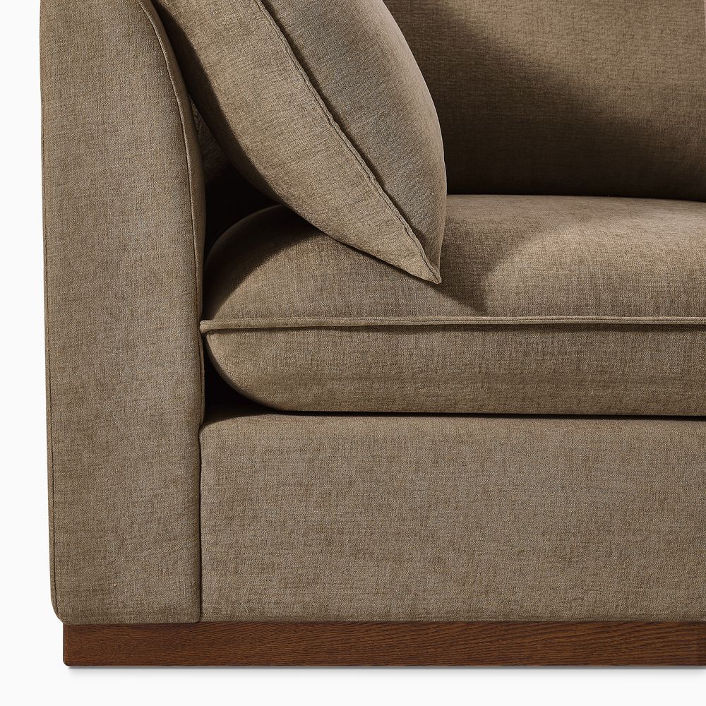 Cove feels modern yet relaxed, with a laid-back aesthetic inspired by coastal style. Its pillowy proportions create an inviting, sink-in comfort, while the solid wood plinth introduces a warm wooden touch and completes the neutral palette.