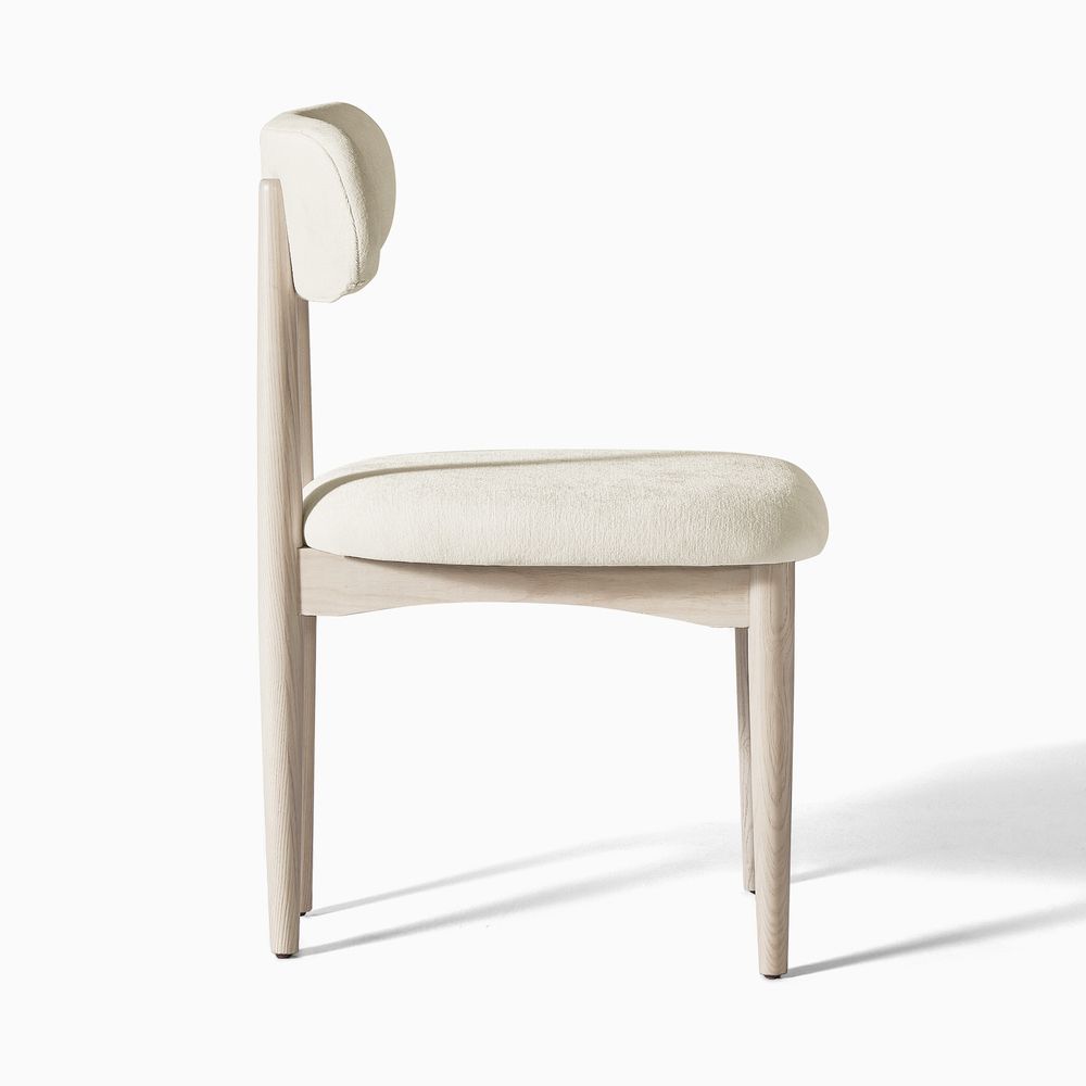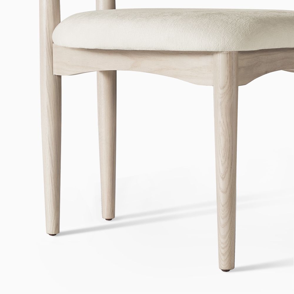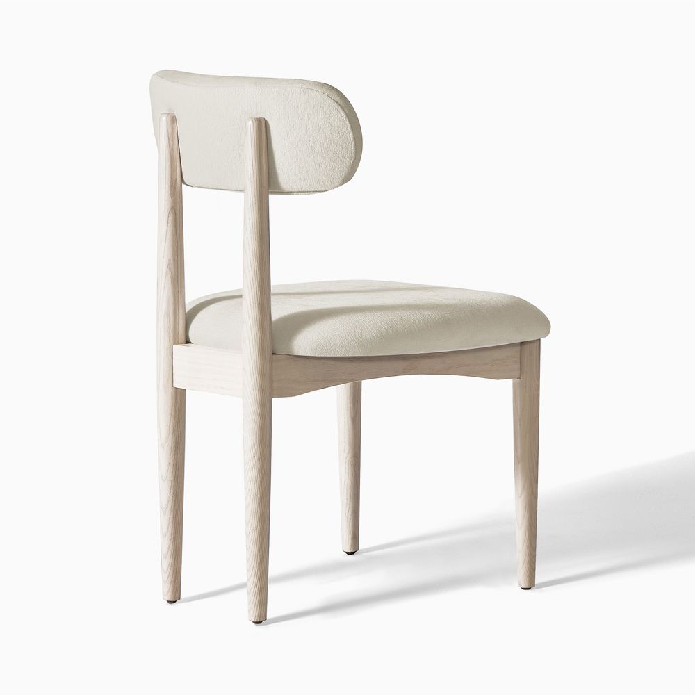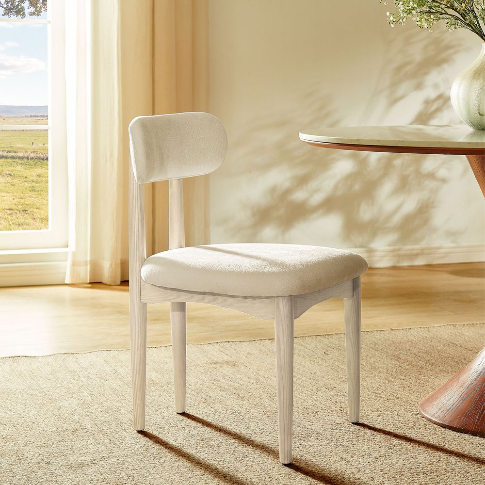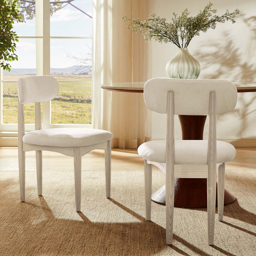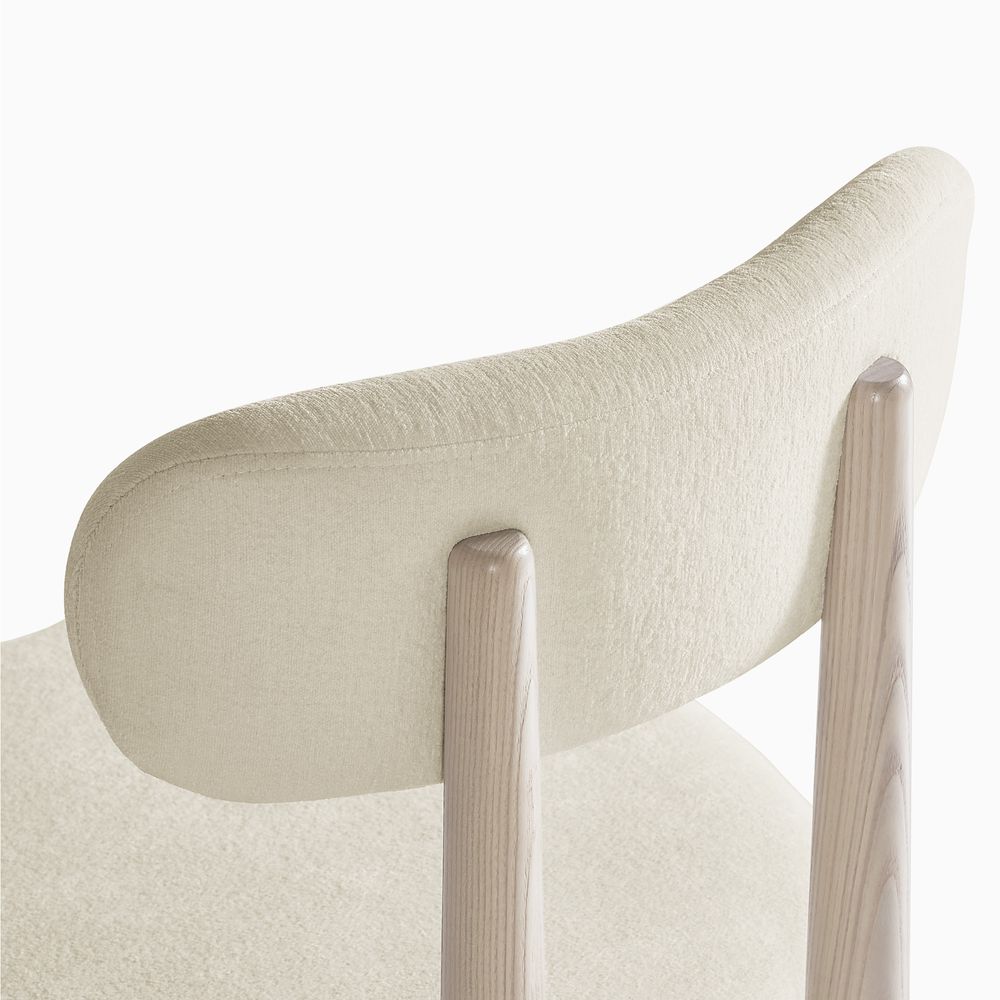 Inspired by European design, this chair features an embracing, curved back and soft white bouclé fabric for a luxurious, embracing feel. The solid wood frame and tapered legs blend vintage charm with modern comfort. Instantly elevate any space.