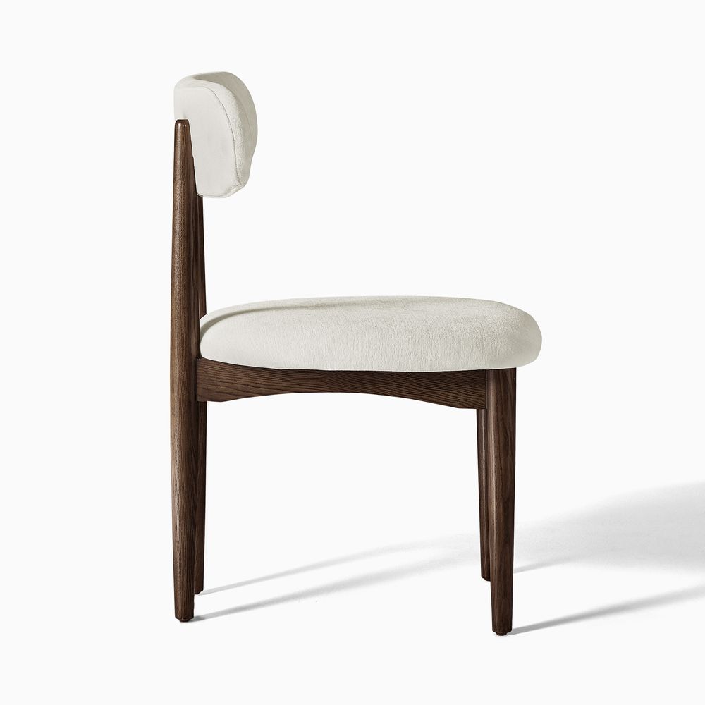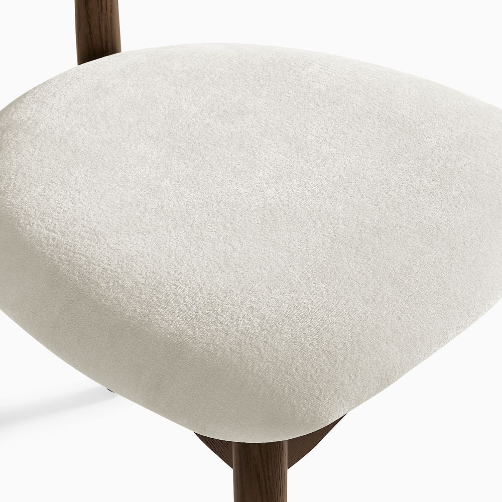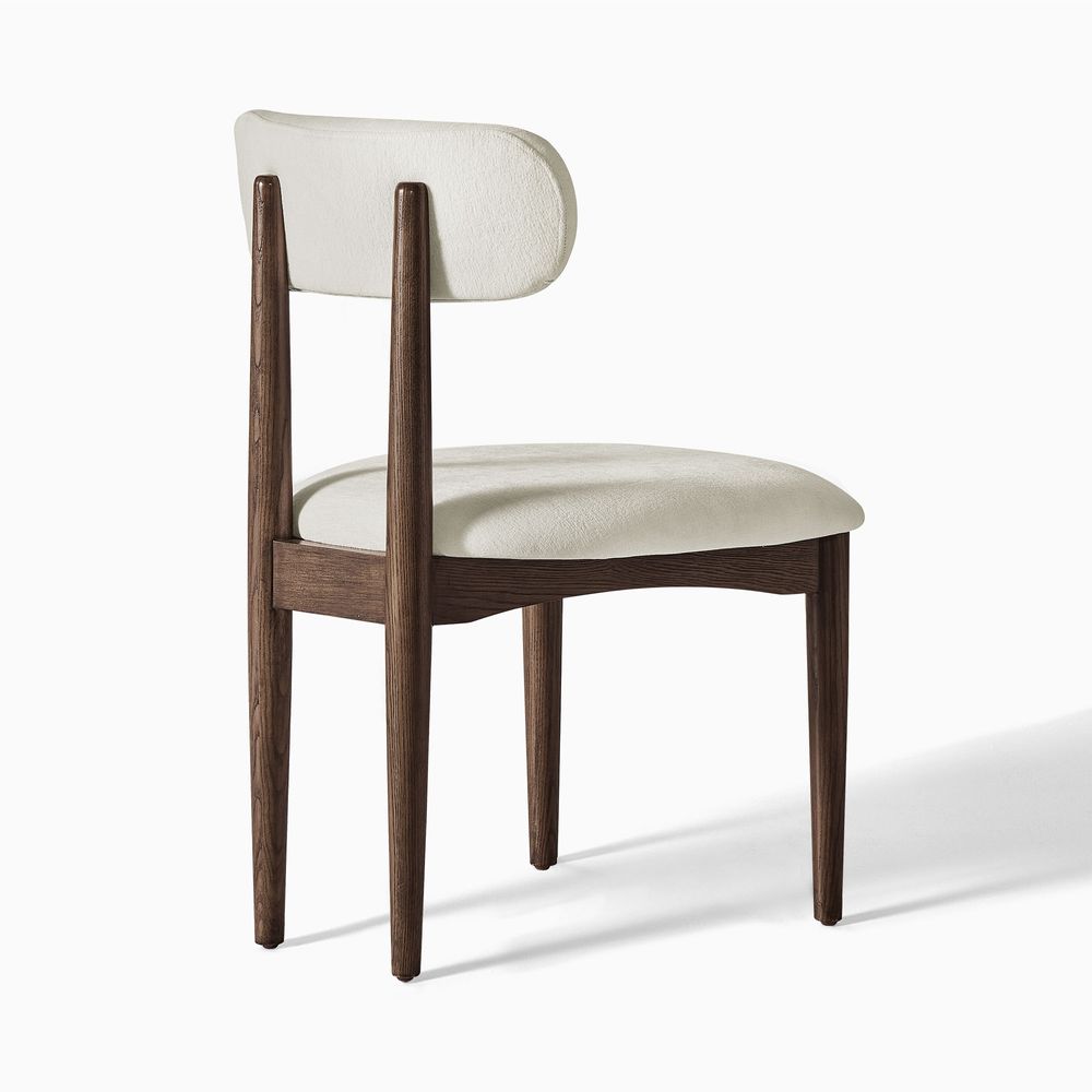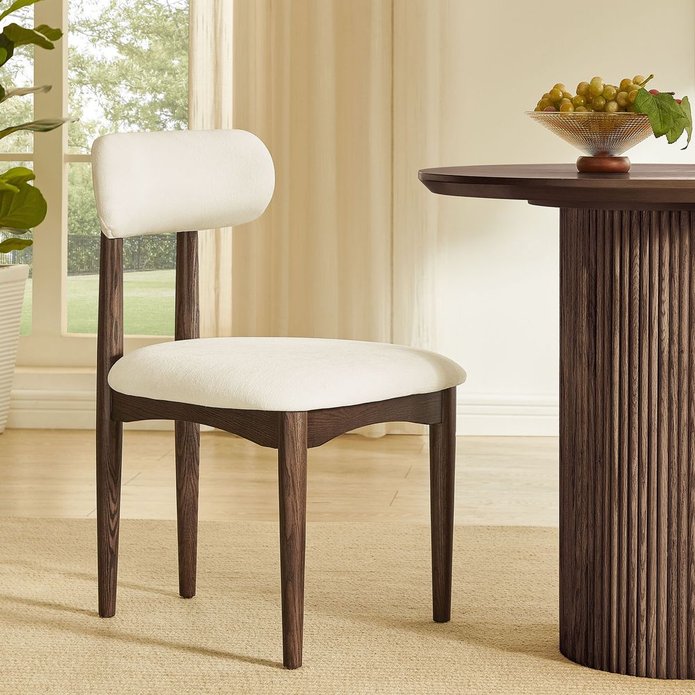 Inspired by European design, this chair features an embracing, curved back and soft white bouclé fabric for a luxurious, embracing feel. The solid wood frame and tapered legs blend vintage charm with modern comfort. Instantly elevate any space.