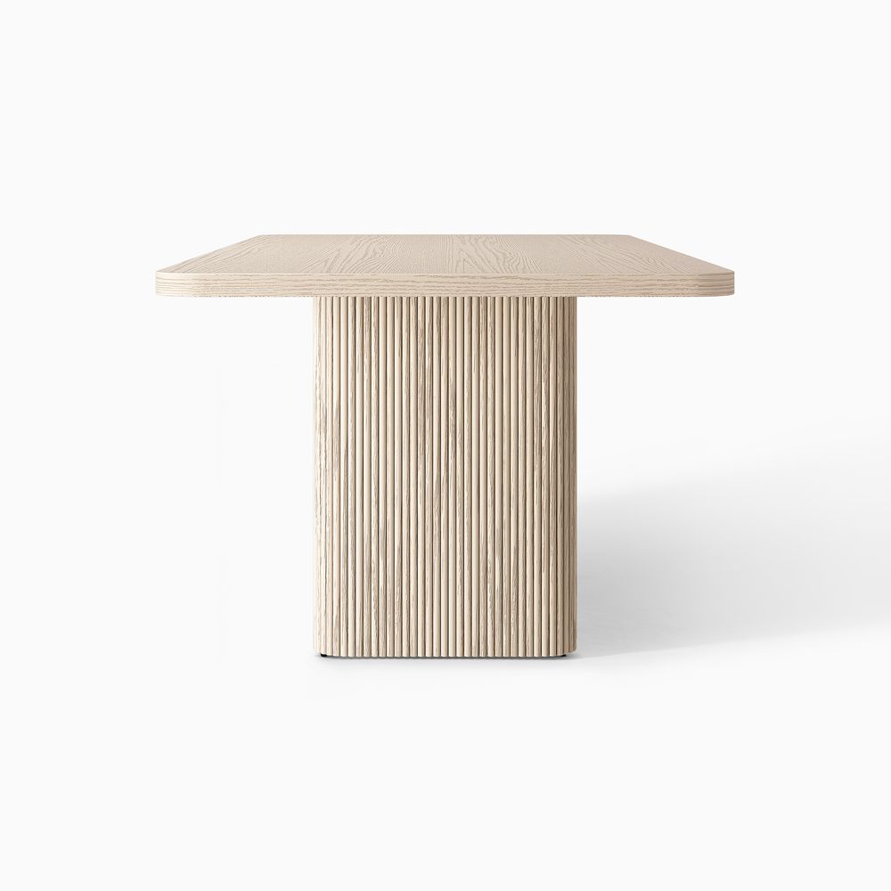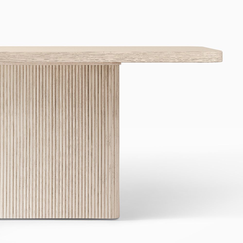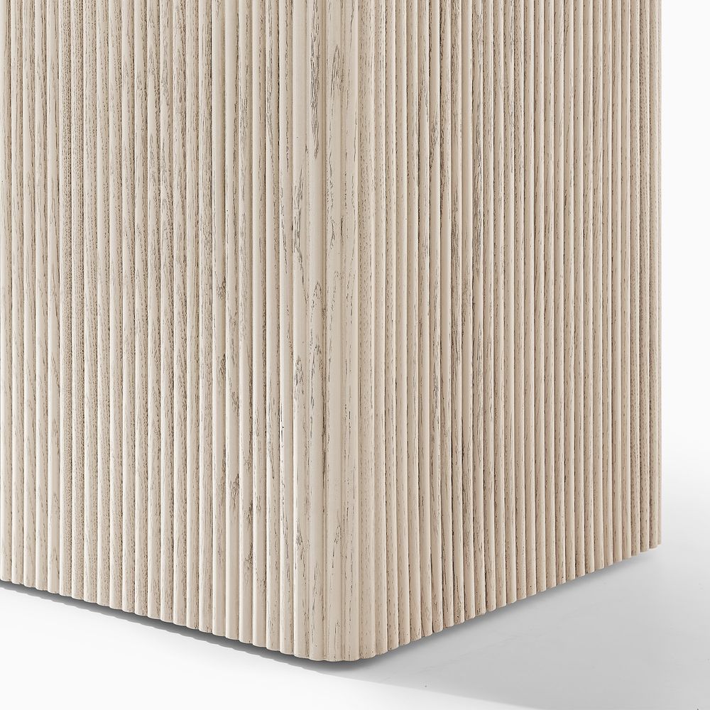 Eliseo features a minimalist design defined by clean lines and smooth radius corners that softly curve the base and top while maintaining a crisp silhouette. Vertical channel fluting wraps the substantial base, highlighting the natural variation in wood grain and color and bringing a sense of movement and liveliness to the design.