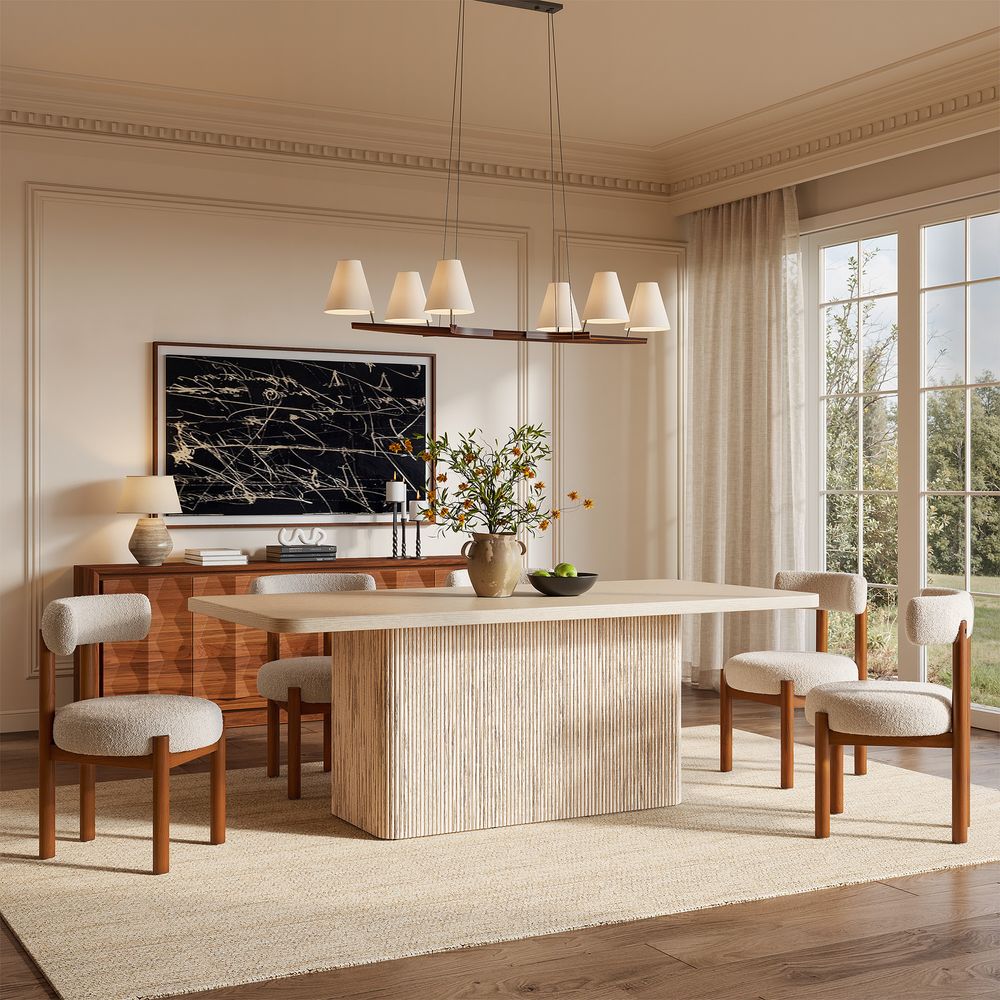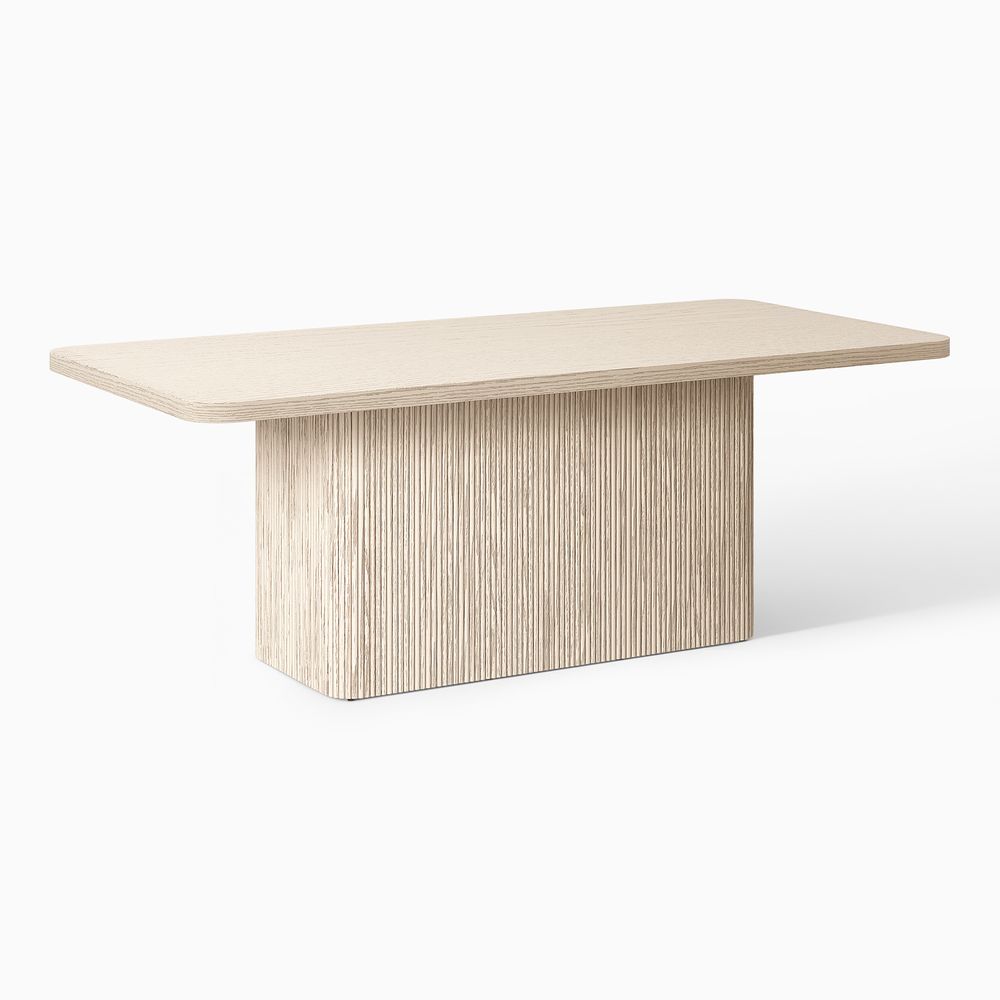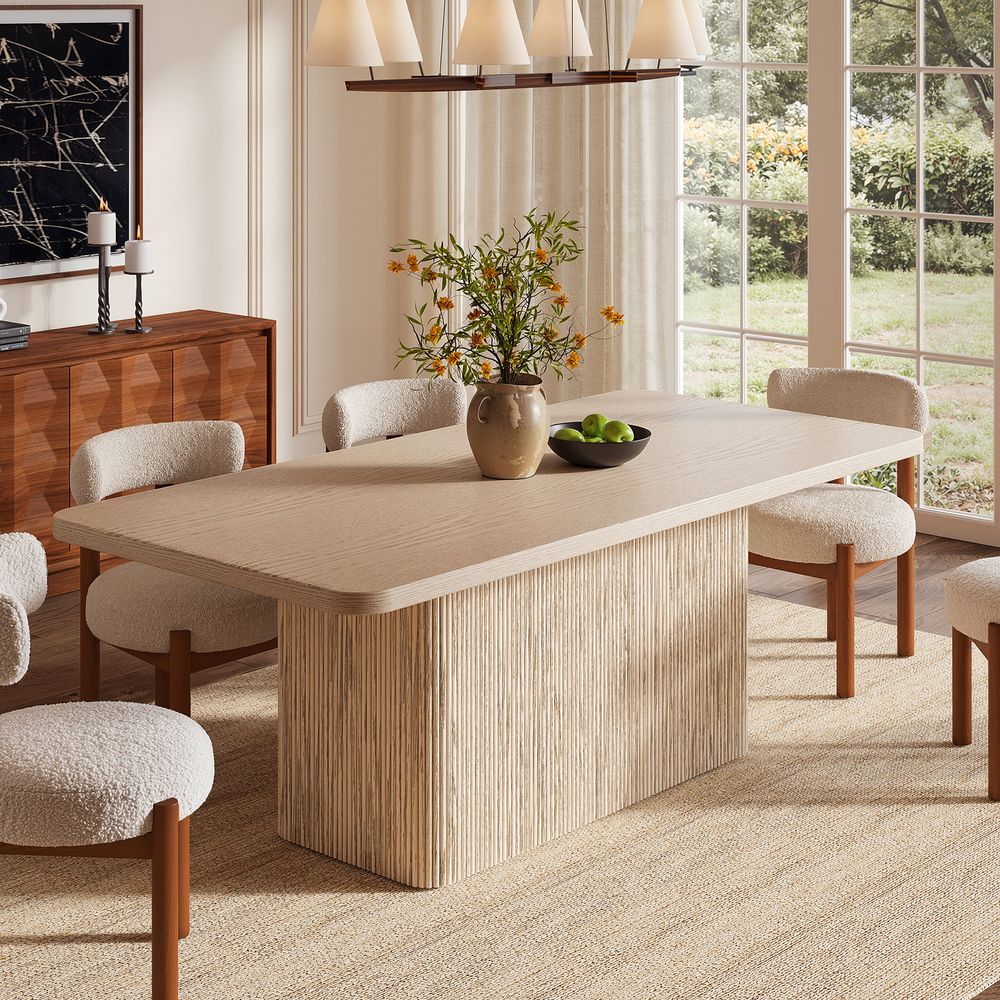 Crafted of American solid oak and plywood with oak veneer.All wood is kiln-dried for added durability.Wood glazing adds visual interest with greater depth and layering and enhances coloring.Solid wood fluting presents a natural texture.Tabletop is finished with radius corners.84" table comfortably seats 6-8.Color perception may vary due to wood characteristics, lighting, and devices. Wood grain variation is expected, as each is unique.
