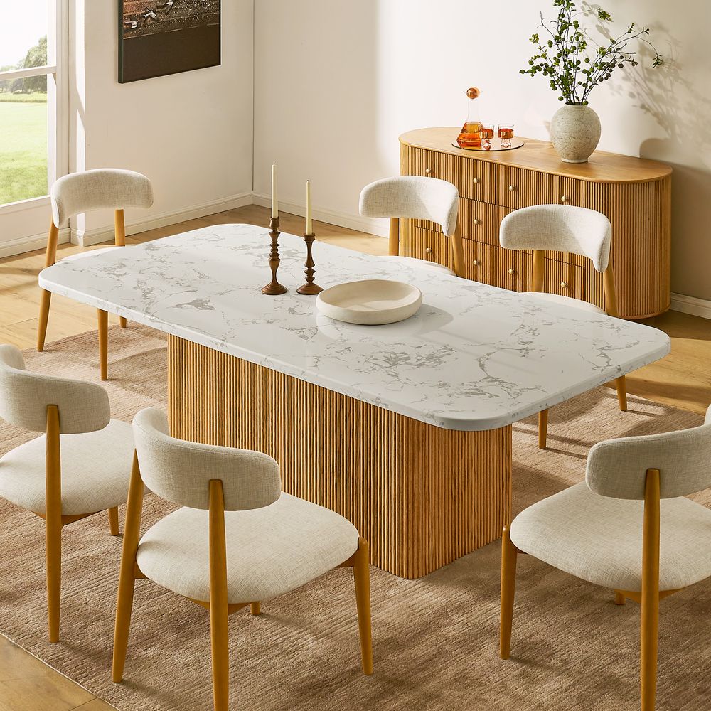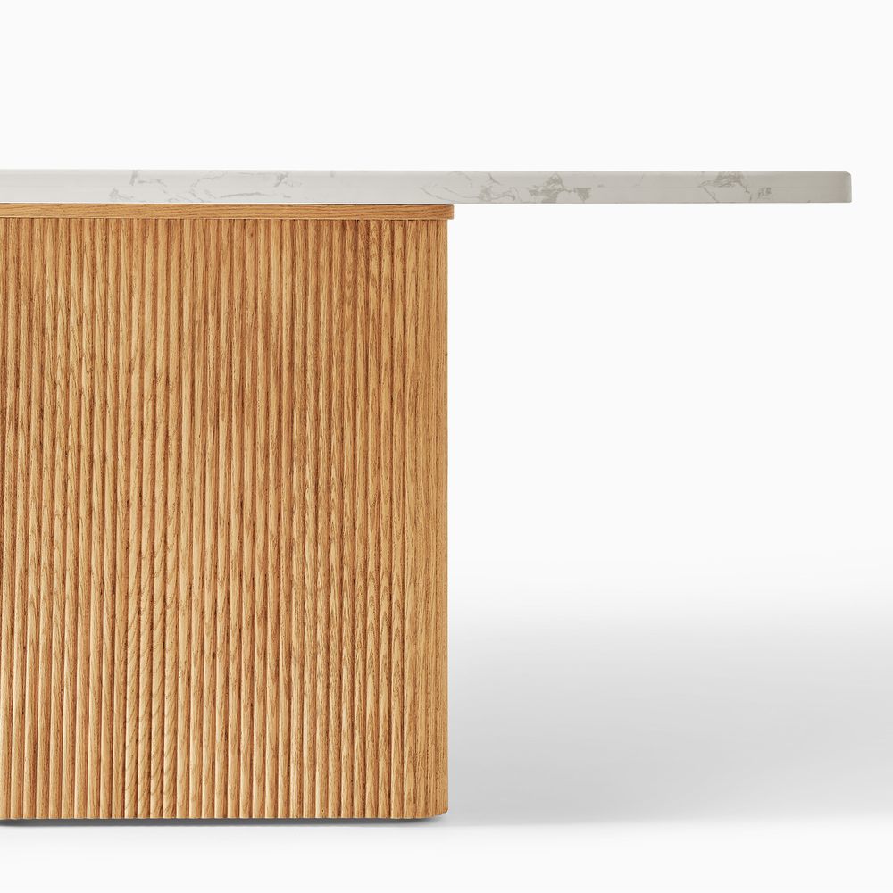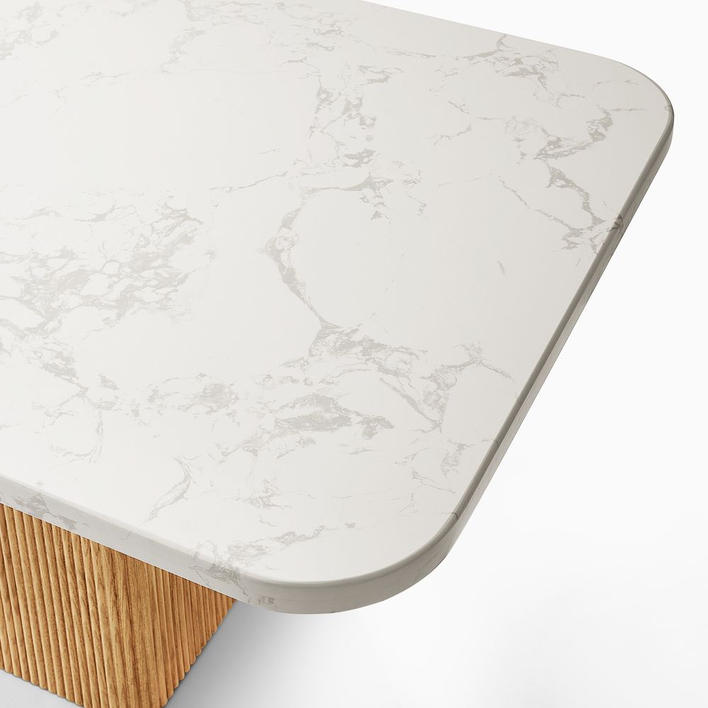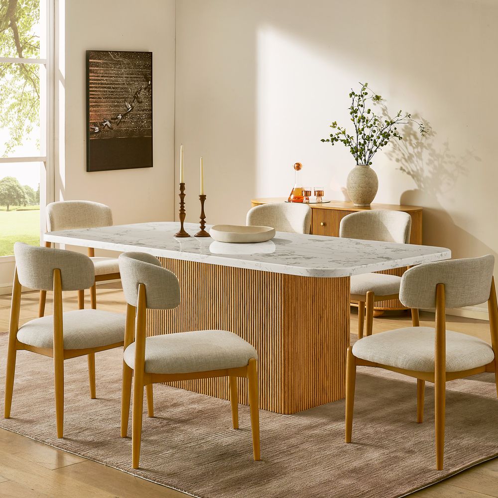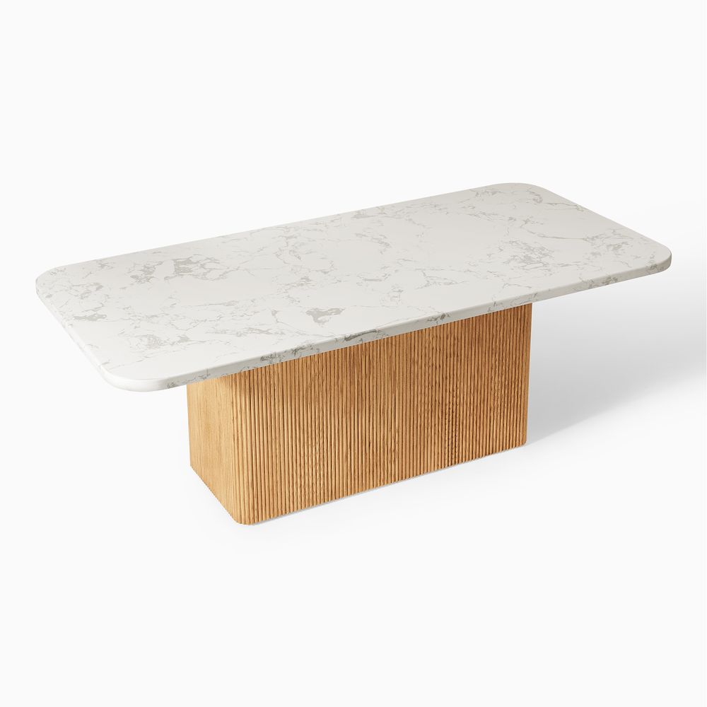 Crafted of engineered stone, American solid oak, and plywood with oak veneer.Tabletop is honed and sealed for a satin finish with deep veining and natural color contrasts.All wood is kiln-dried for added durability.Wood glazing adds visual interest with greater depth and layering and enhances coloring.Solid wood fluting presents a natural texture.Tabletop is finished with radius corners.84" table comfortably seats 6-8.Color perception may vary due to wood characteristics, lighting, and devices. Wood grain variation is expected, as each is unique.Variation in the veining of stone is to be expected, as each piece will be unique.