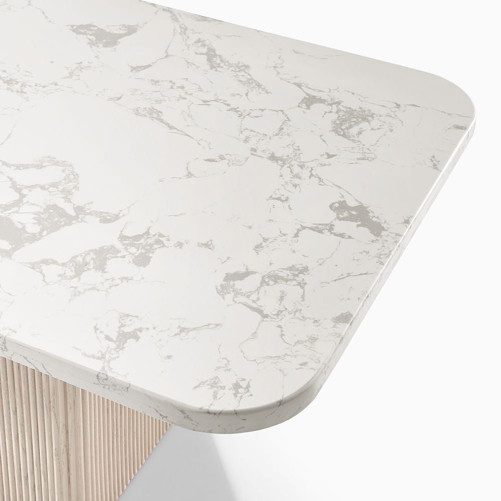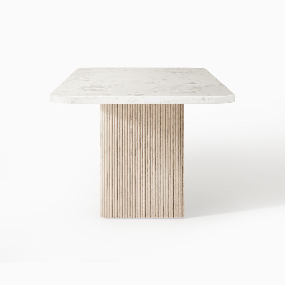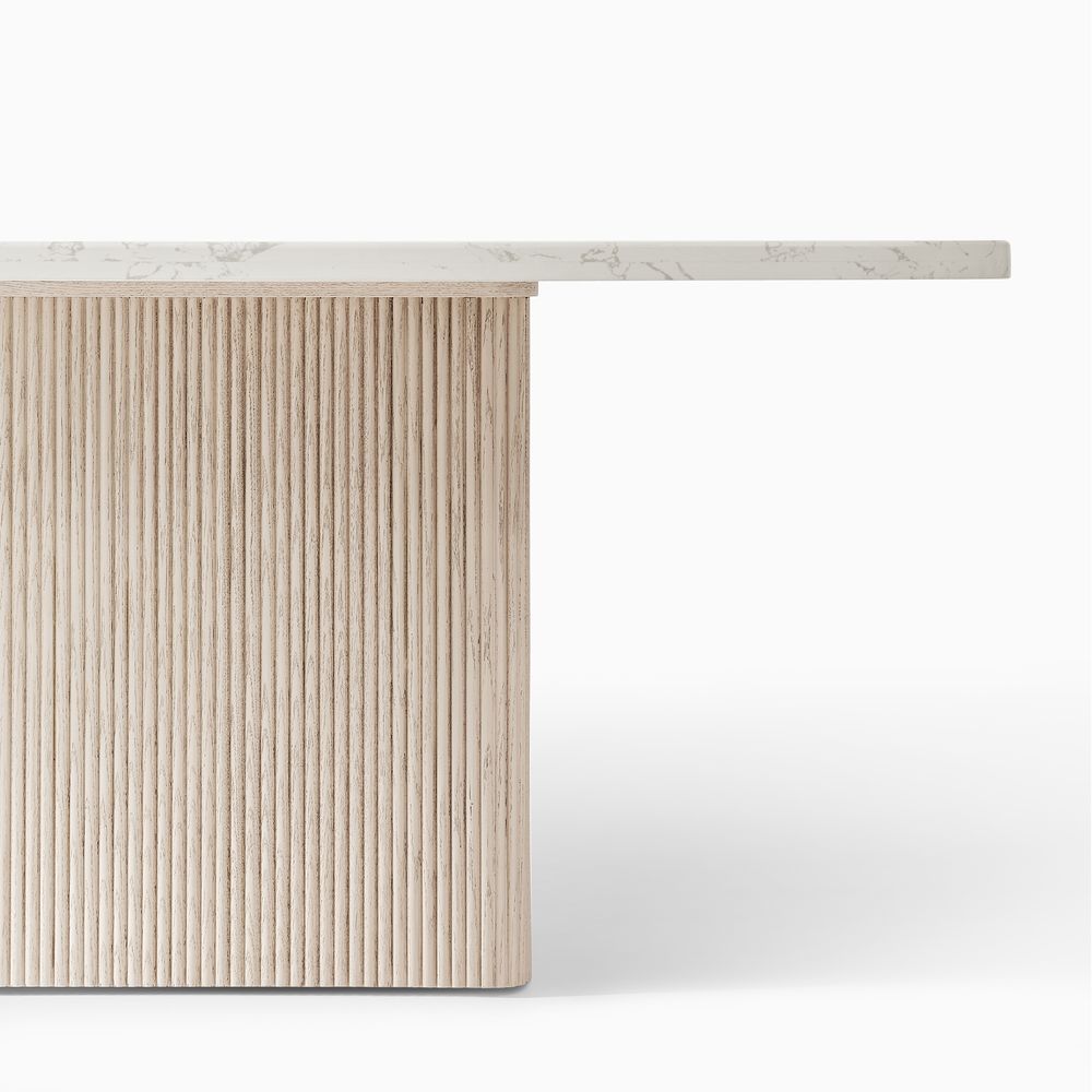Crafted of engineered stone, American solid oak, and plywood with oak veneer.Tabletop is honed and sealed for a satin finish with deep veining and natural color contrasts.All wood is kiln-dried for added durability.Wood glazing adds visual interest with greater depth and layering and enhances coloring.Solid wood fluting presents a natural texture.Tabletop is finished with radius corners.84" table comfortably seats 6-8.Color perception may vary due to wood characteristics, lighting, and devices. Wood grain variation is expected, as each is unique.Variation in the veining of stone is to be expected, as each piece will be unique.