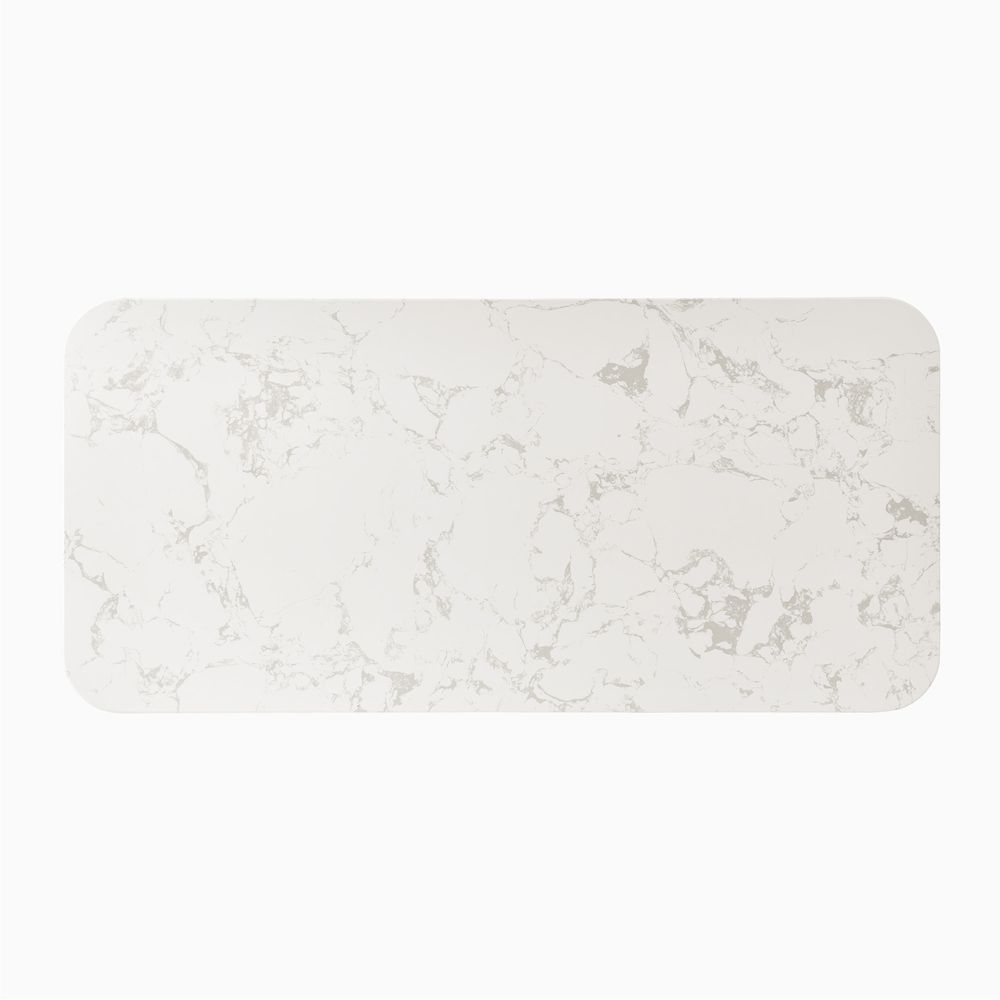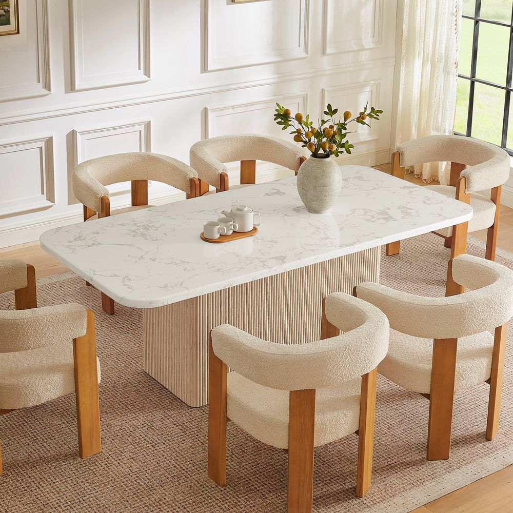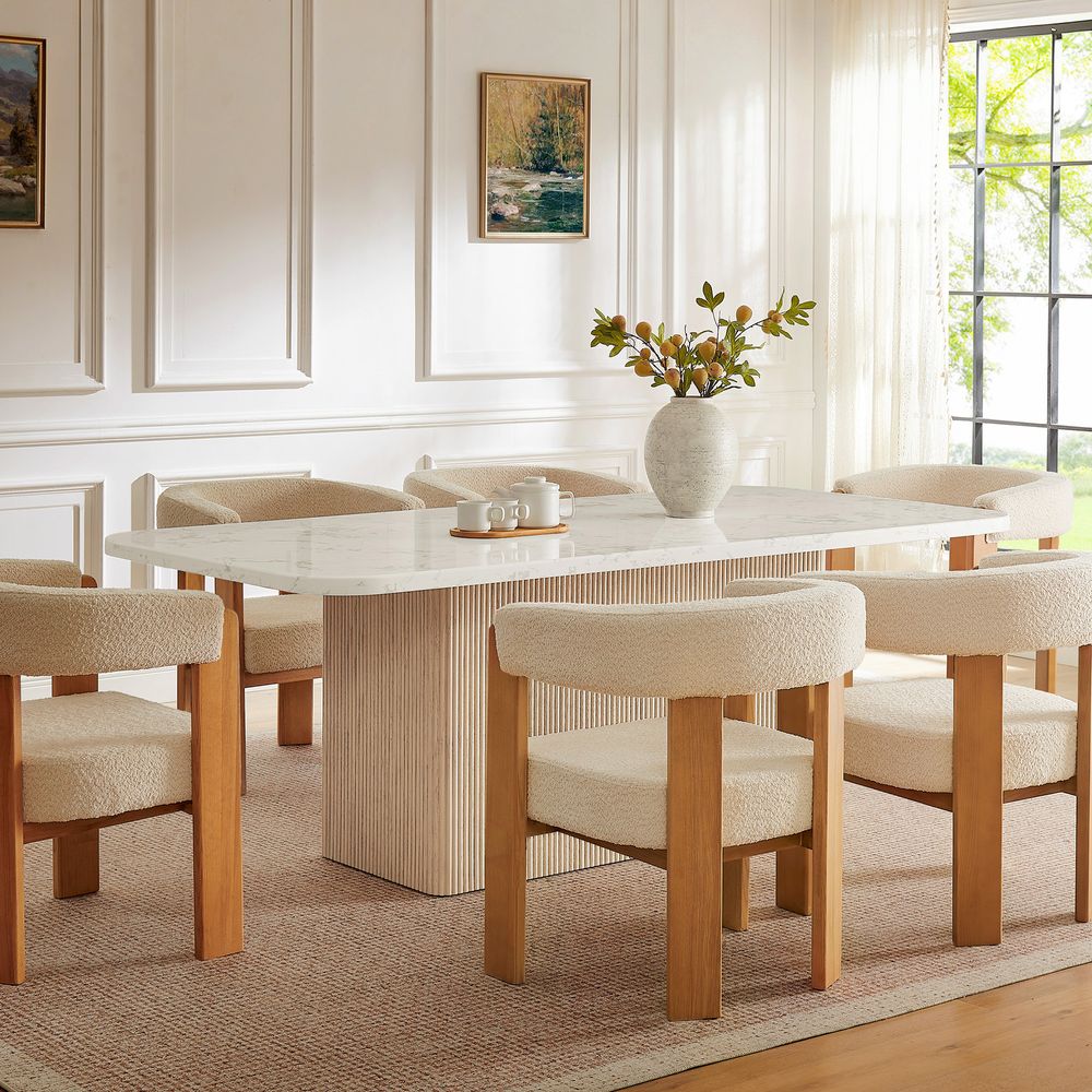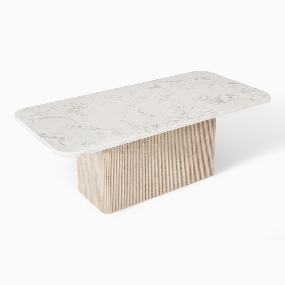 Crafted of engineered stone, American solid oak, and plywood with oak veneer.Tabletop is honed and sealed for a satin finish with deep veining and natural color contrasts.All wood is kiln-dried for added durability.Wood glazing adds visual interest with greater depth and layering and enhances coloring.Solid wood fluting presents a natural texture.Tabletop is finished with radius corners.84" table comfortably seats 6-8.Color perception may vary due to wood characteristics, lighting, and devices. Wood grain variation is expected, as each is unique.Variation in the veining of stone is to be expected, as each piece will be unique.