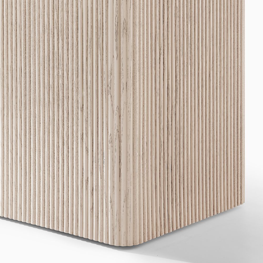 Eliseo features a minimalist design defined by clean lines and smooth radius corners that softly curve the base and top while maintaining a crisp silhouette. Vertical channel fluting wraps the substantial base, highlighting the natural variation in wood grain and color and bringing a sense of movement and liveliness to the design.