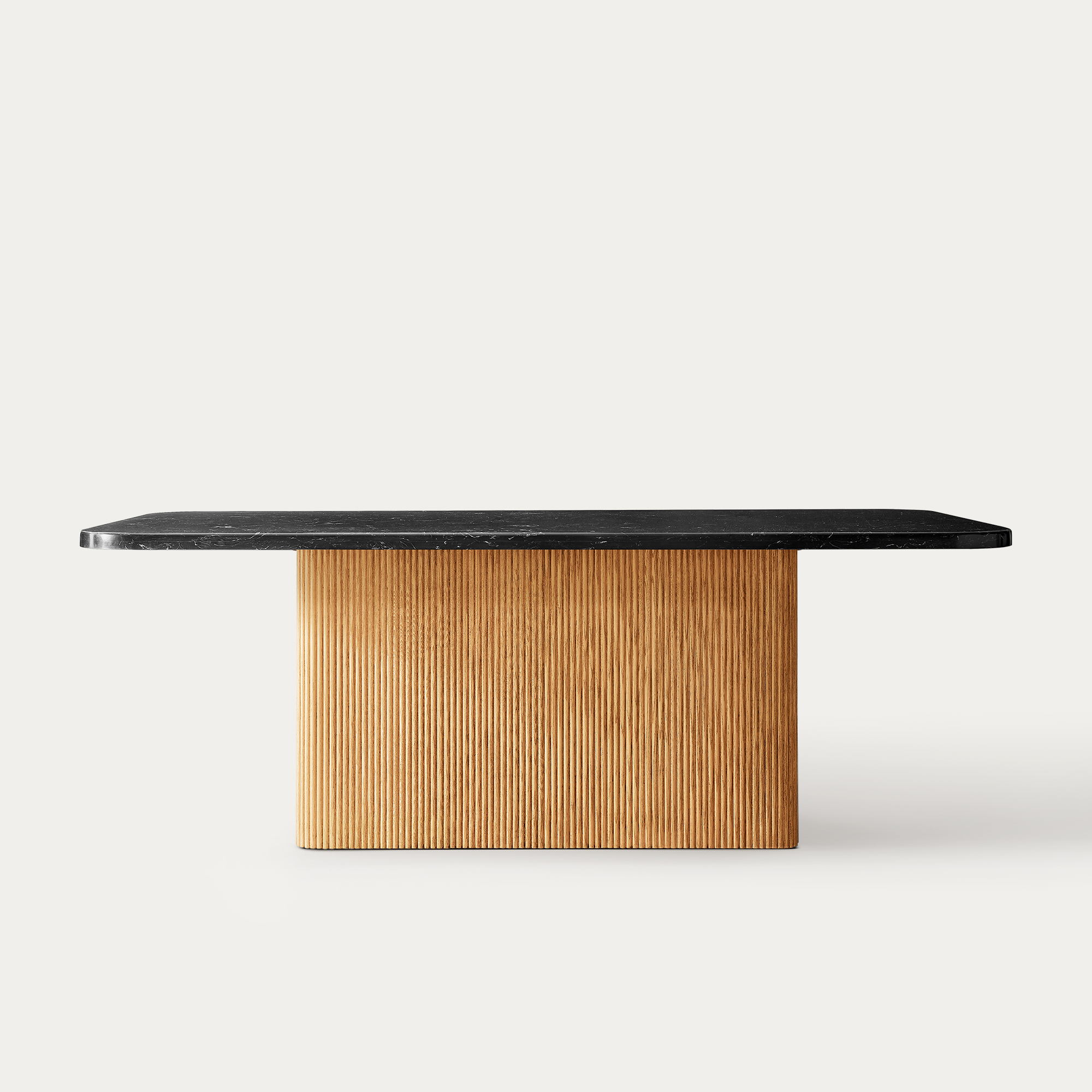 Eliseo features a minimalist design defined by clean lines and smooth radius corners that softly curve the base and top while maintaining a crisp silhouette. Vertical channel fluting wraps the substantial base, highlighting the natural variation in wood grain and color and bringing a sense of movement and liveliness to the design.