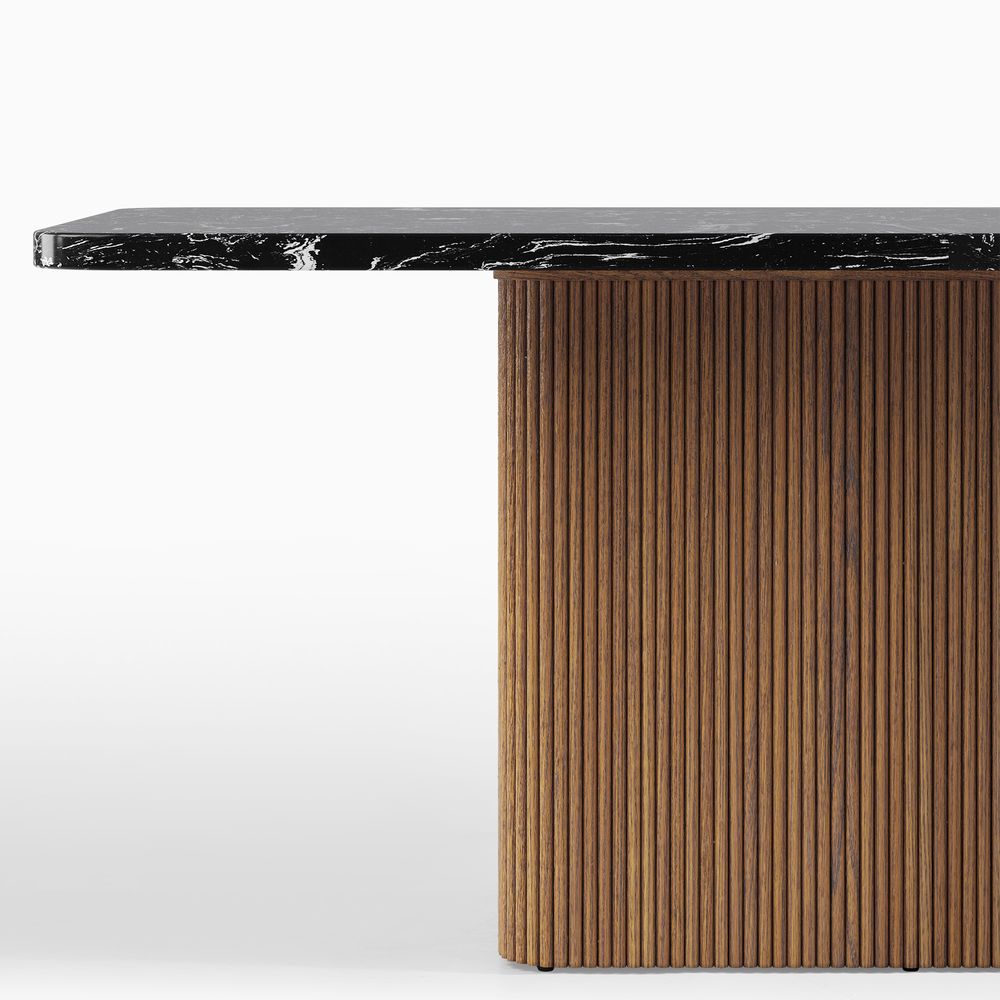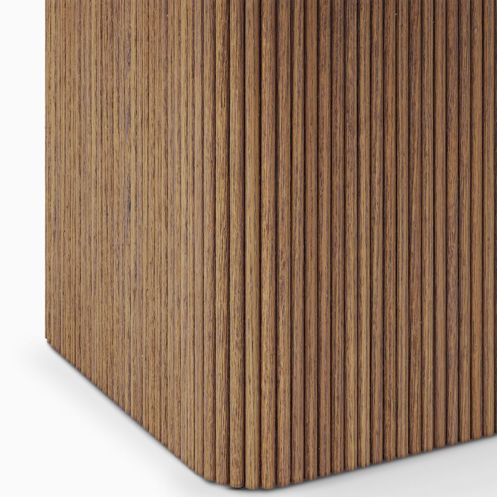 Eliseo features a minimalist design defined by clean lines and smooth radius corners that softly curve the base and top while maintaining a crisp silhouette. Vertical channel fluting wraps the substantial base, highlighting the natural variation in wood grain and color and bringing a sense of movement and liveliness to the design.