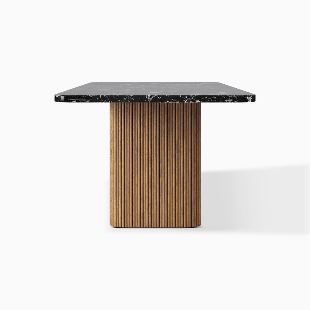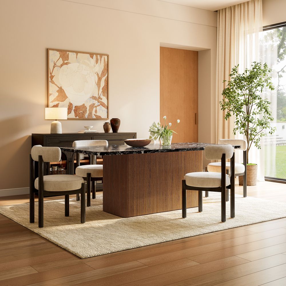 Crafted of engineered stone, American solid oak, and plywood with oak veneer.Tabletop is honed and sealed for a satin finish with deep veining and natural color contrasts.All wood is kiln-dried for added durability.Wood glazing adds visual interest with greater depth and layering and enhances coloring.Solid wood fluting presents a natural texture.Tabletop is finished with radius corners.84" table comfortably seats 6-8.Color perception may vary due to wood characteristics, lighting, and devices. Wood grain variation is expected, as each is unique.Variation in the veining of stone is to be expected, as each piece will be unique.