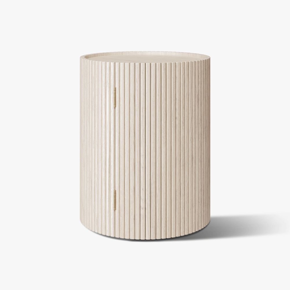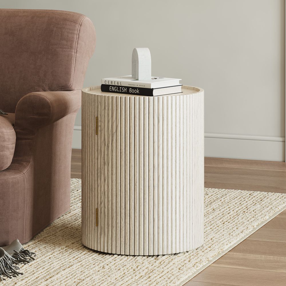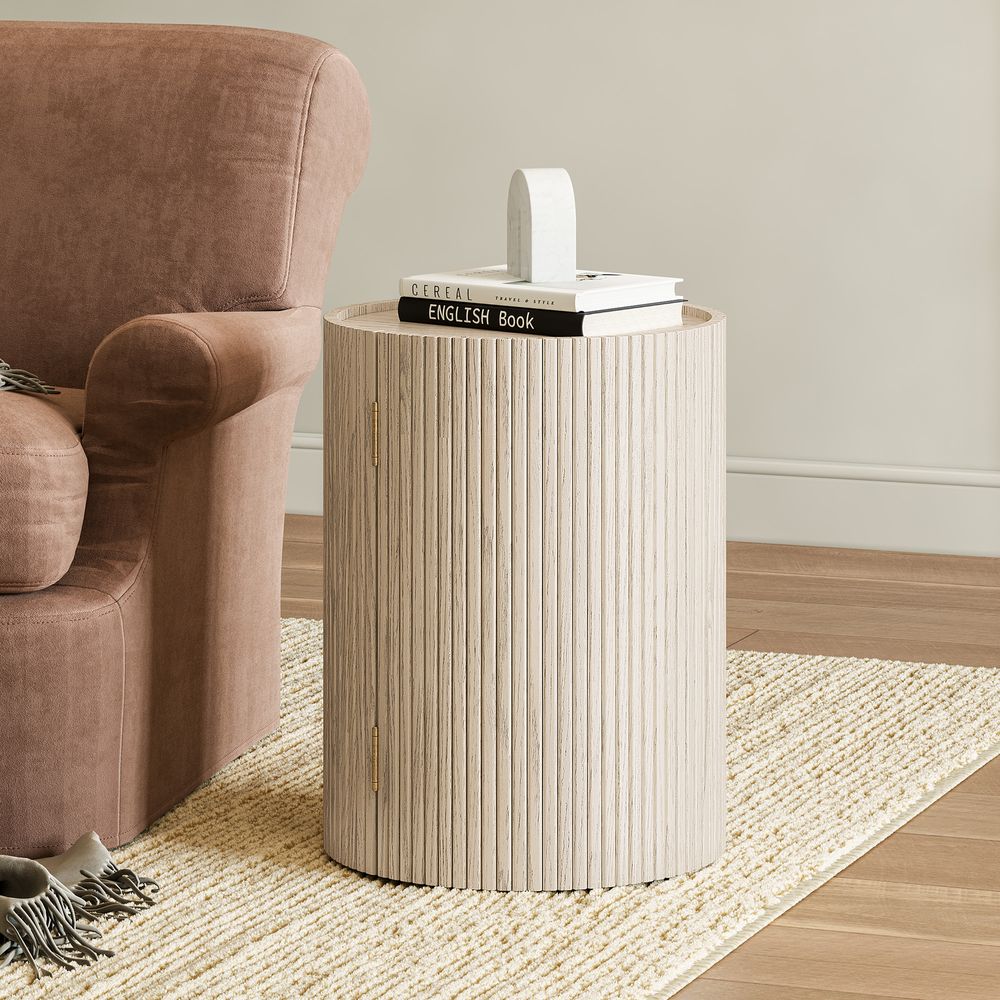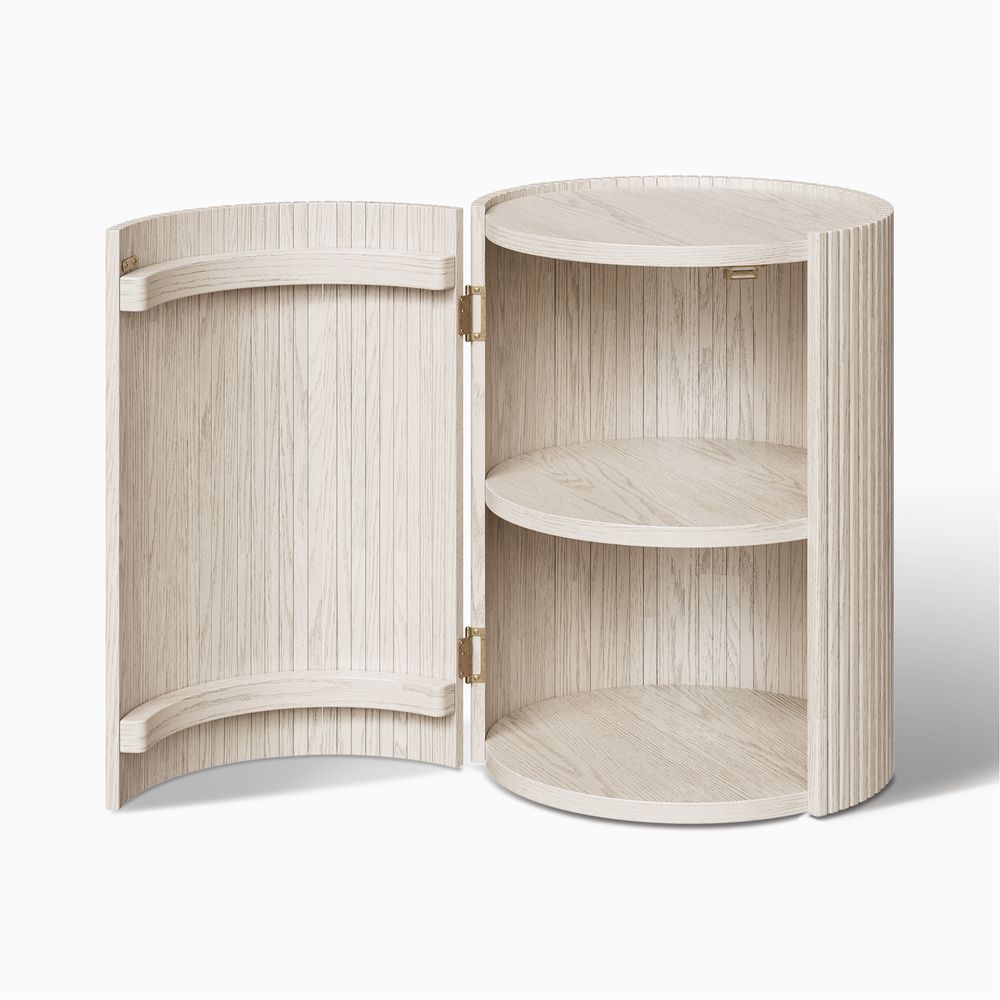 Elliot side table combines functionality with aesthetic appeal, featuring a rich wooden finish and elegant fluted detailing. The round shape and concealed storage offer practicality, while the open shelves provide space for displaying decor. Its harmonious blend of form and function makes it a perfect addition to any living space, exuding warmth and sophistication.