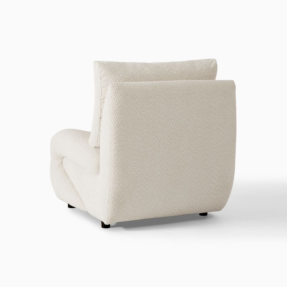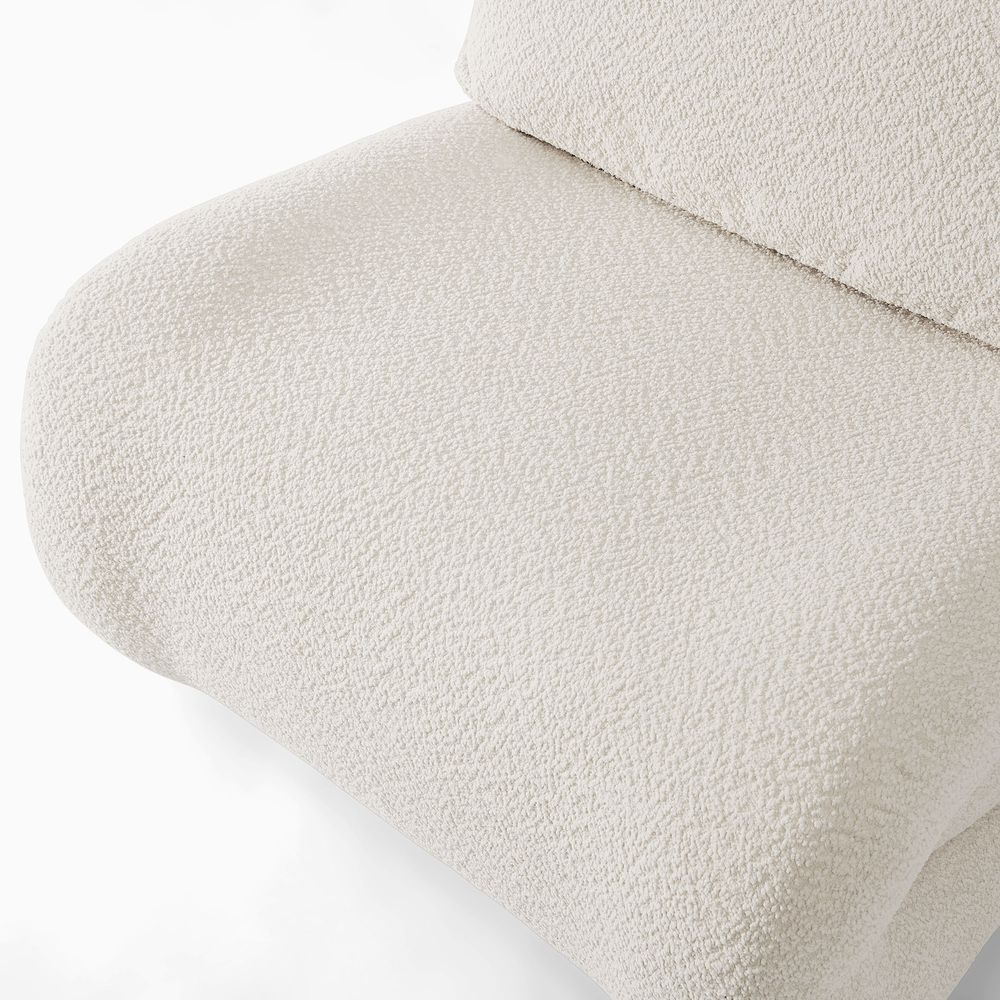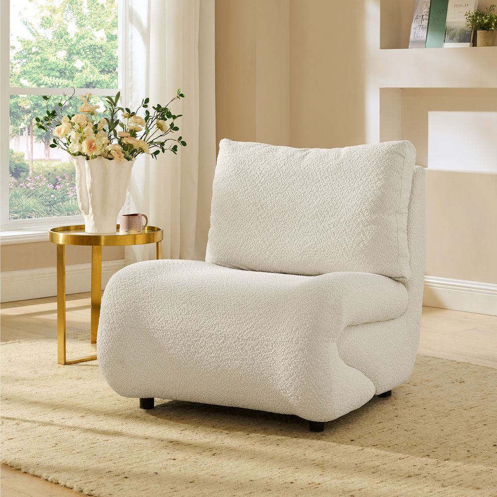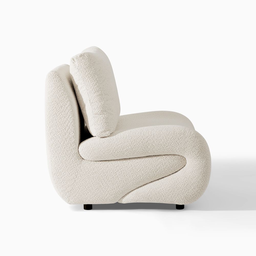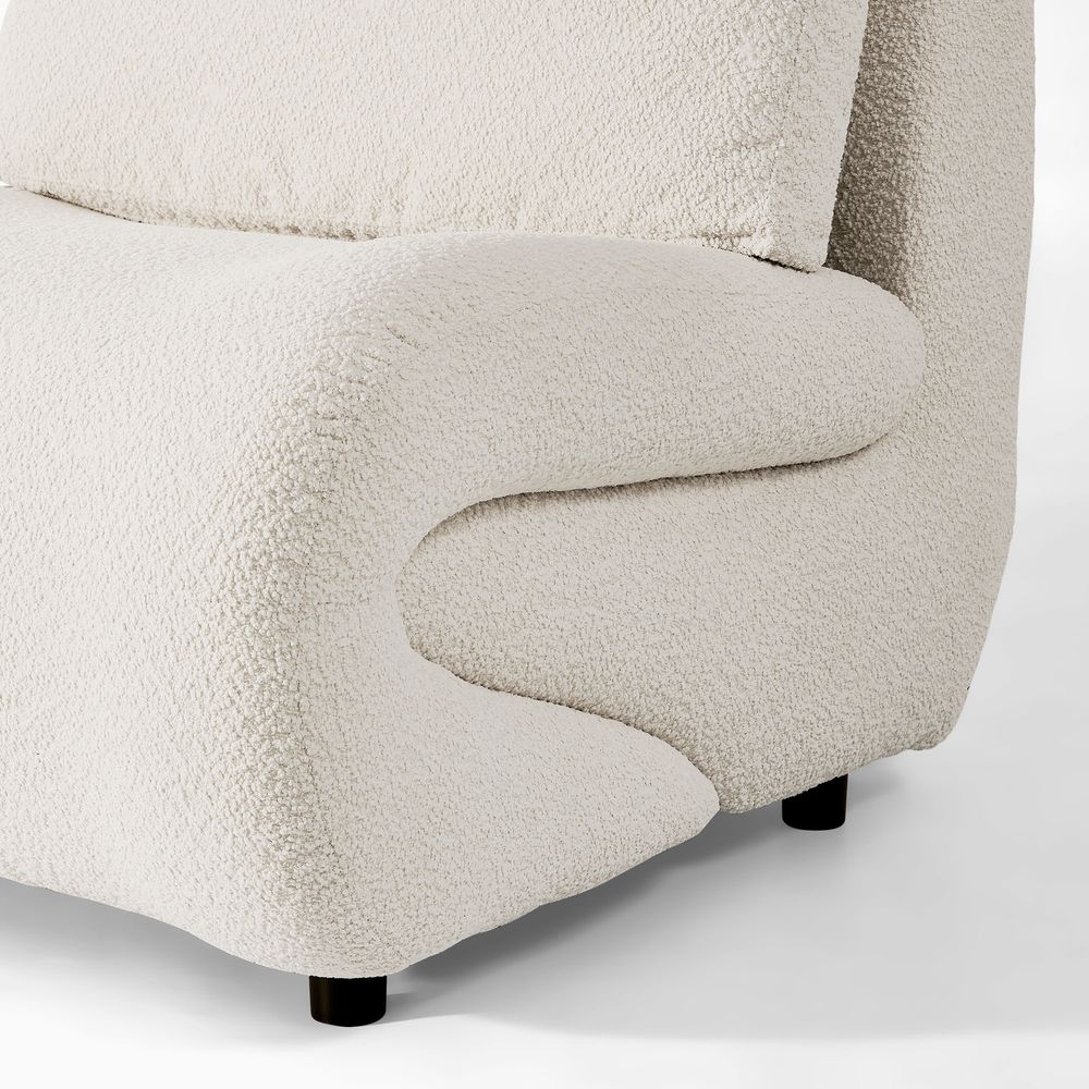 Elysian inviting leisure chair features a unique, curved silhouette and a comfortable, cushioned design. Upholstered in a textured linen fabric, it offers a soft and natural feel. Perfect for lounging and relaxation, this piece would make a stylish and cozy addition to any living space.