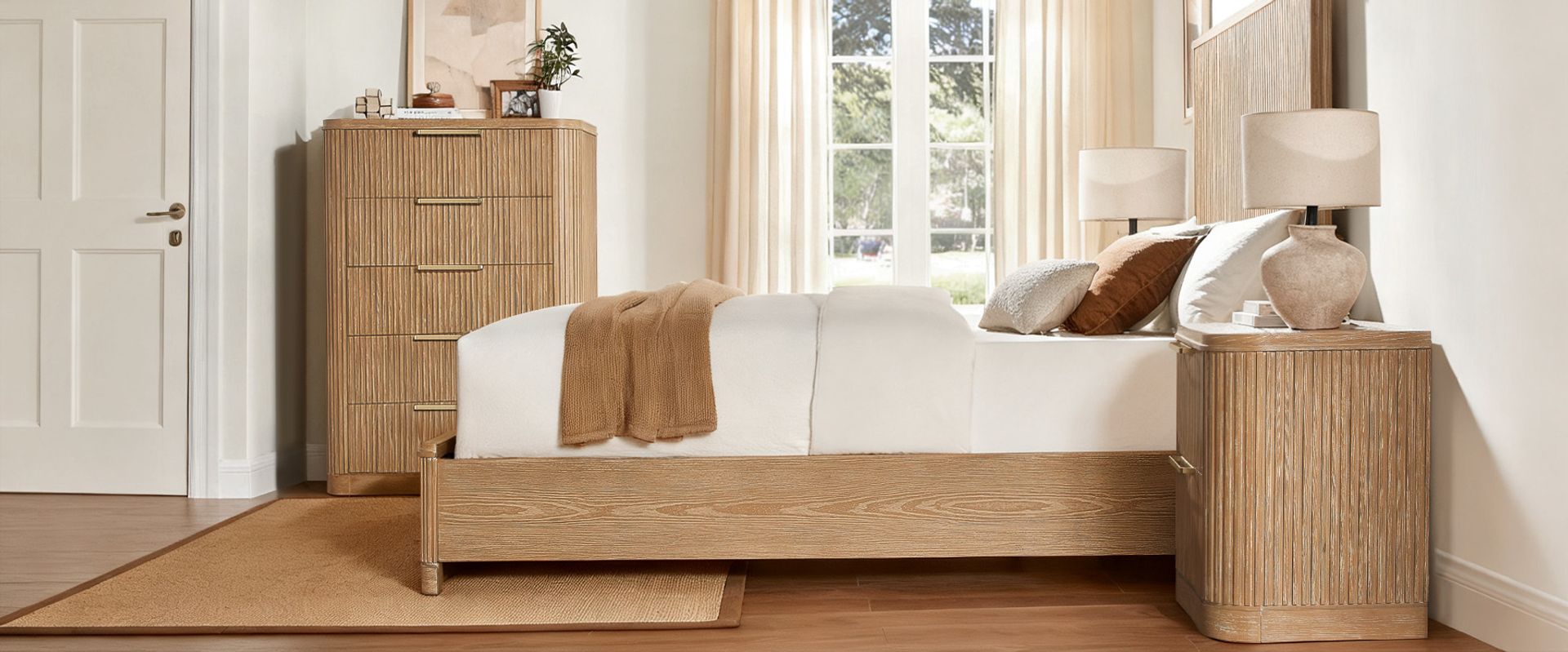 Finnley bedroom collection artfully merges modern sophistication with vintage maximalist charm. Crafted from rich poplar wood veneer and a poplar wood frame, it provides lasting durability and timeless elegance. Featuring a striking vertical fluted design, this refined collection enhances any space with a harmonious blend of bold style and meticulous craftsmanship.