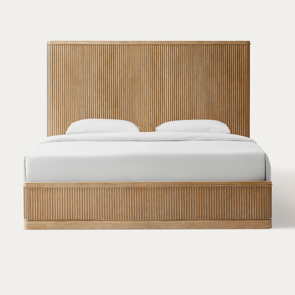 Crafted of solid tulipwood and engineered wood with tulipwood veneers.All wood is kiln-dried for added durability.Finish is achieved through multistep process in which wood is wire brushed to highlight its rich grain.Wood glazing adds visual interest with greater depth and layering and enhances coloring.Solid wood fluting presents a natural texture.Include 10 middle support legs.Bed accommodates most standard mattresses, box spring optional, supporting up to 800 lbs.Color perception may vary due to wood characteristics, lighting, and devices. Wood grain variation is expected, as each is unique.