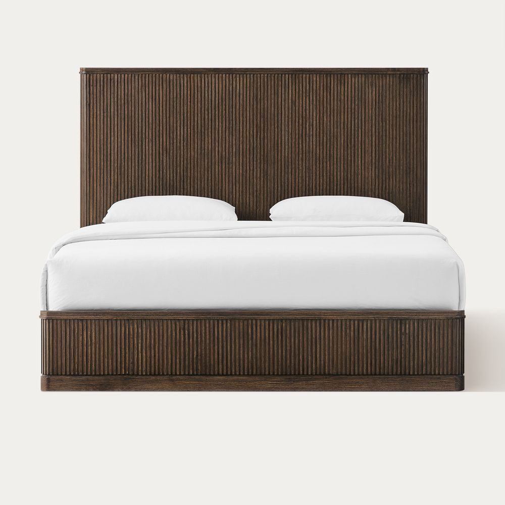 Crafted of solid tulipwood and engineered wood with tulipwood veneers.All wood is kiln-dried for added durability.Finish is achieved through multistep process in which wood is wire brushed to highlight its rich grain.Wood glazing adds visual interest with greater depth and layering and enhances coloring.Solid wood fluting presents a natural texture.Include 10 middle support legs.Bed accommodates most standard mattresses, box spring optional, supporting up to 800 lbs.Color perception may vary due to wood characteristics, lighting, and devices. Wood grain variation is expected, as each is unique.