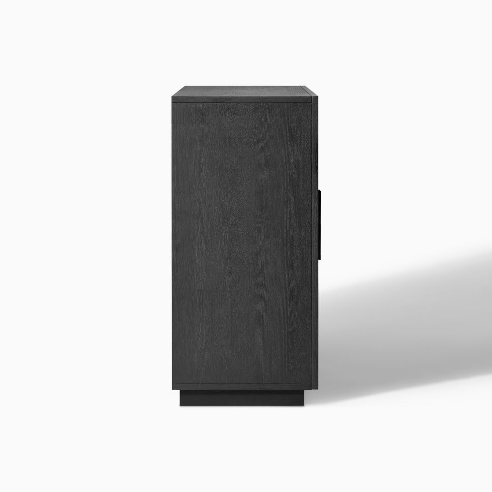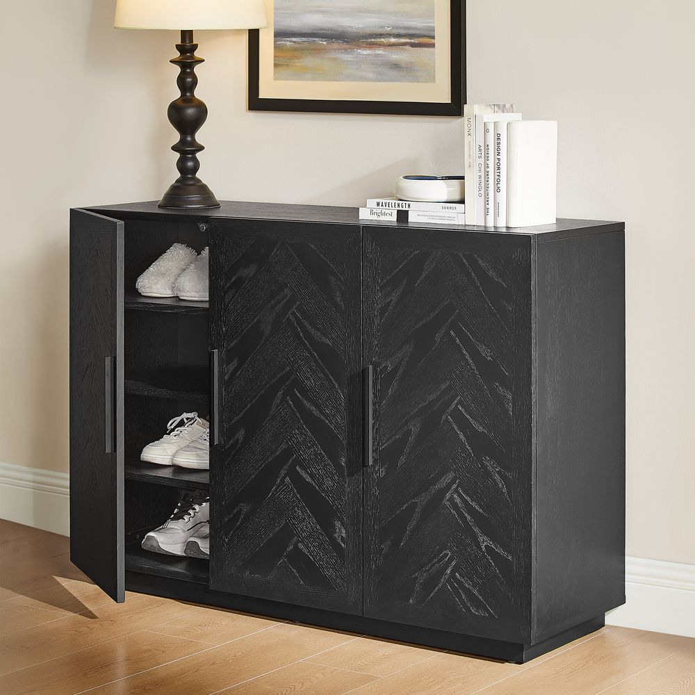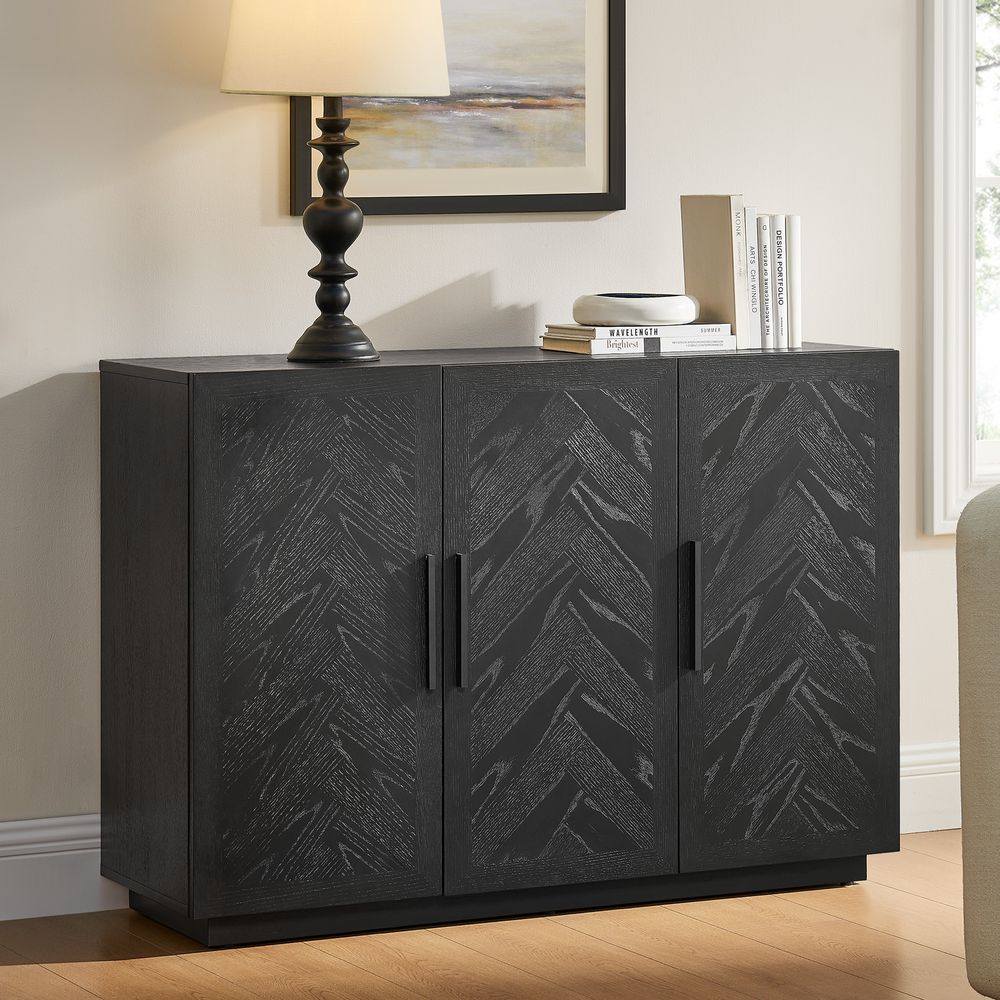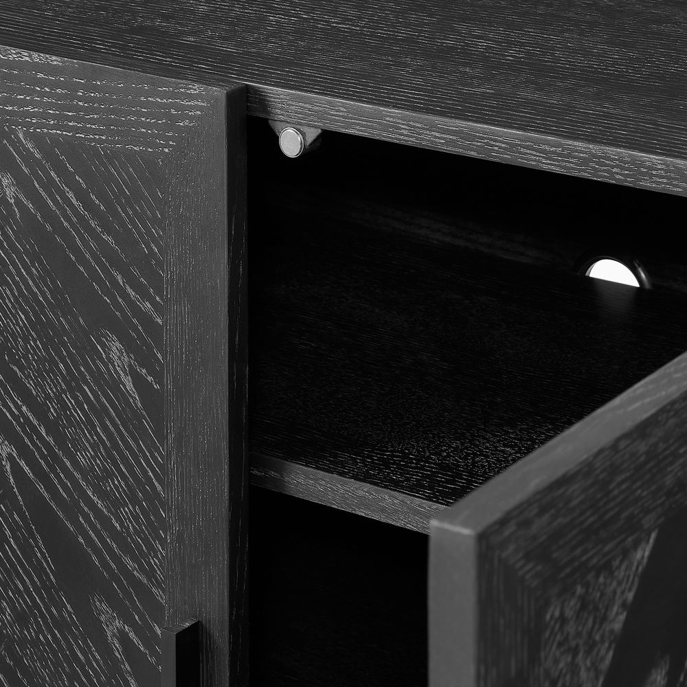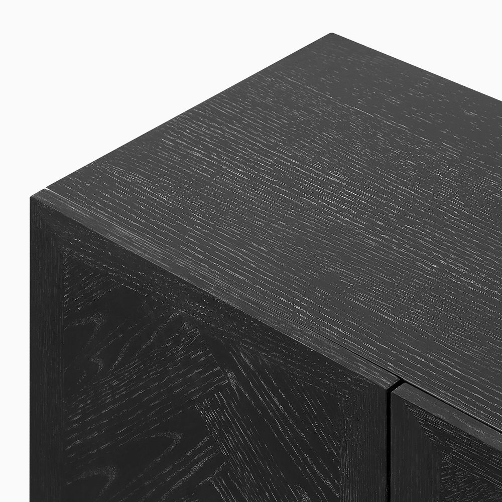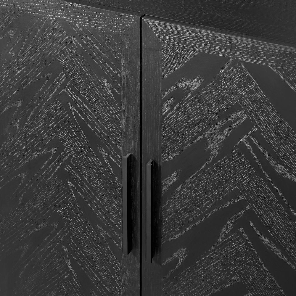 Inspired by the beauty of chevron and herringbone patterns, the Fiske collection features furniture with textured wood and intricate designs that merge functionality with artistic flair, offering spacious storage and a striking visual appeal.