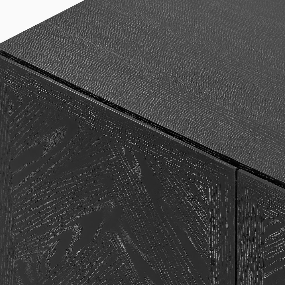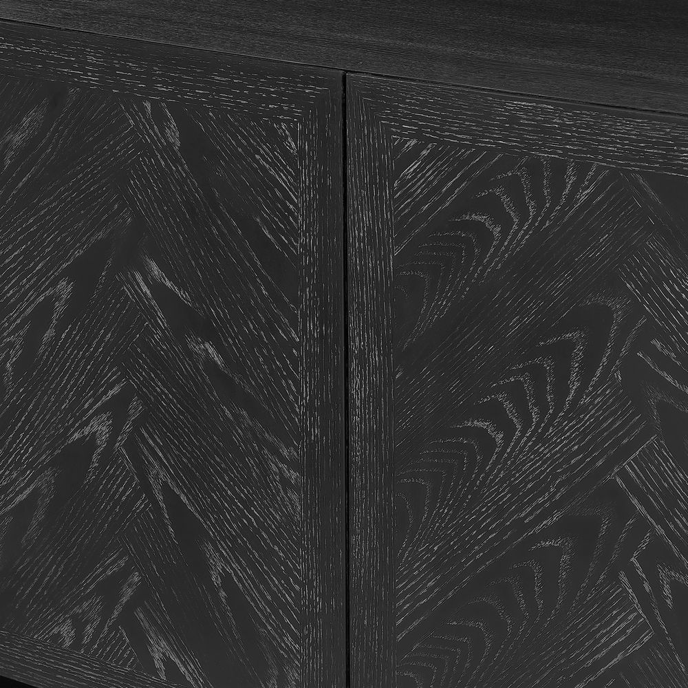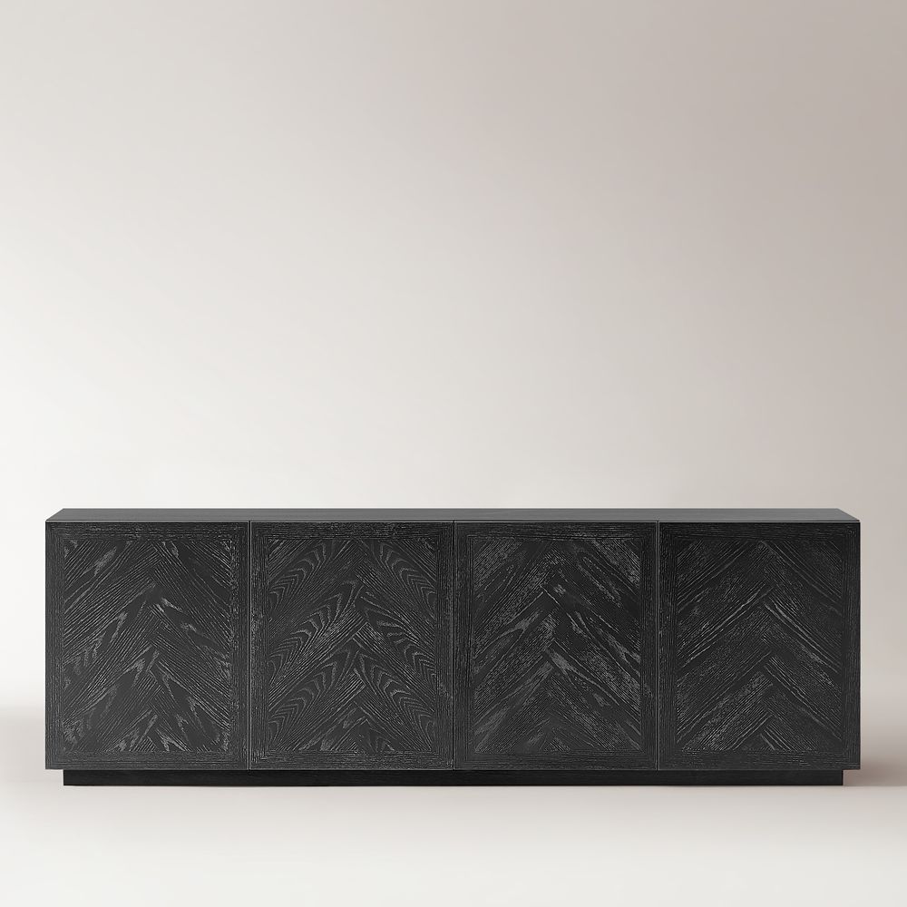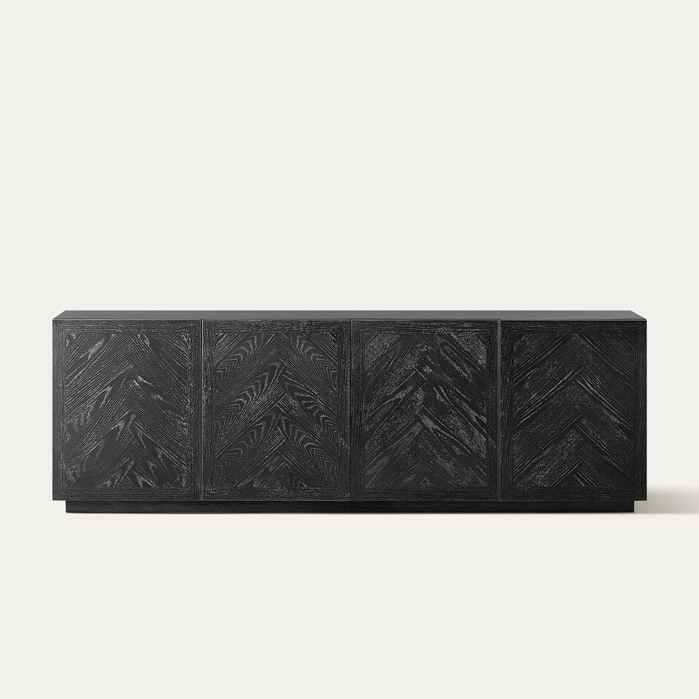 Inspired by the beauty of chevron and herringbone patterns, the Fiske collection features furniture with textured wood and intricate designs that merge functionality with artistic flair, offering spacious storage and a striking visual appeal.