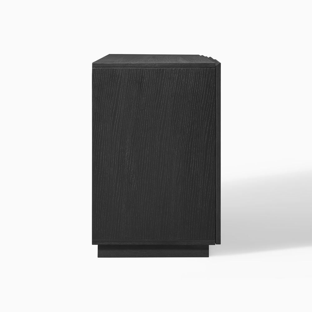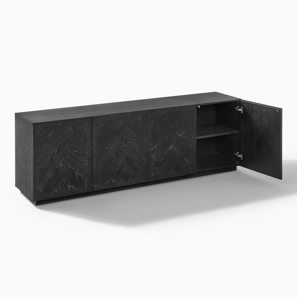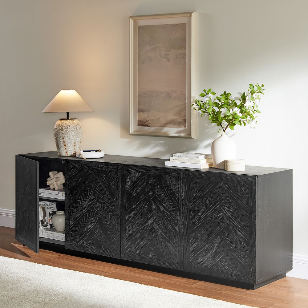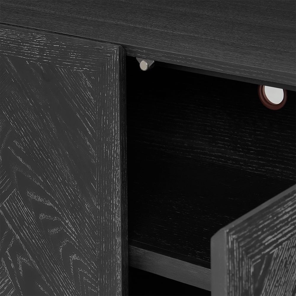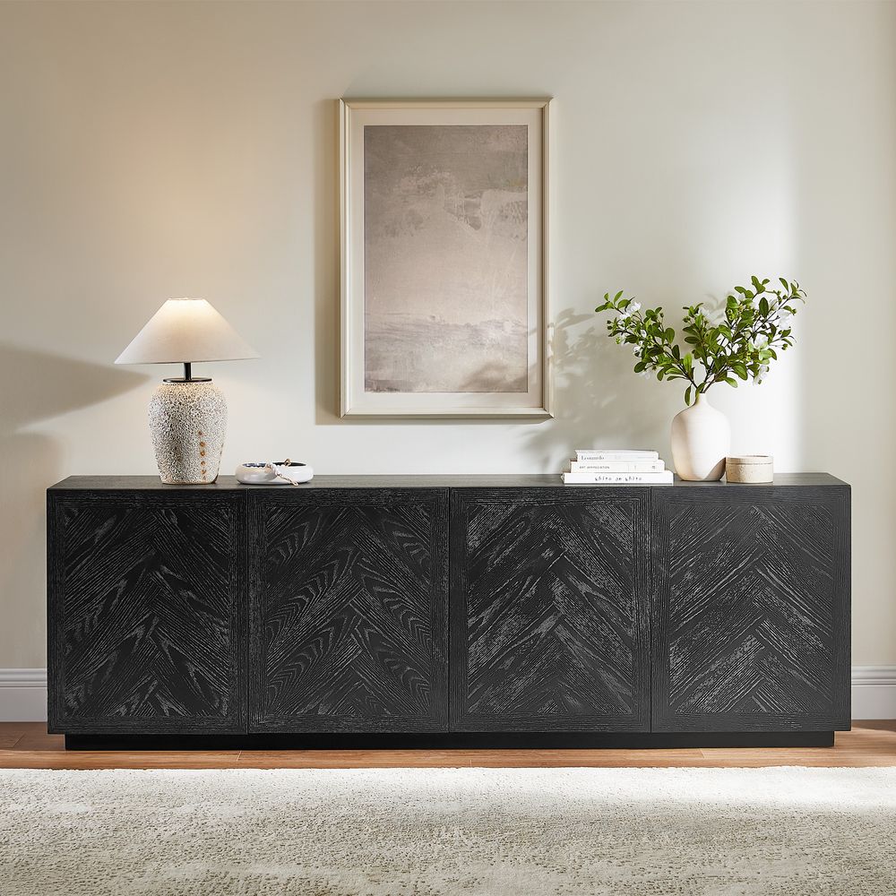 Inspired by the beauty of chevron and herringbone patterns, the Fiske collection features furniture with textured wood and intricate designs that merge functionality with artistic flair, offering spacious storage and a striking visual appeal.
