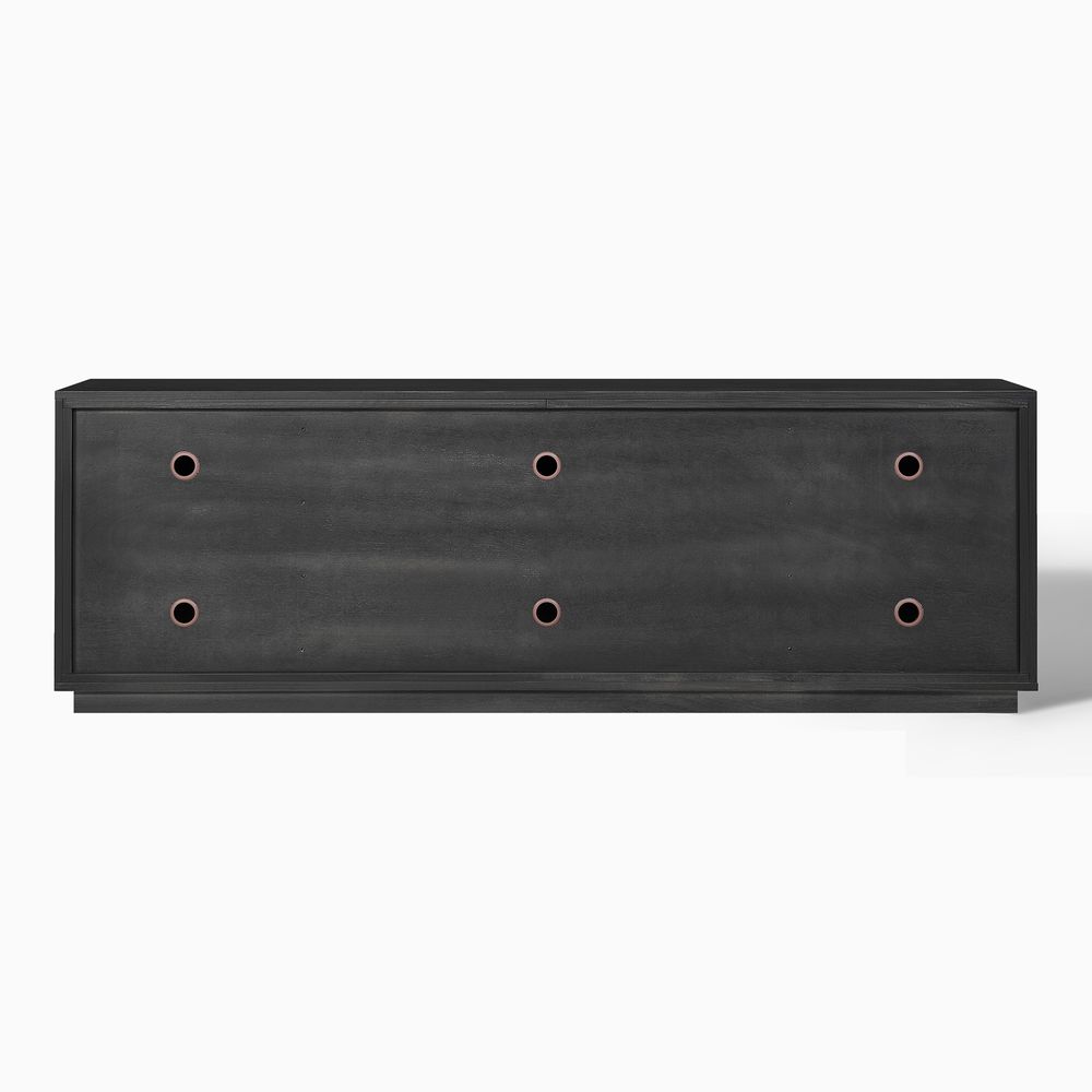 Crafted of solid wood and engineered wood with American oak veneers.All wood is kiln-dried for added durability.Finish is achieved through multistep process in which wood is wire brushed to highlight its rich grain.Solid wood blocks are used at structural joints for reinforcement.Designed for TVs up to 85", 6 cord cutouts in back panel for cable management.Color perception may vary due to wood characteristics, lighting, and devices. Wood grain variation is expected, as each is unique.